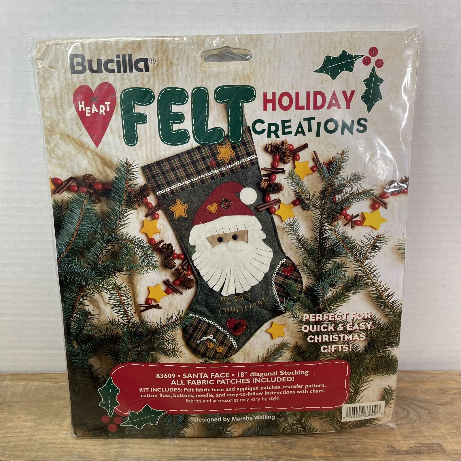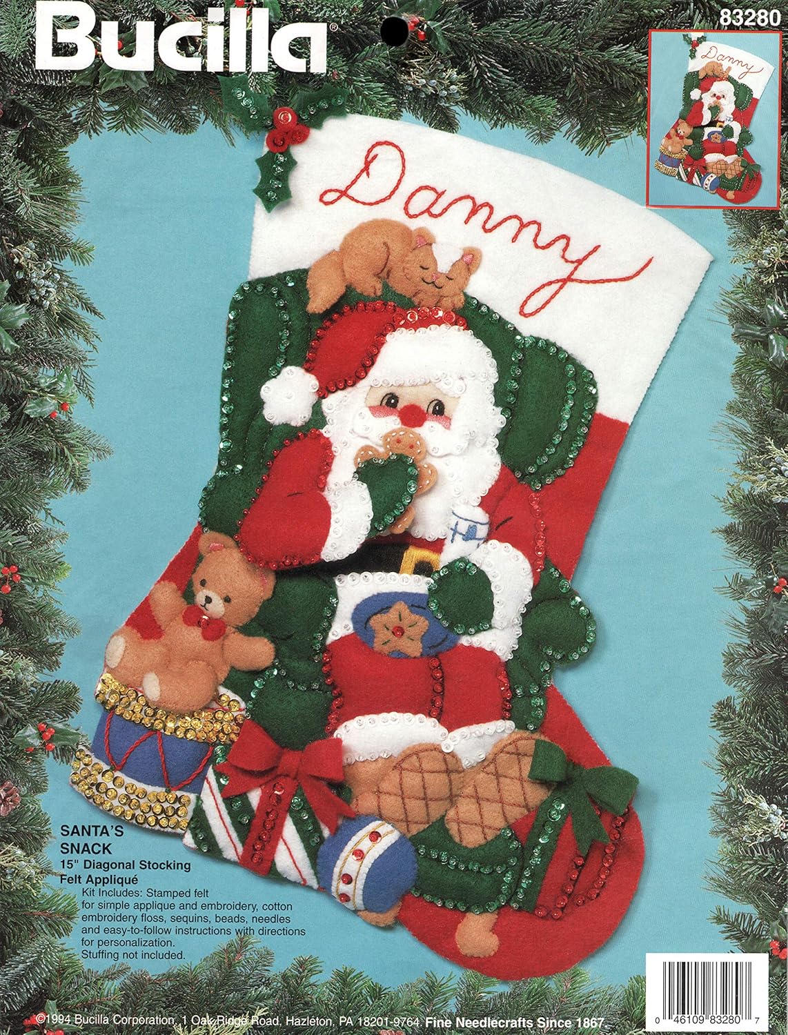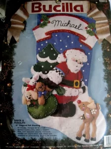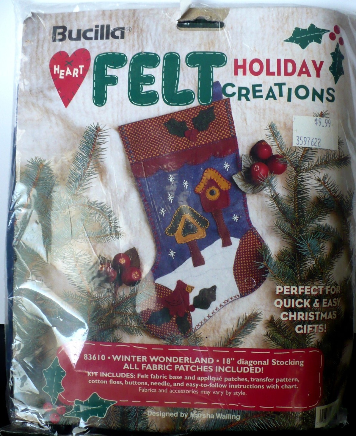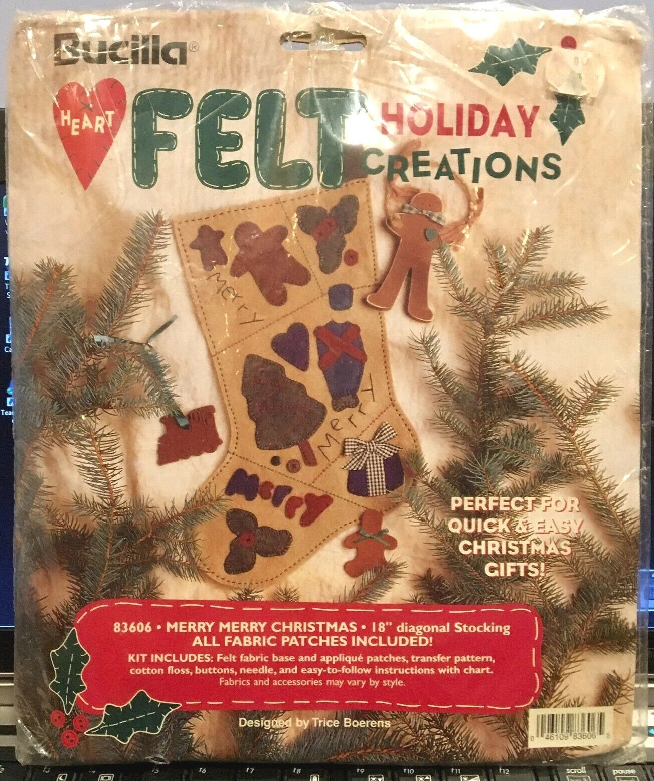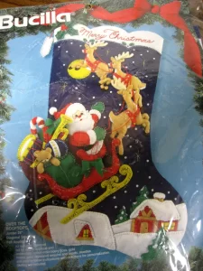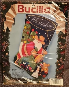 Merry Merry Christmas | 83606 | 1996? | 18″ | HeartFelt Holiday Creations Stocking kit. | ||