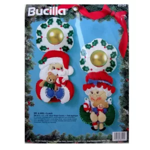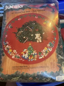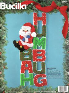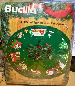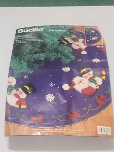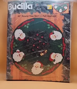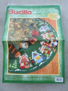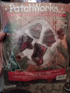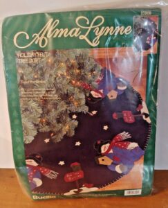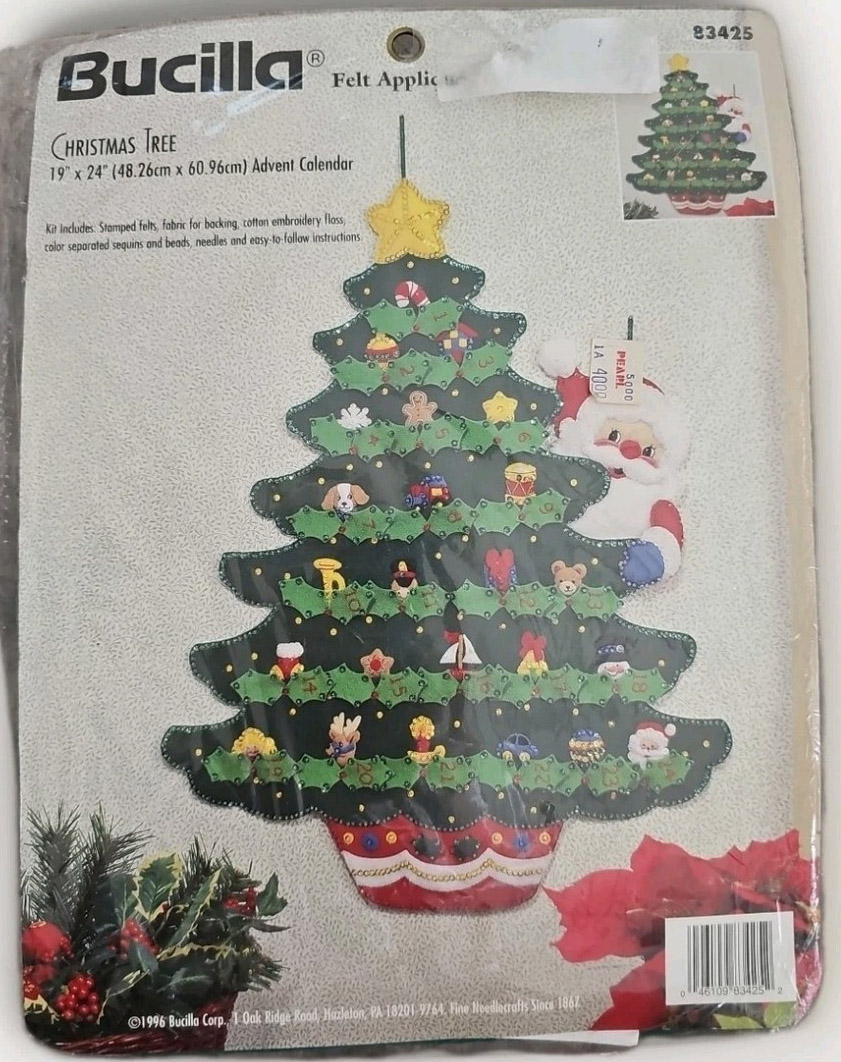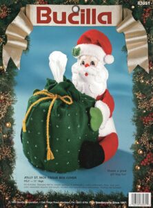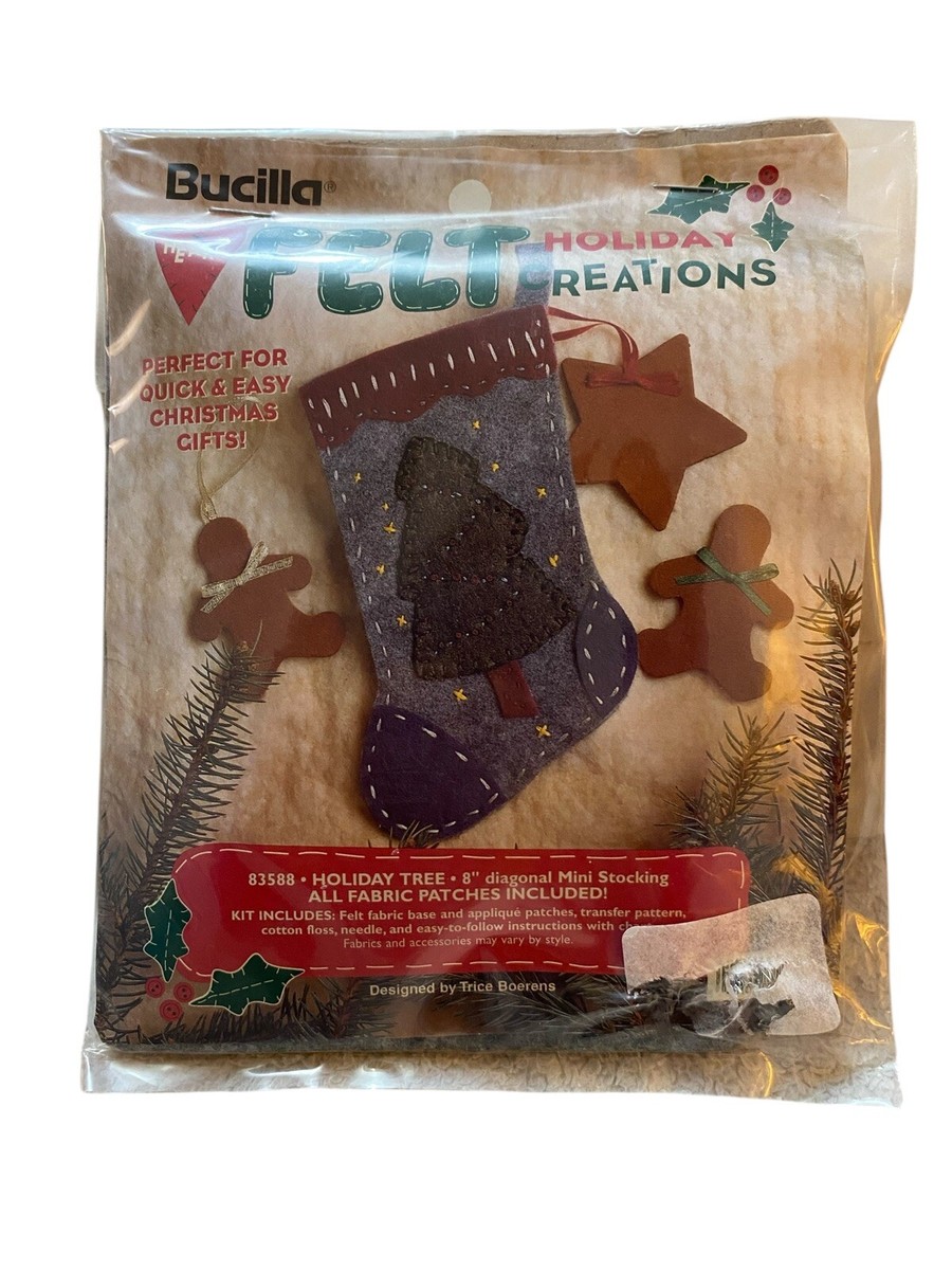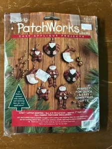 Trim-A-Tree | 83579 | 1996 | 3 1/2″ high | Set of 24 | Trice Boerens | PatchWorks kit. Bucilla “Trim A Tree” Felt Applique Christmas Ornaments Kit – Set of 24. kit contains fabric patches stamped with cutting and stitching lines for easy application, felt for backing, cotton floss, jute cord, buttons, needle, and easy to follow instructions with chart. Designed by Trice Boerens. 1996, Bucilla |