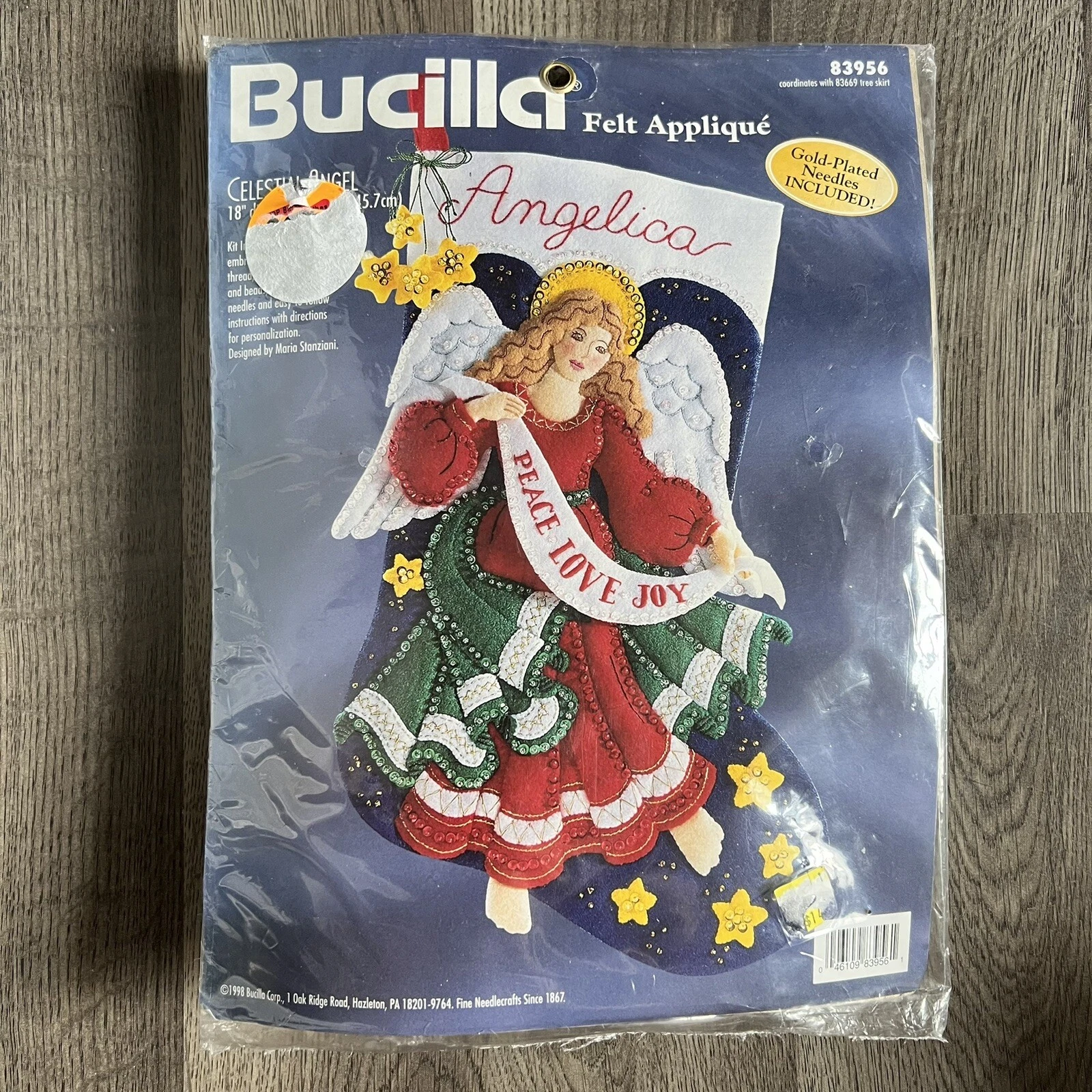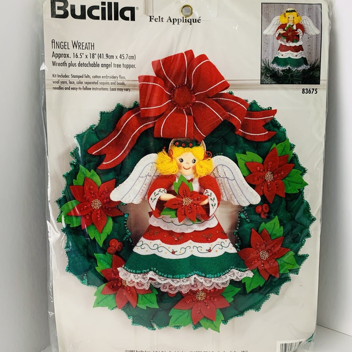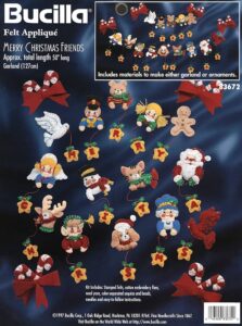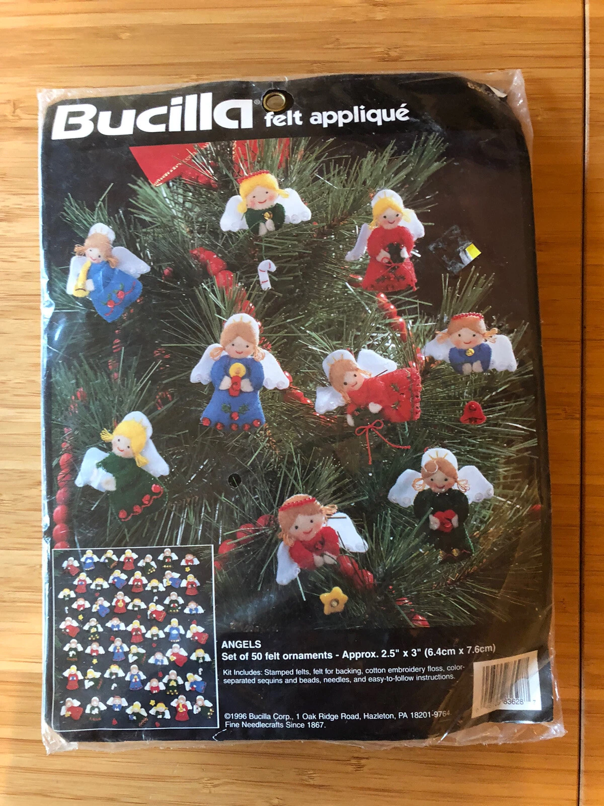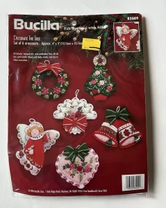 Angels | 83628 | 1996 | 2.5″ x 3″ | Set of 50 | Felt Applique Kit includes Stamped felts, felt for backing, ribbon, cotton embroidery floss, color-separated sequins and beads, needles, and easy to follow instructions. | |