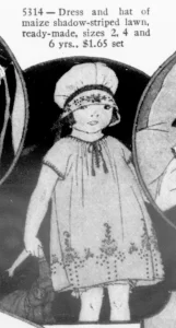 Advertised in Spring 1927 Style Book of Bucilla Embroidery Packages. 5612-Ready – Made Dress of Fine Quality, White Mercerized Sleeves and Bottom. Striped-Dimity, with Set-in Sleeves, and Novel Yoke. Sizes 6 Months and 1 Year. 5612-$1.25 |