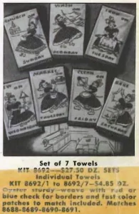 Advertised in Spring 1927 Style Book of Bucilla Embroidery Packages. Ready-Made Play-Apron. HAND – Tinted in Gay Colors on Durable Unbleached Muslin and Edged with Blue Binding All Around. Celluloid Fish Included. 2 Yr. and 4 Yr. 5622-$1.00 |