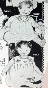 Advertised in Spring 1927 Style Book of Bucilla Embroidery Packages. 5606-Ready-Made Dress Infants’ Size-21-Inch Long OF Fine Quality, White Mercerized Batiste, with Set-in Sleeves and Novel Inverted Plaits. 5606-$1.15 |