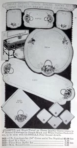 Date printed on fabric. 3pc Vanity set sampler. Set consists of embroidered dresser scarf, chifforobe scarf and pin cushion. “To preserve the beauty of this piece, wash with Ivory Soap” The entire piece measures 35 in x 45 in. |