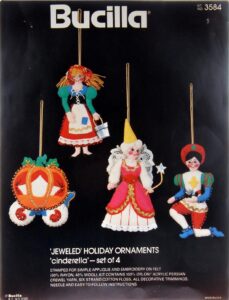 Cinderella 3584 1979 Set of 4 Ornaments are: Cinderella, the Fairy Godmother, Pumpkin Coach and the Prince