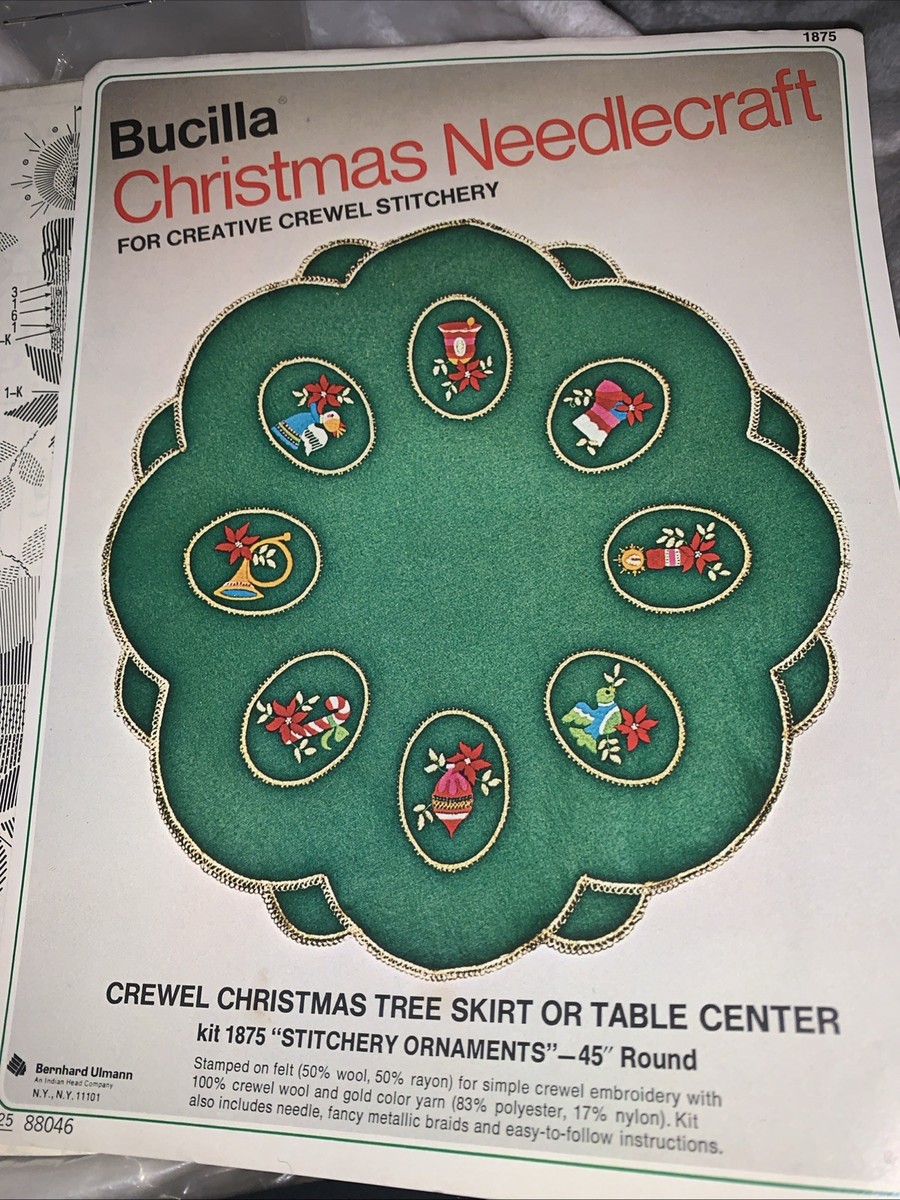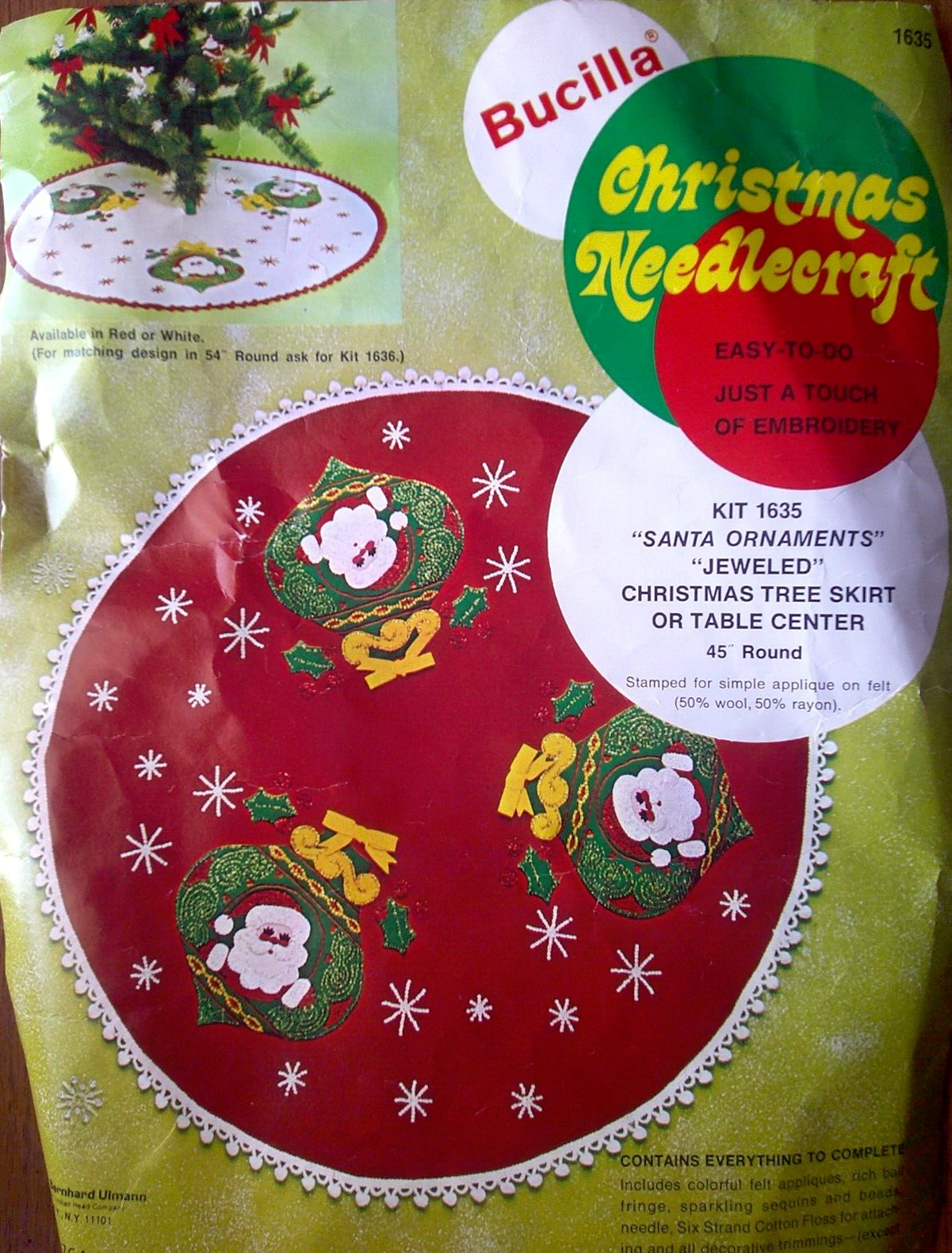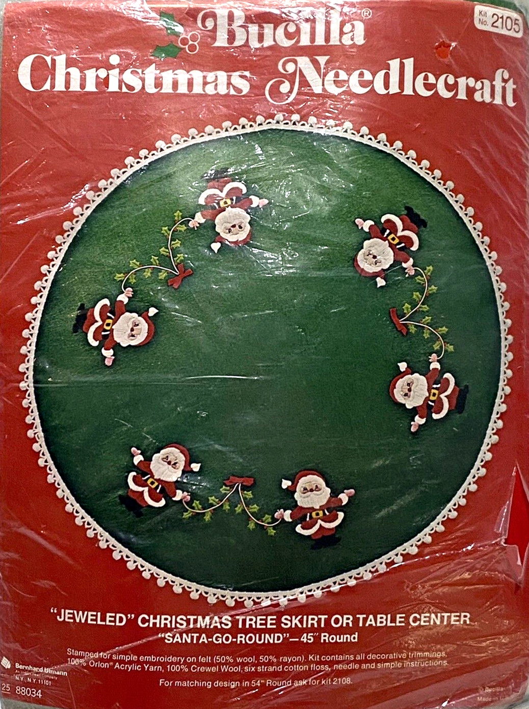 ‘wreaths’- 45″ (114.3 cm.) round, STAMPED FOR SIMPLE APPLIQUE ON FELT (60% RAYON, 40% WOOL). KIT CONTAINS SIX STRAND COTTON FLOSS, ALL DECORATIVE TRIMMINGS, NEEDLE AND EASY-TO-FOLLOW INSTRUCTIONS. FOR MATCHING DESIGN IN 54″ (137.2 cm.) ROUND, ASK FOR KIT NO. 3578.
