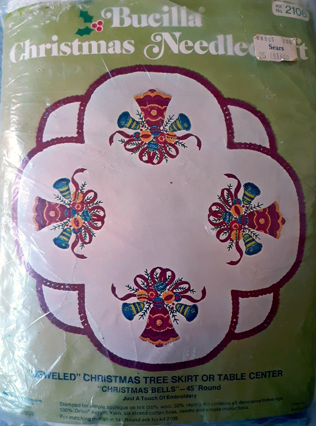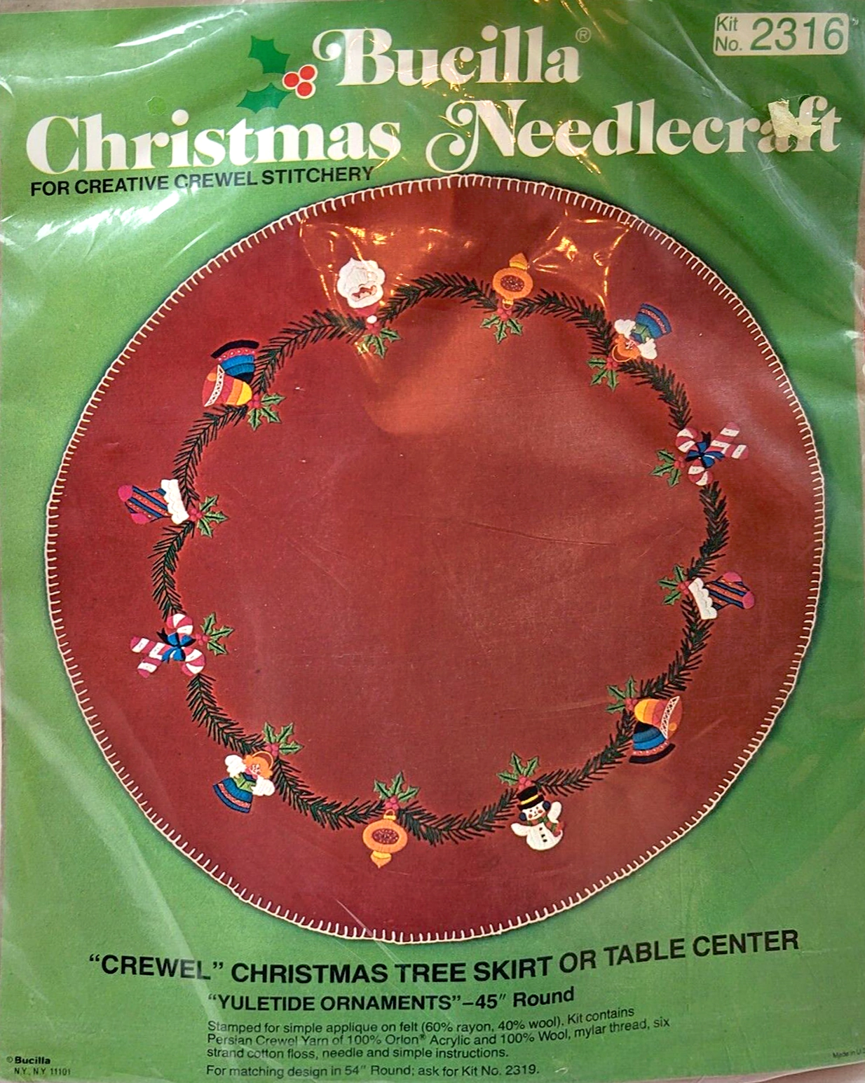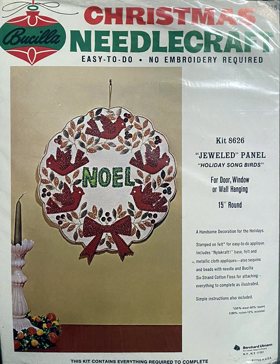 ‘wreaths’- 45″ (114.3 cm.) round, STAMPED FOR SIMPLE APPLIQUE ON FELT (60% RAYON, 40% WOOL). KIT CONTAINS SIX STRAND COTTON FLOSS, ALL DECORATIVE TRIMMINGS, NEEDLE AND EASY-TO-FOLLOW INSTRUCTIONS. FOR MATCHING DESIGN IN 54″ (137.2 cm.) ROUND, ASK FOR KIT NO. 3578.