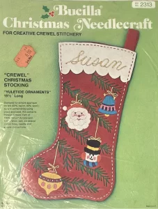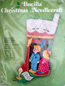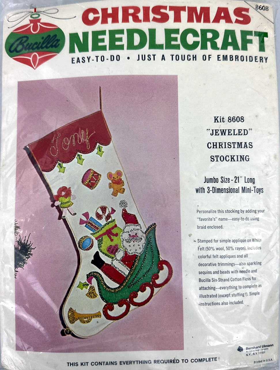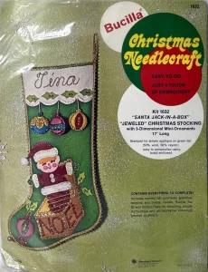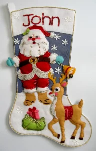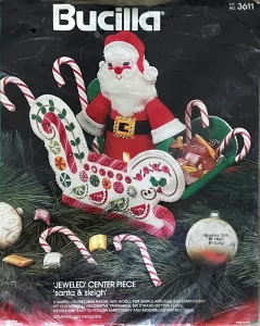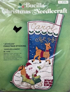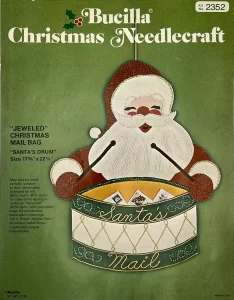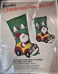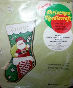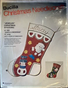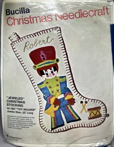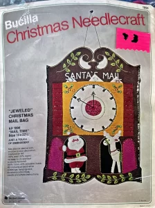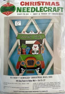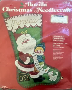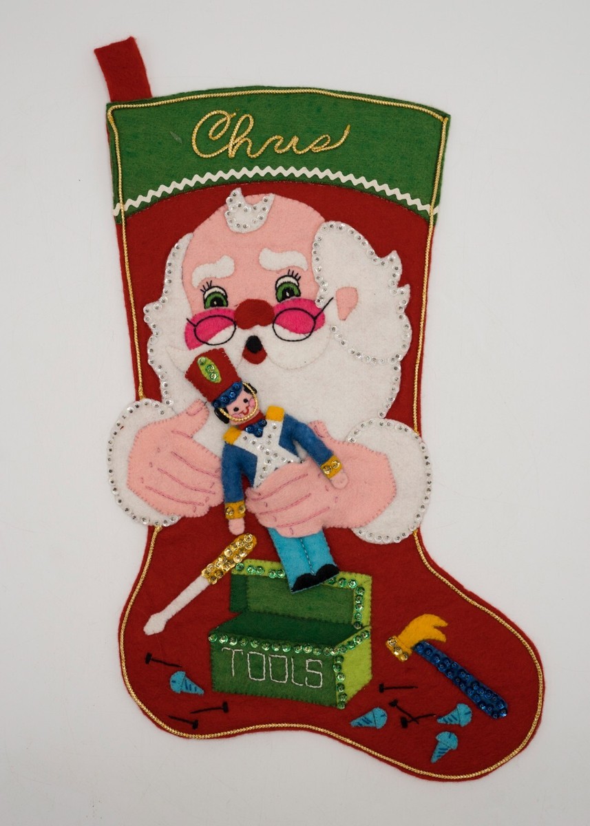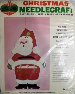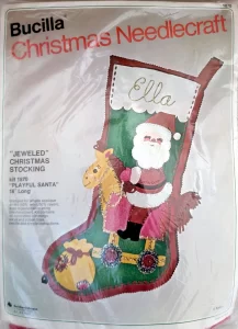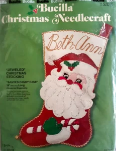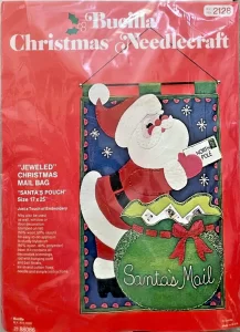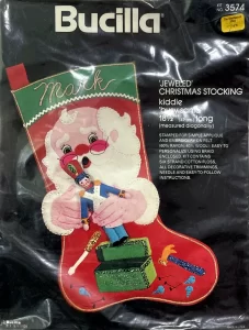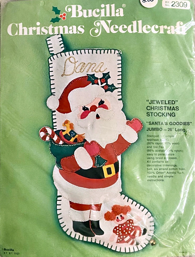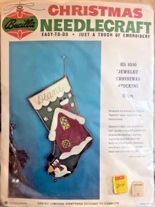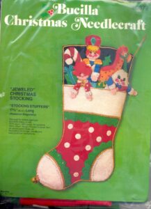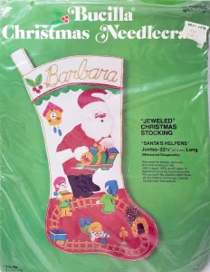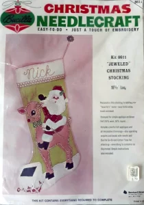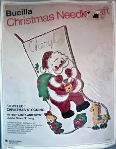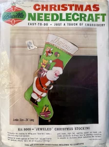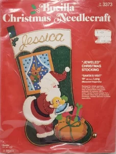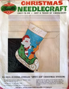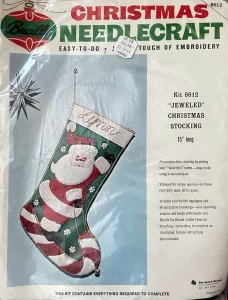 Jeweled Christmas Stocking 8008 1970 24″ long Jumbo stocking kit. Santa with toy sack themed.