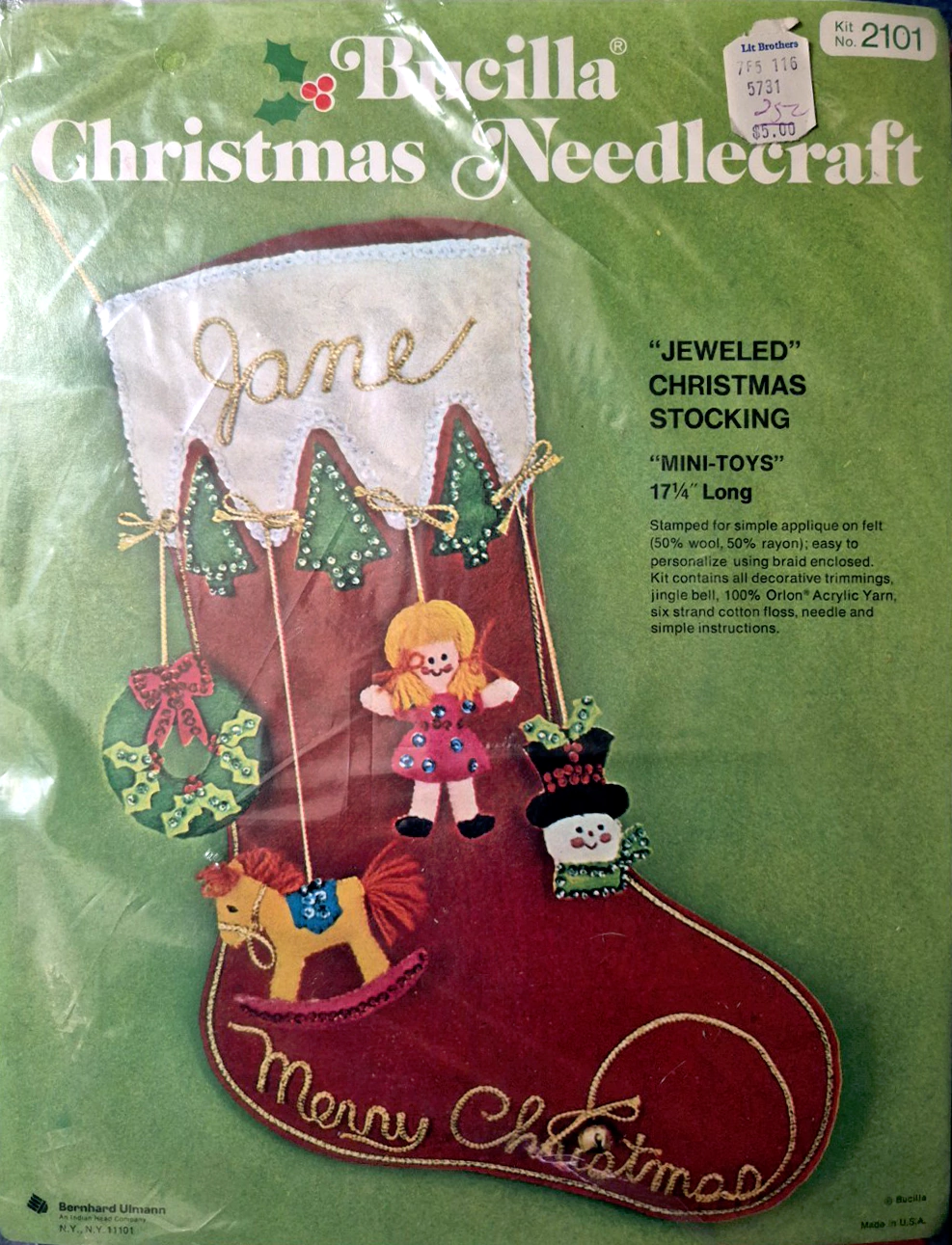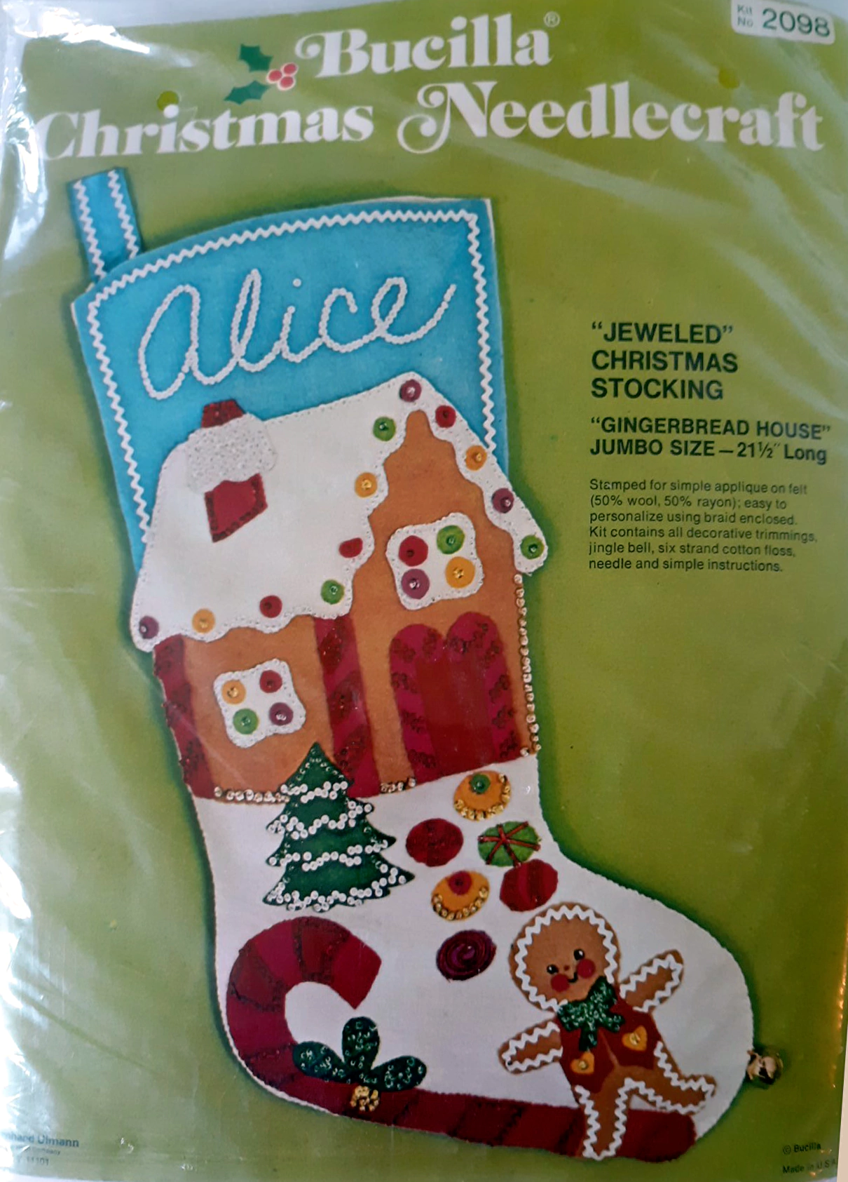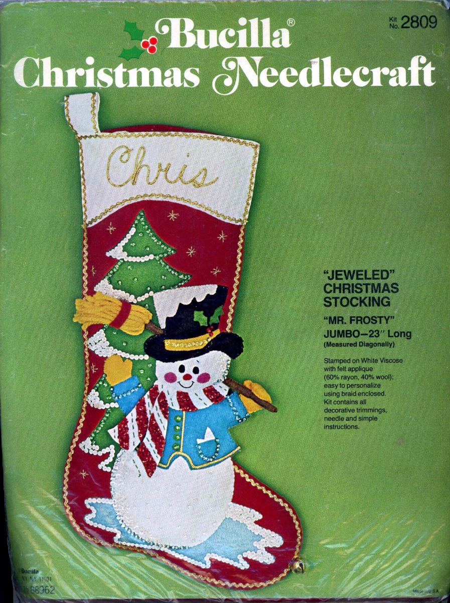 Jeweled Christmas stocking 8009 1970 24″ long Jumbo stocking kit. Bells themed.