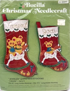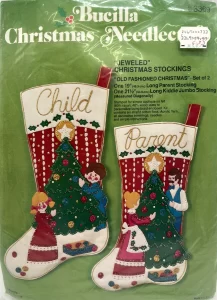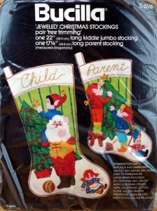 Bucilla ‘JEWELED’ CHRISTMAS STOCKINGS pair tree trimming’ one 22″ (55.9 cm.) long kiddie jumbo stocking one 171/4″ (43.8 cm.) long parent stocking (measured diagonally)