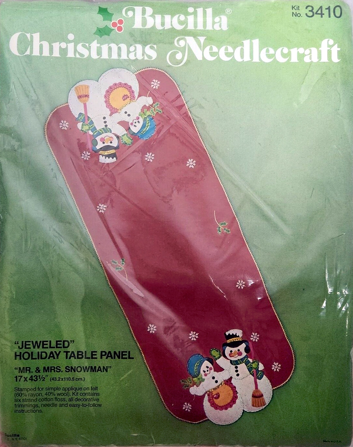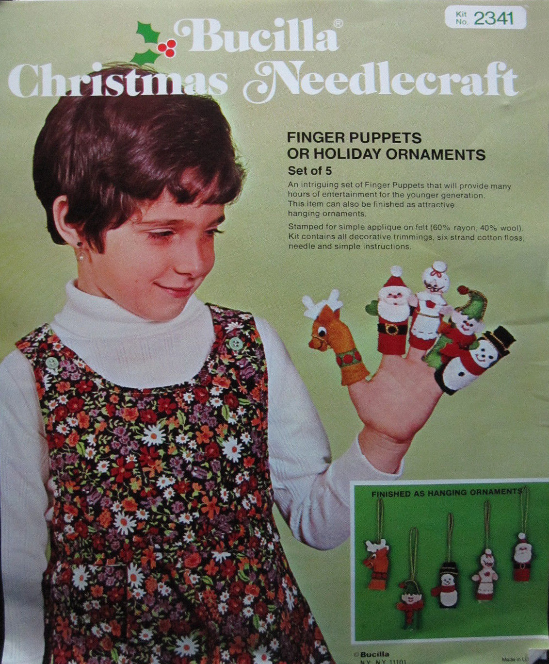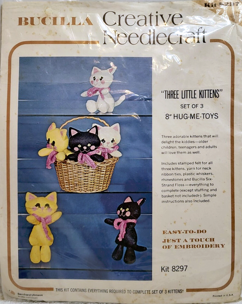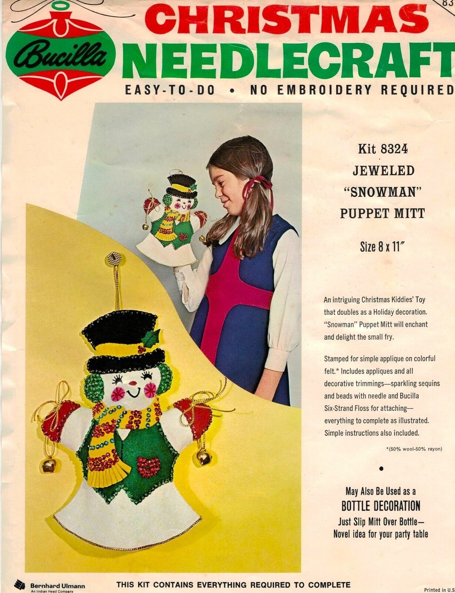 STAMPED FOR SIMPLE APPLIQUE AND EMBROIDERY ON FELT (60% RAYON, 40% WOOL). KIT CONTAINS 100, ACRYLIC YARNS, SIX STRAND COTTON FLOSS, ALL DECORATIVE TRIMMINGS, NEEDLE, AND EASY-TO FOLLOW INSTRUCTIONS