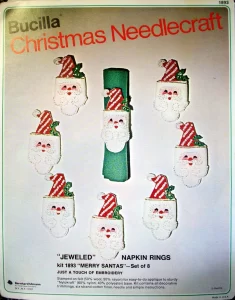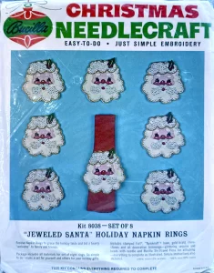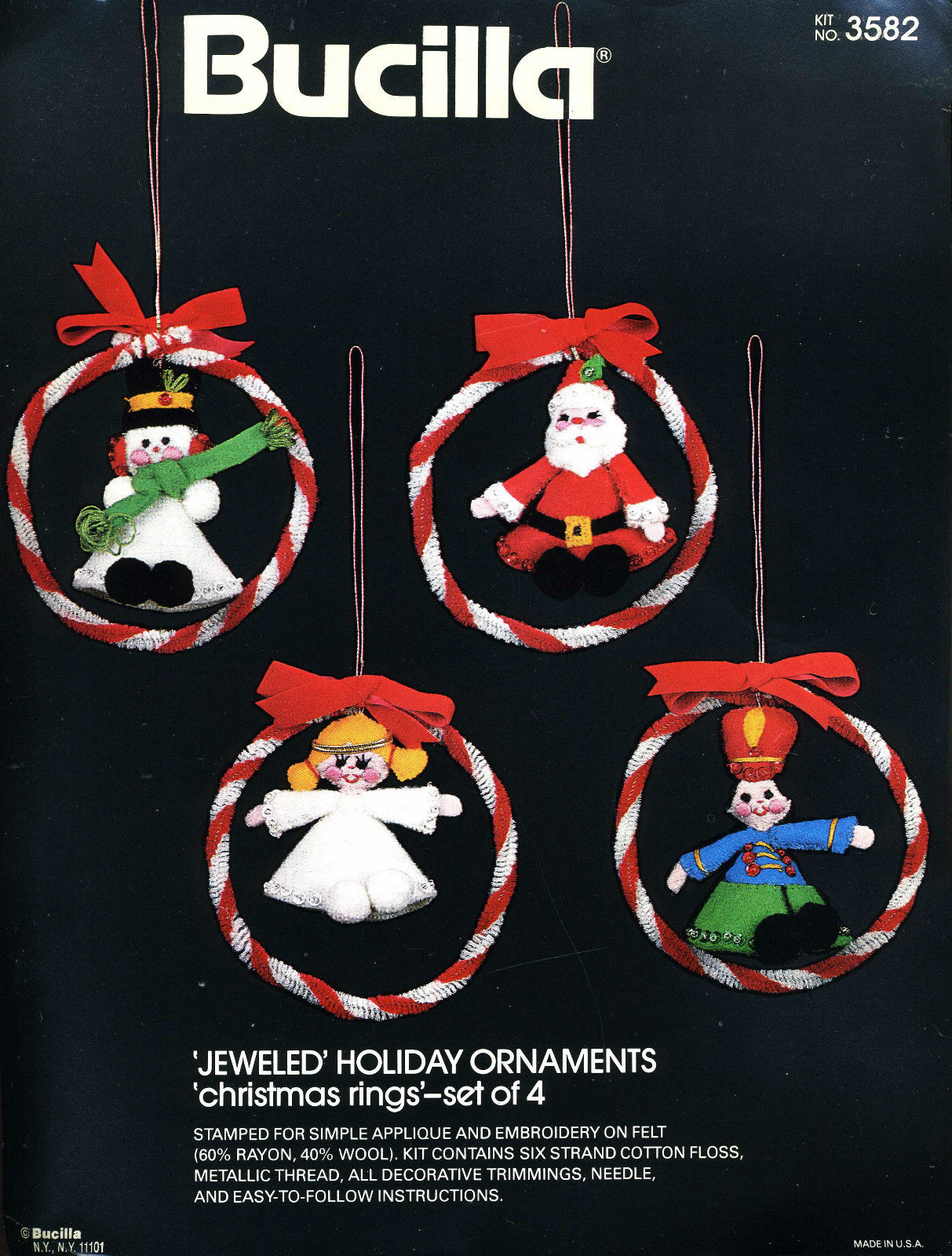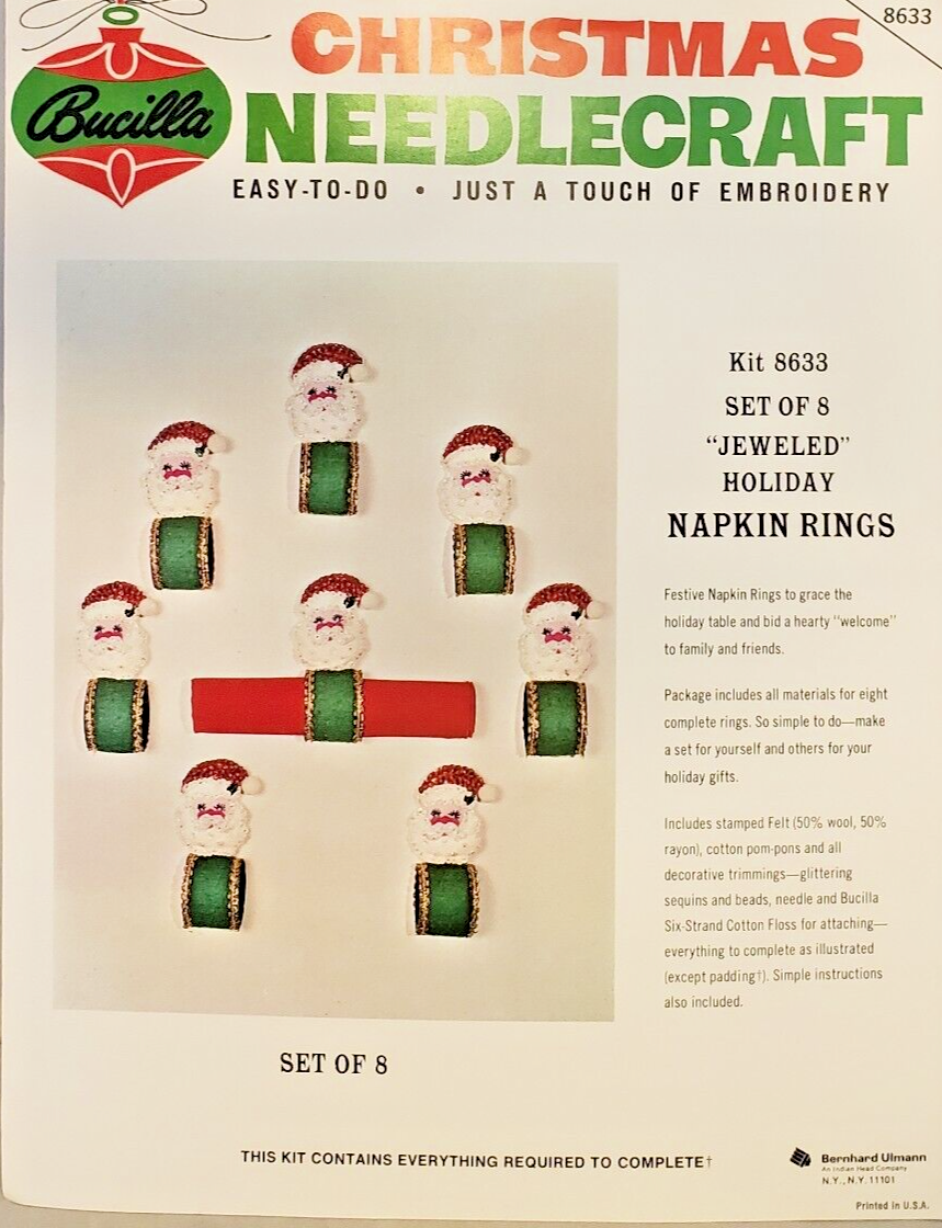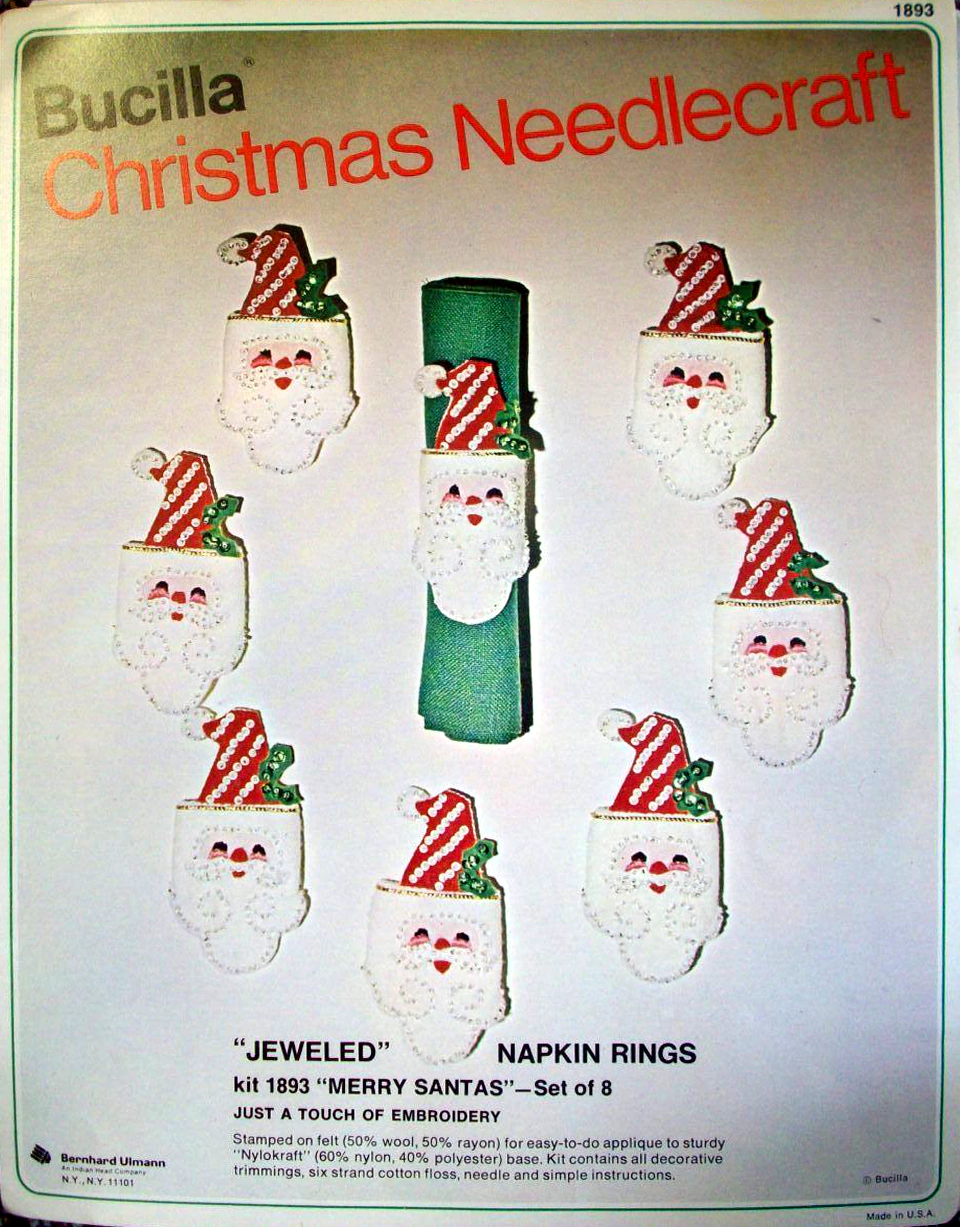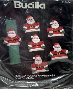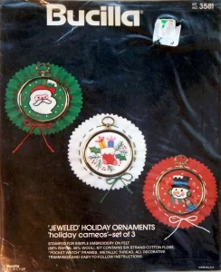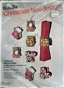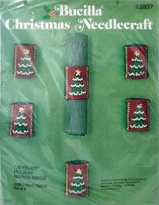 Christmas Rings 3582 1979 Set of4 Stamped Design on Felt; 6-Strand Cotton Floss; Metallic Thread; Decorative Trimmings; Needle; and Instructions.