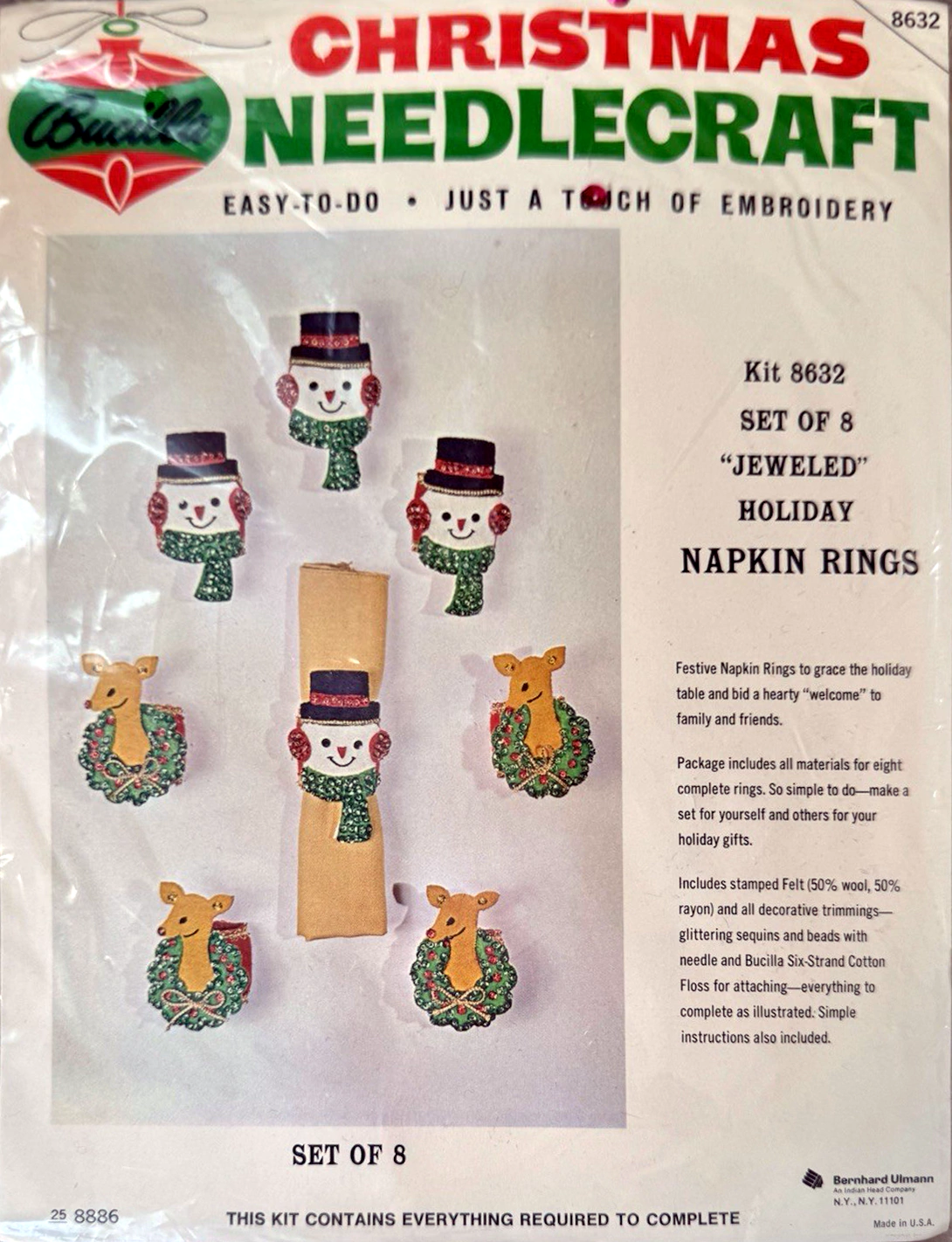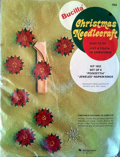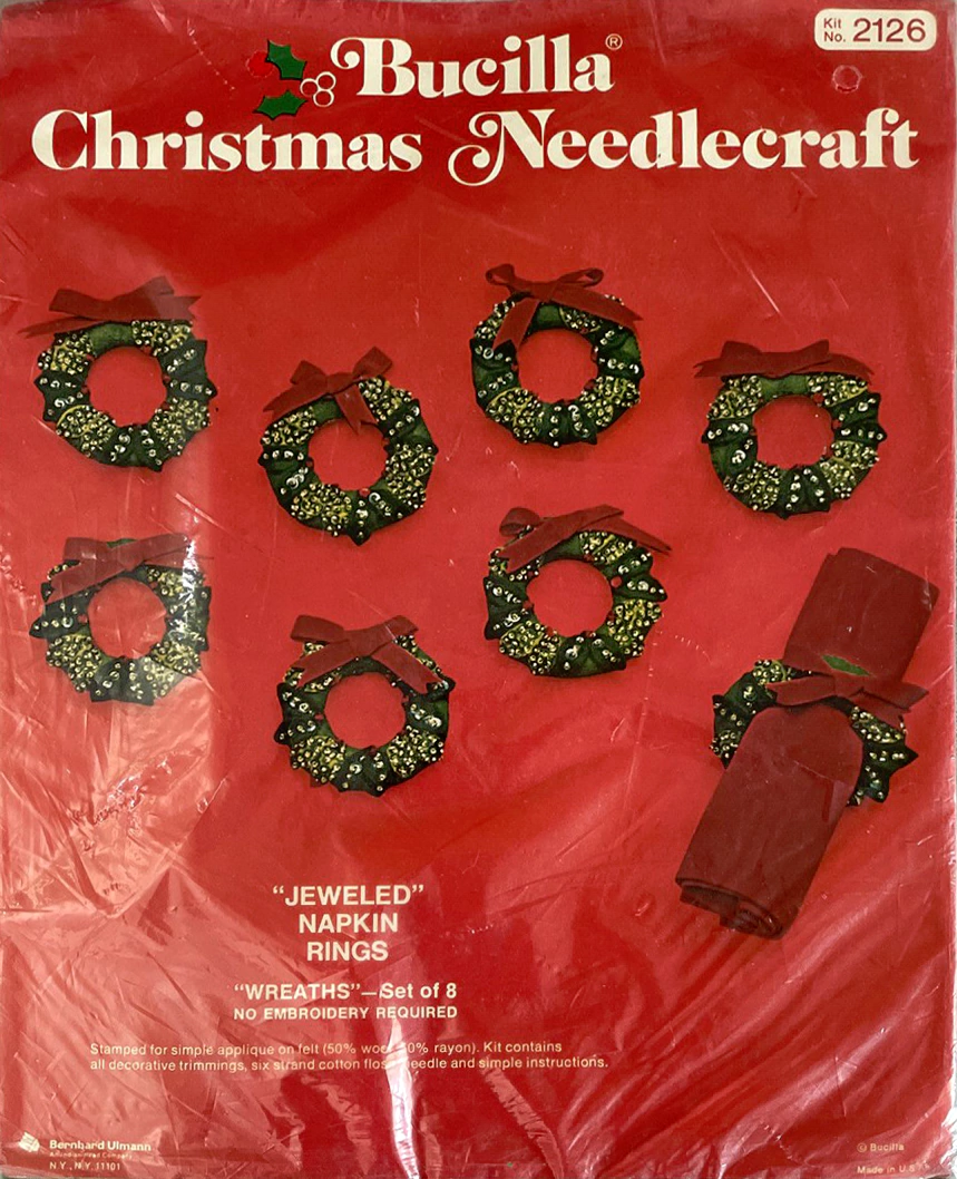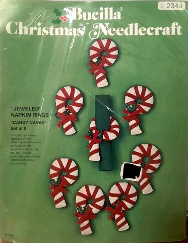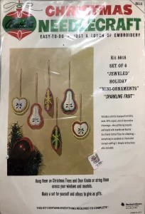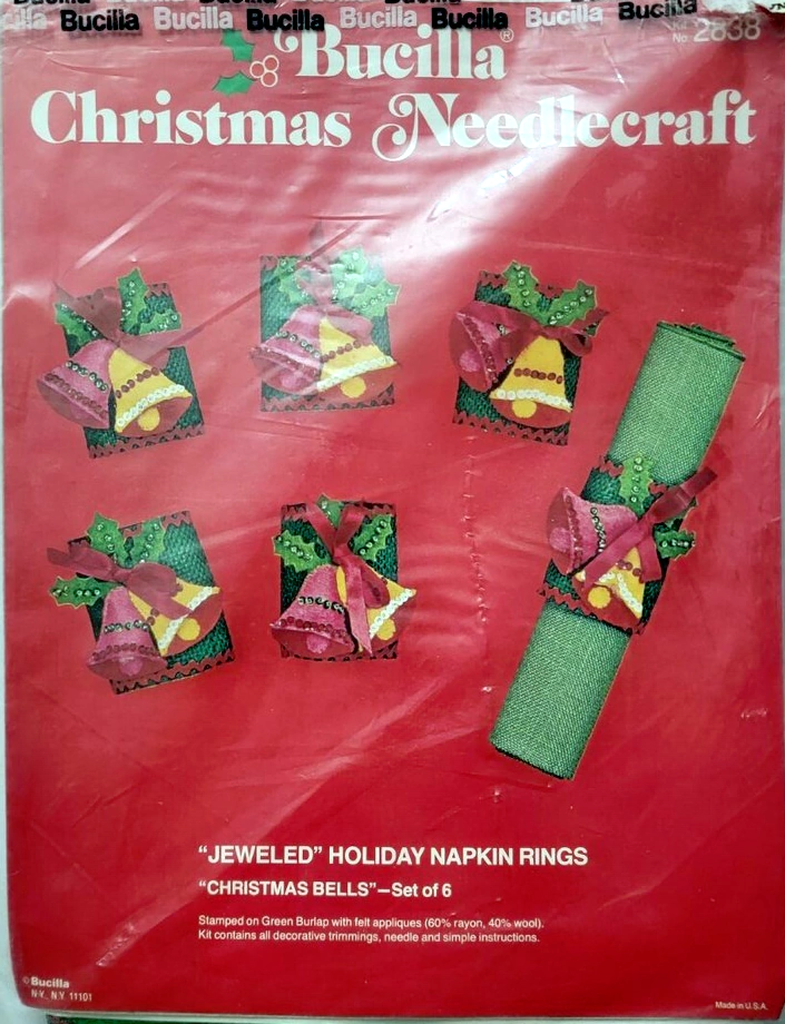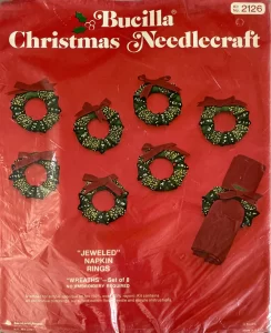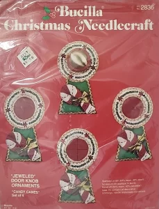 Christmas Rings 3582 1979 Set of4 Stamped Design on Felt; 6-Strand Cotton Floss; Metallic Thread; Decorative Trimmings; Needle; and Instructions.