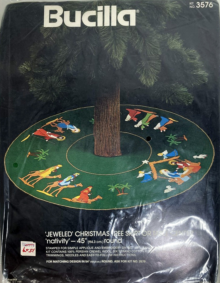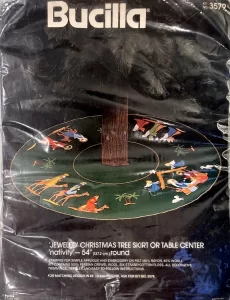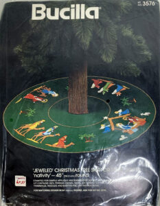 Nativity 3576 1979? 45″ Jeweled Christmas tree skirt. Also re-released in red as kit 48985.