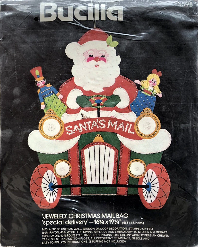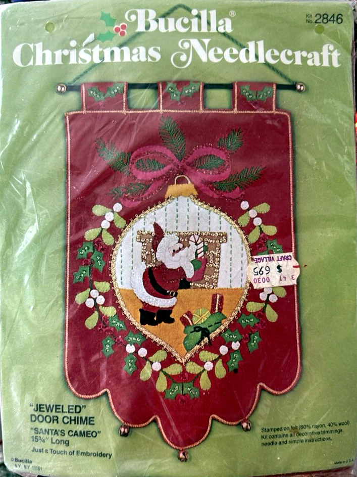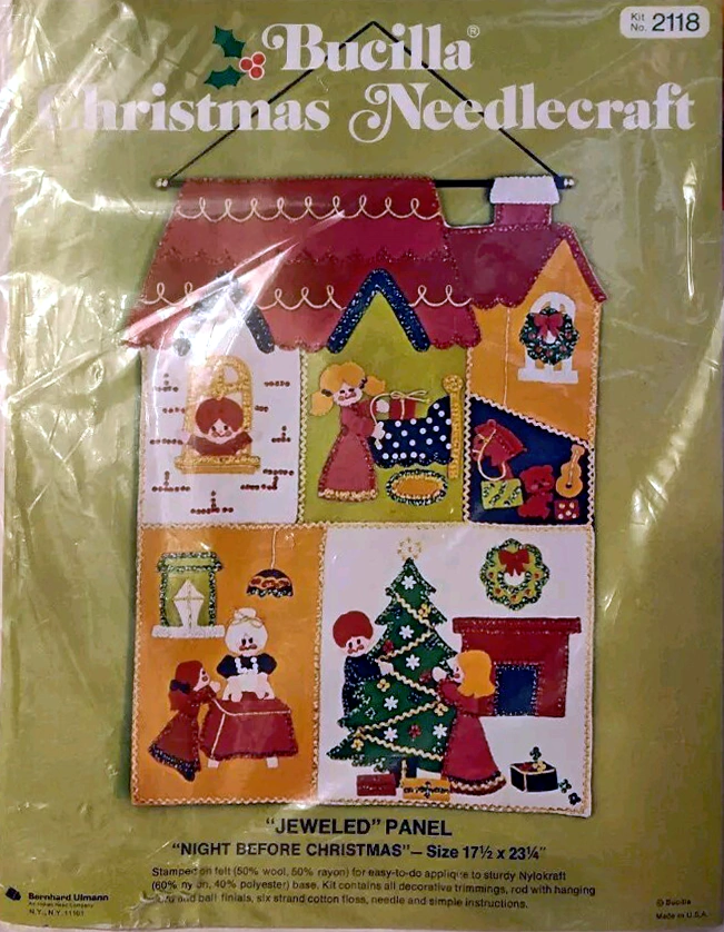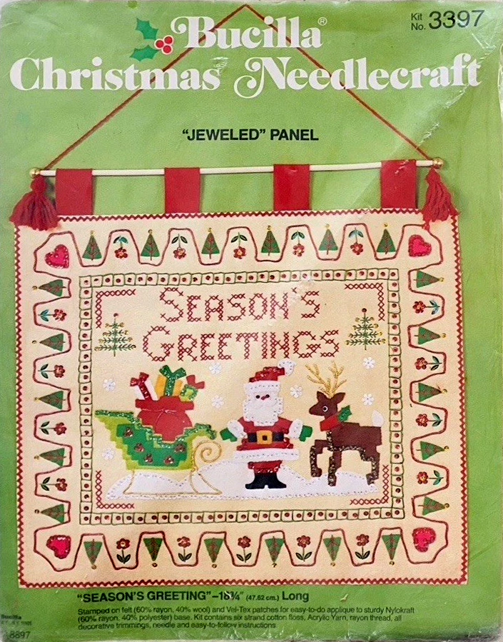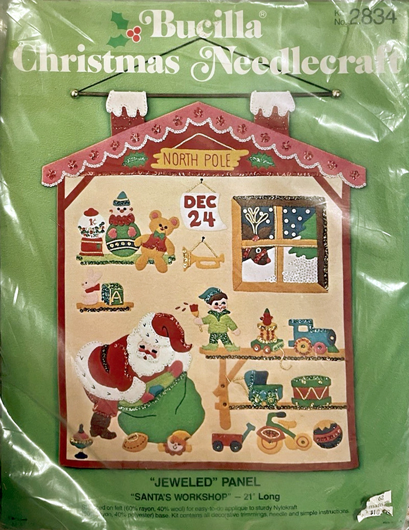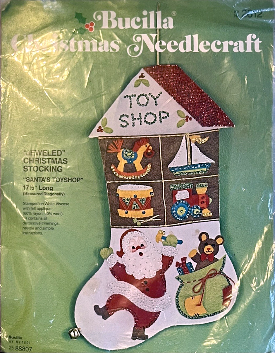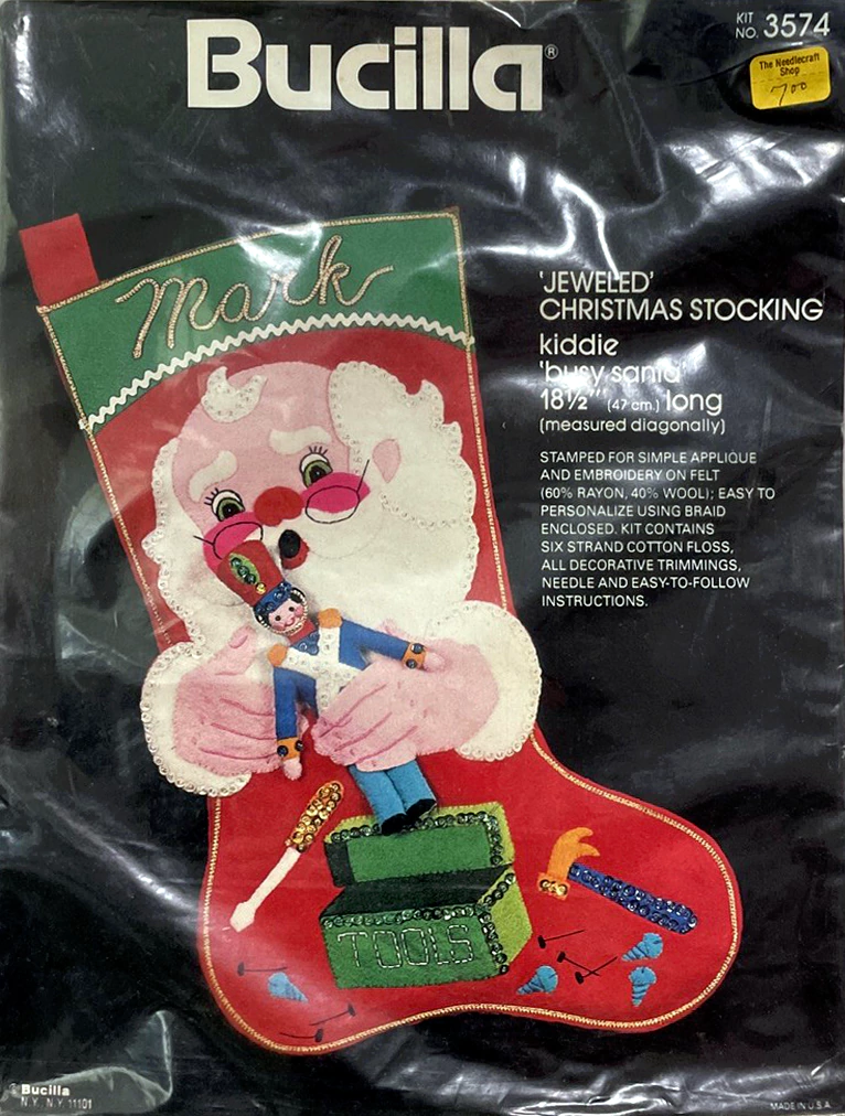 Santa & Helpers 3586 1979 Kit contains stamped felt (60% rayon / 40% wool), 100% Persian crewel wool, six strand cotton floss, all decorative trimmings, needle and easy-to-follow instructions.