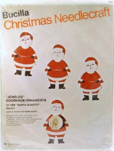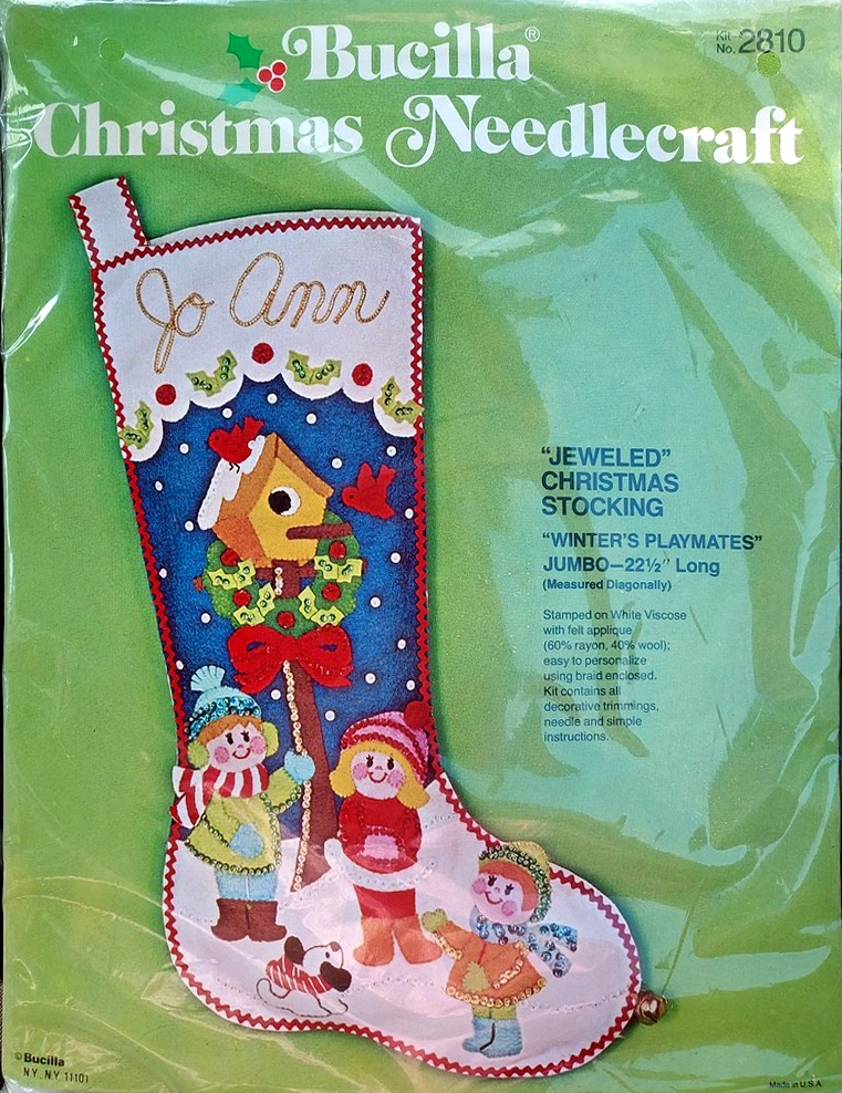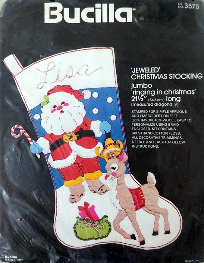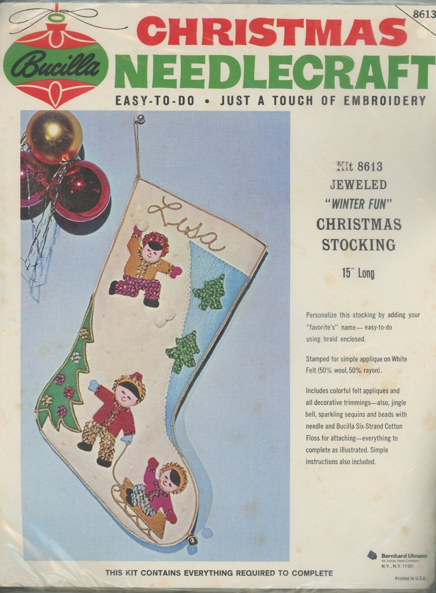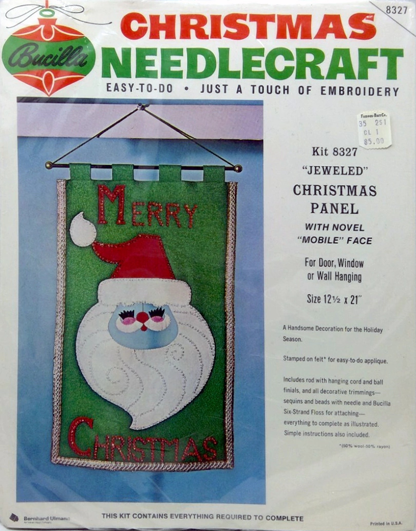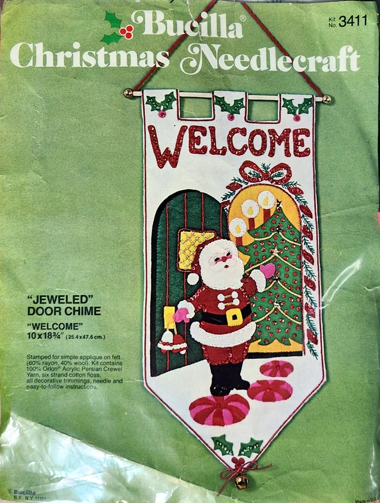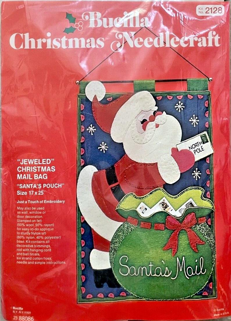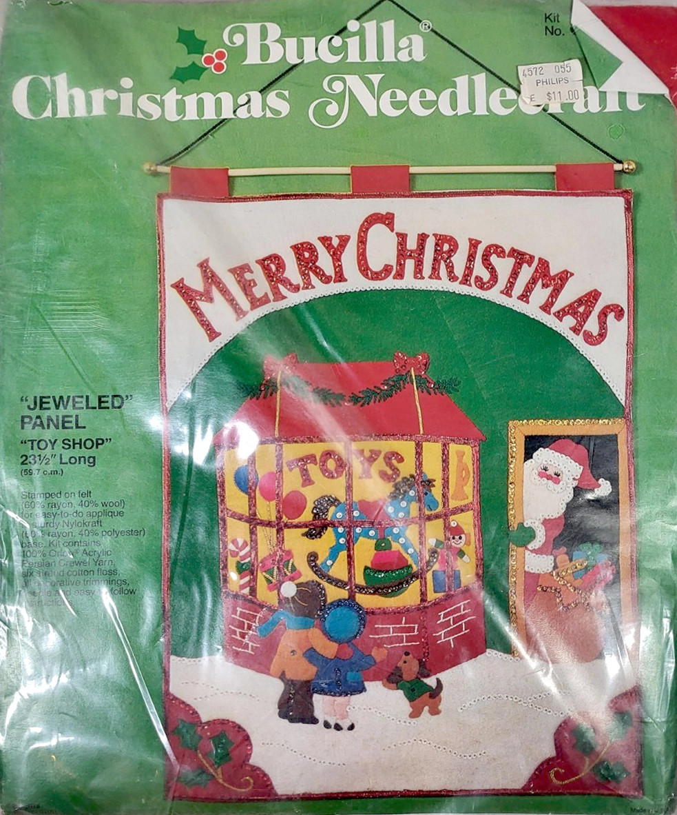 Santa & Helpers 3586 1979 Kit contains stamped felt (60% rayon / 40% wool), 100% Persian crewel wool, six strand cotton floss, all decorative trimmings, needle and easy-to-follow instructions.