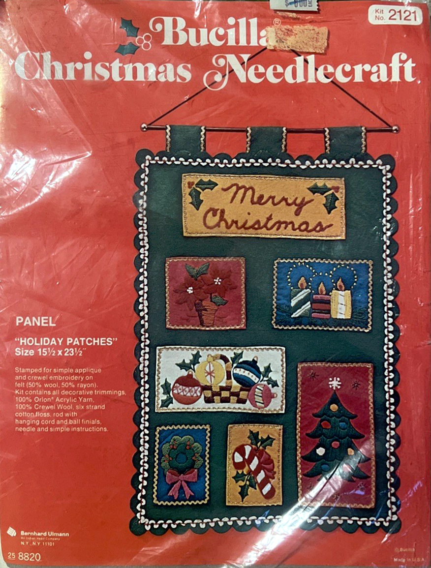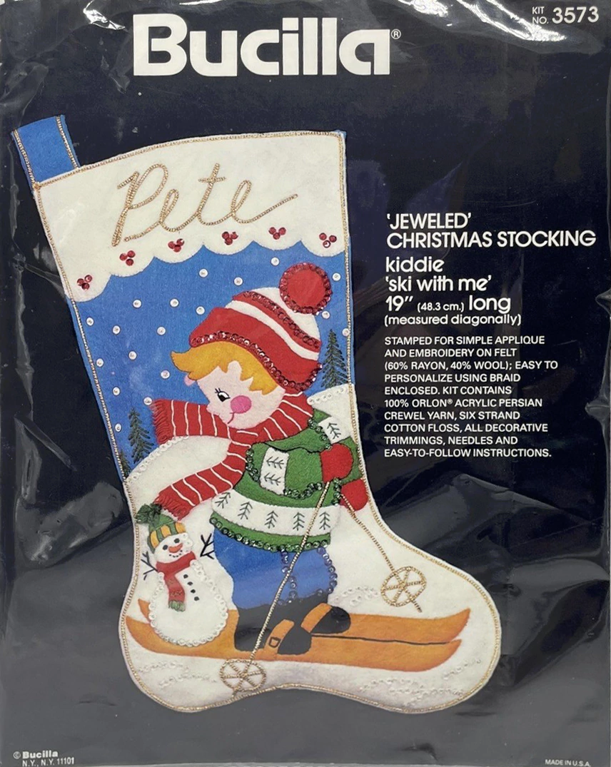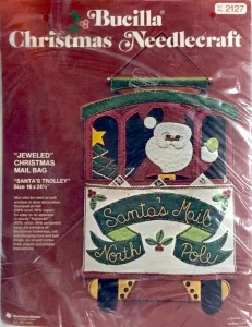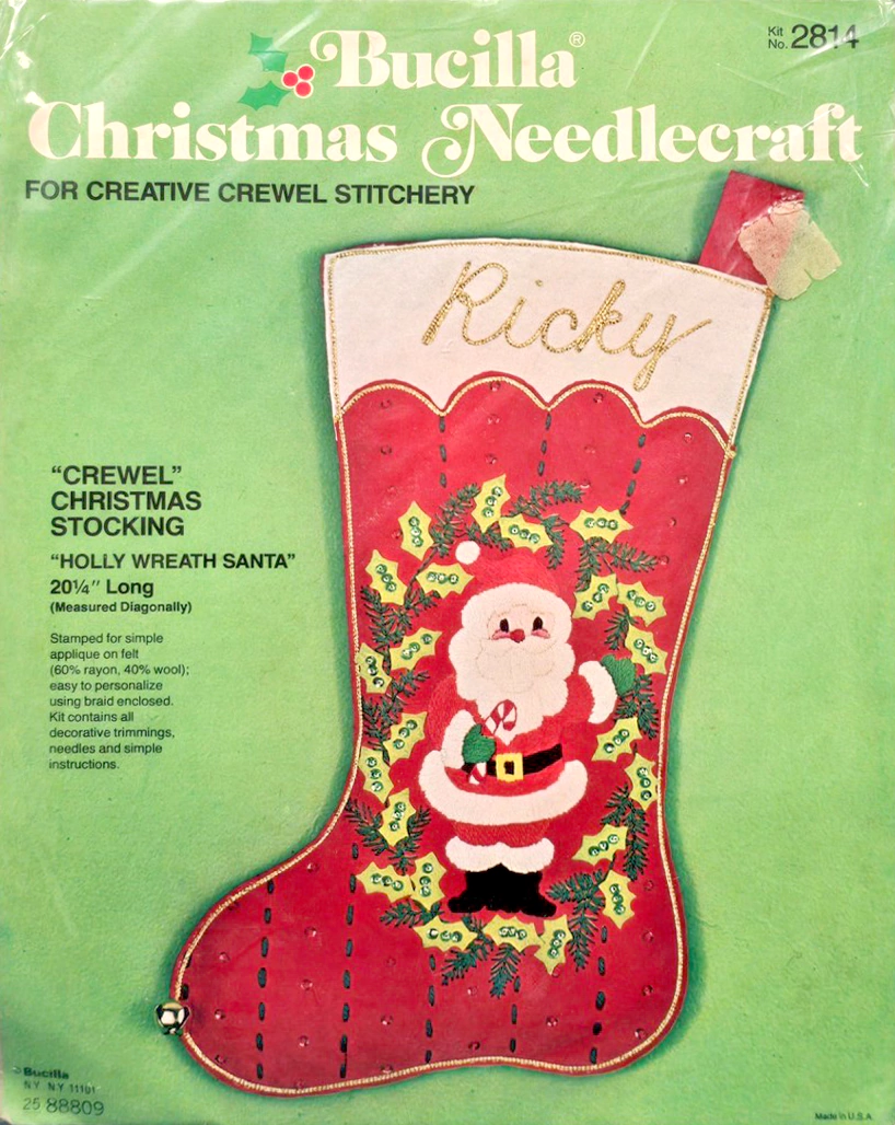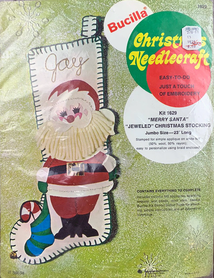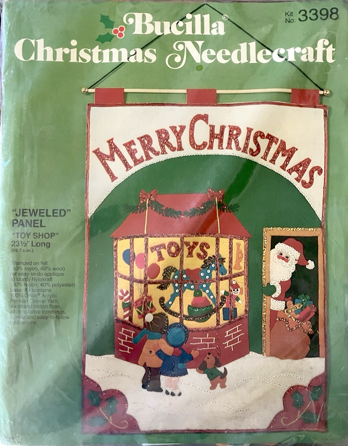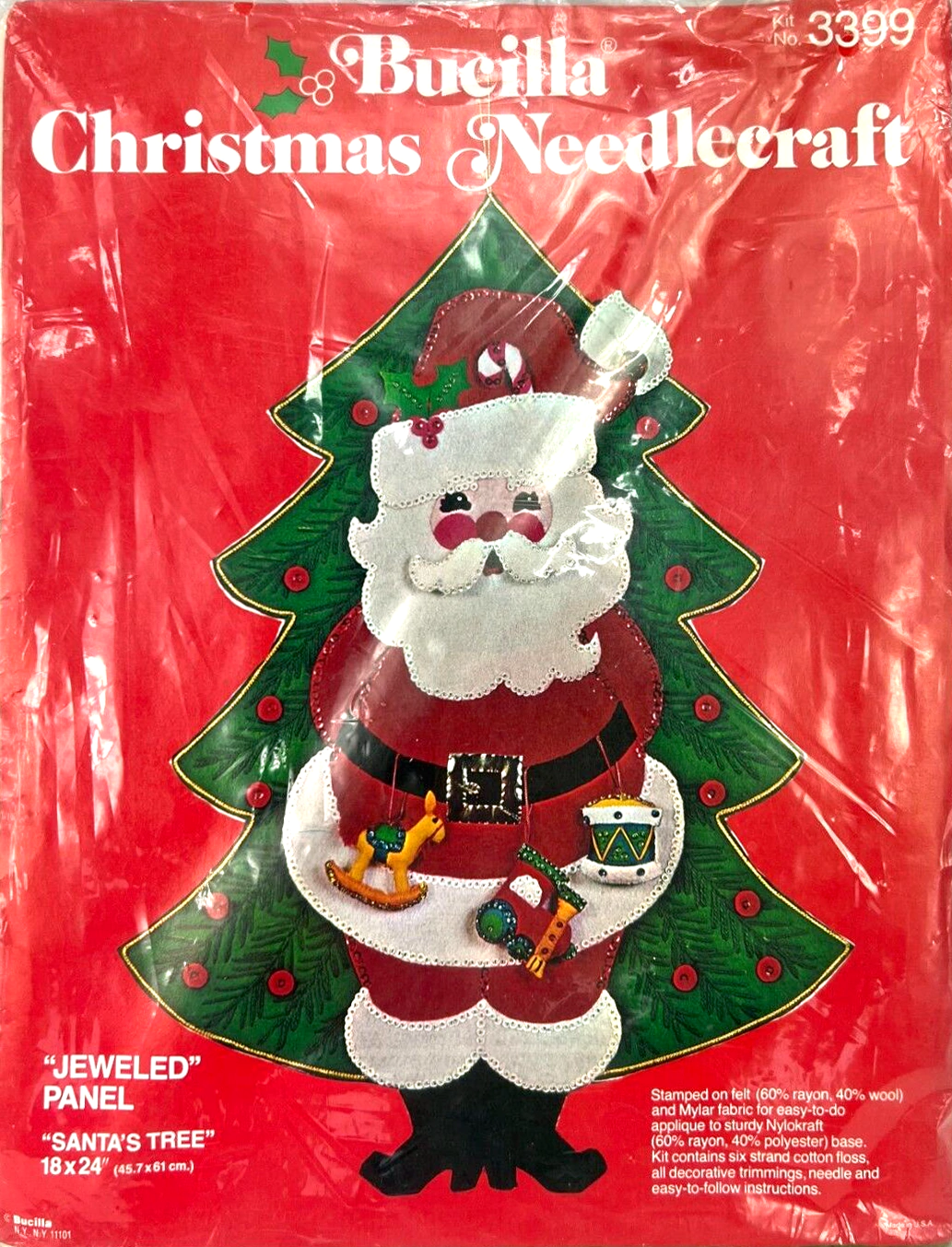Santa & Helpers 3586 1979 Kit contains stamped felt (60% rayon / 40% wool), 100% Persian crewel wool, six strand cotton floss, all decorative trimmings, needle and easy-to-follow instructions.