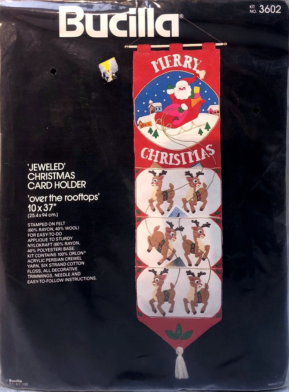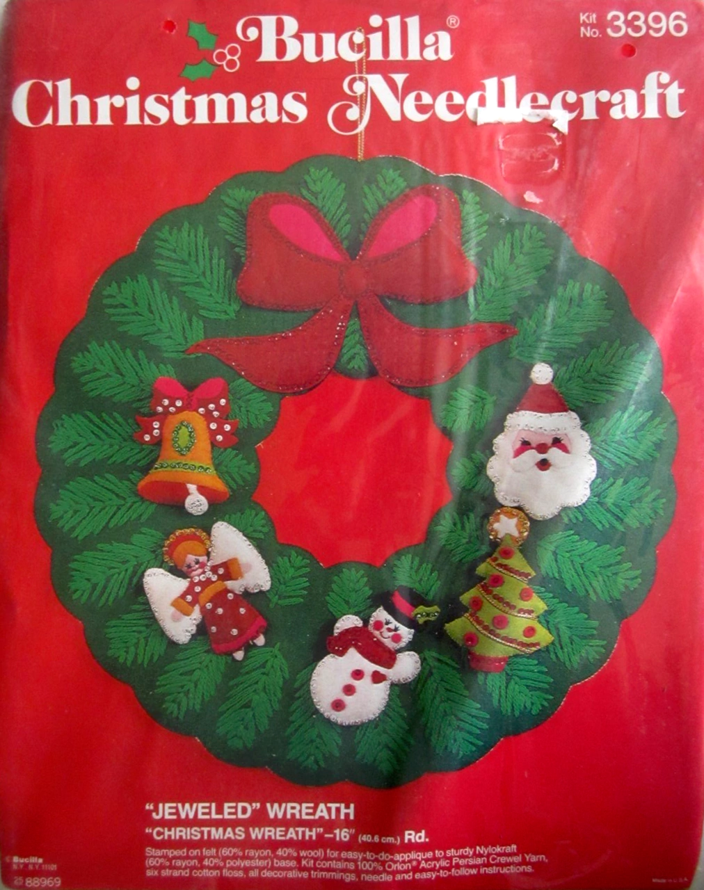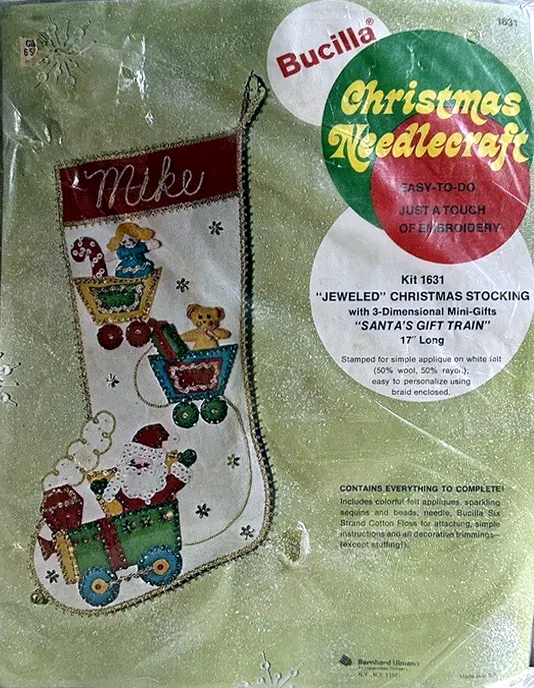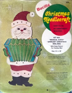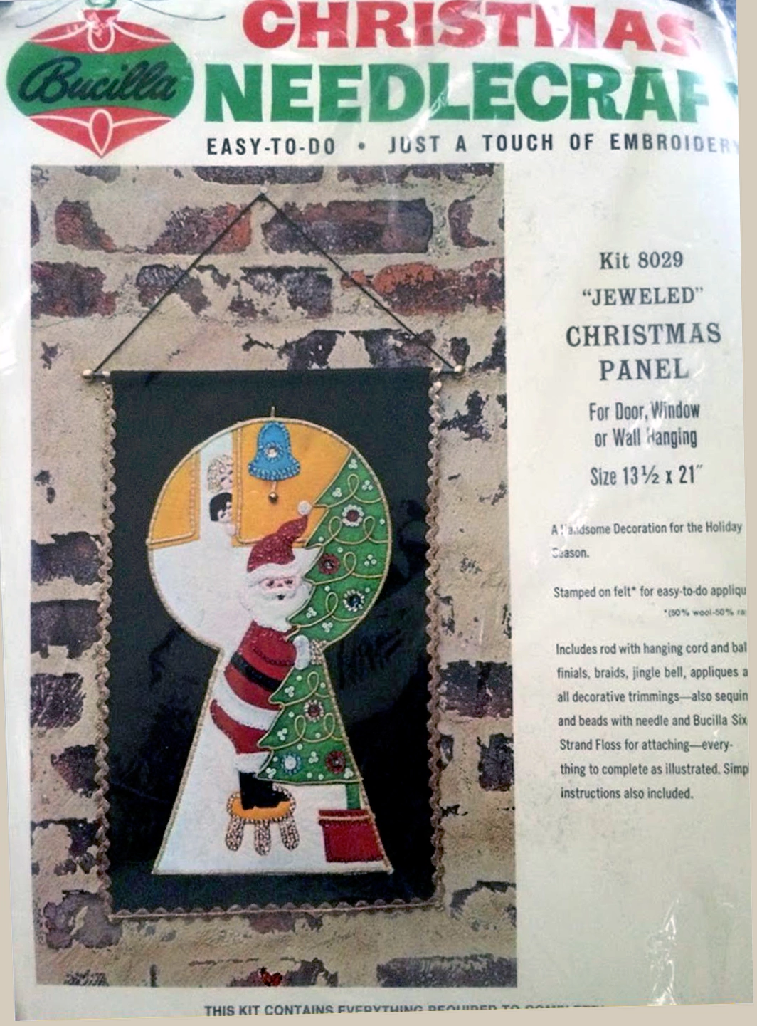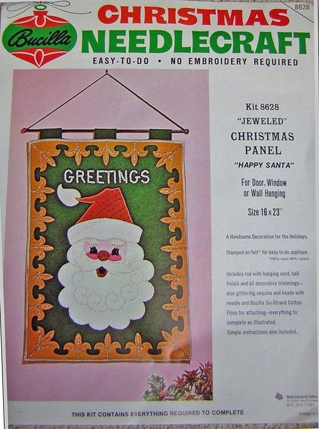 Santa & Helpers 3586 1979 Kit contains stamped felt (60% rayon / 40% wool), 100% Persian crewel wool, six strand cotton floss, all decorative trimmings, needle and easy-to-follow instructions.