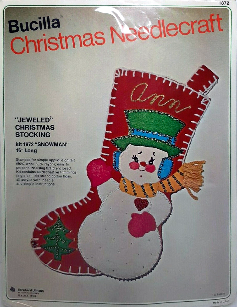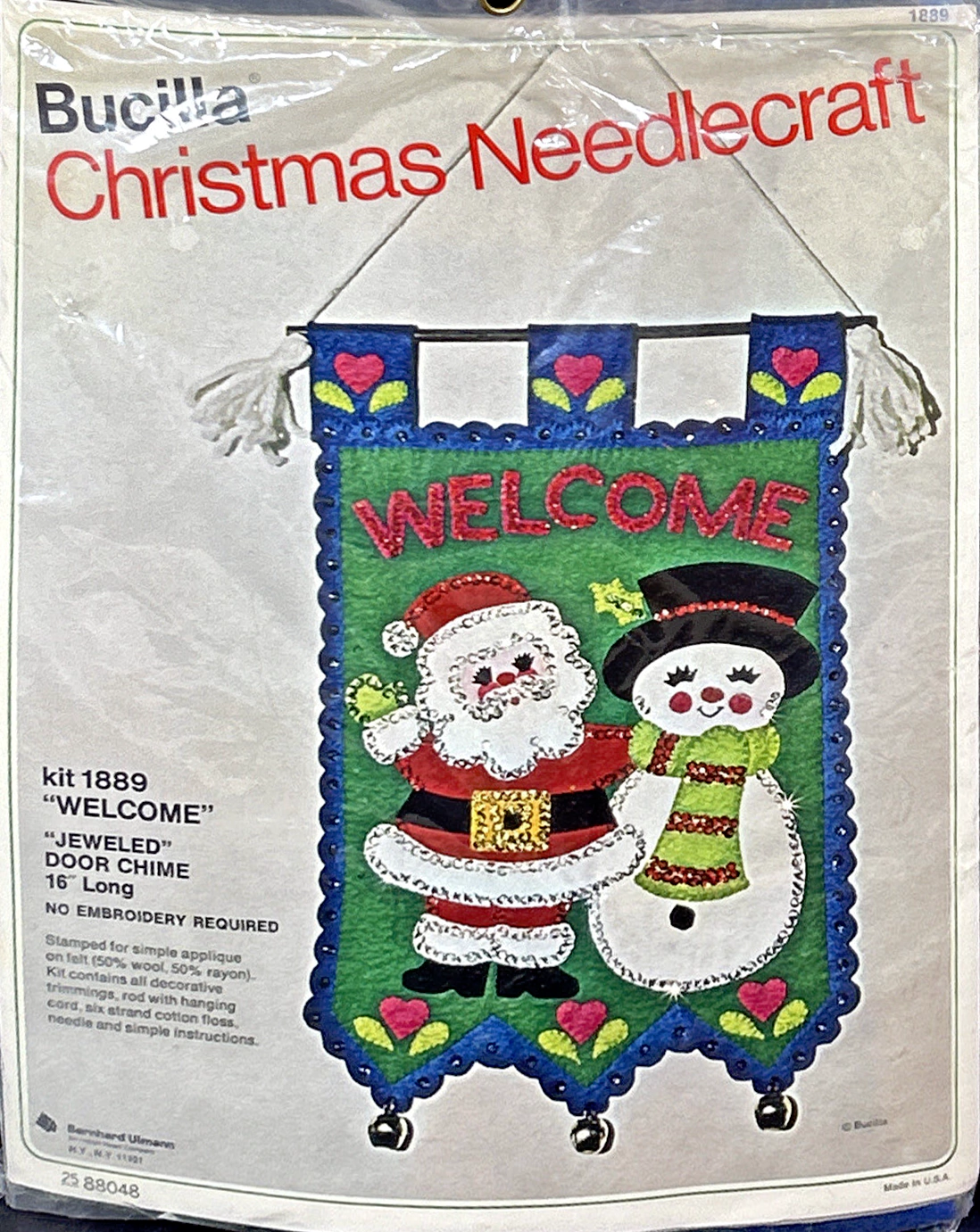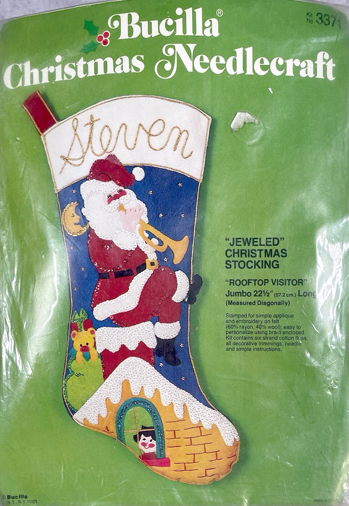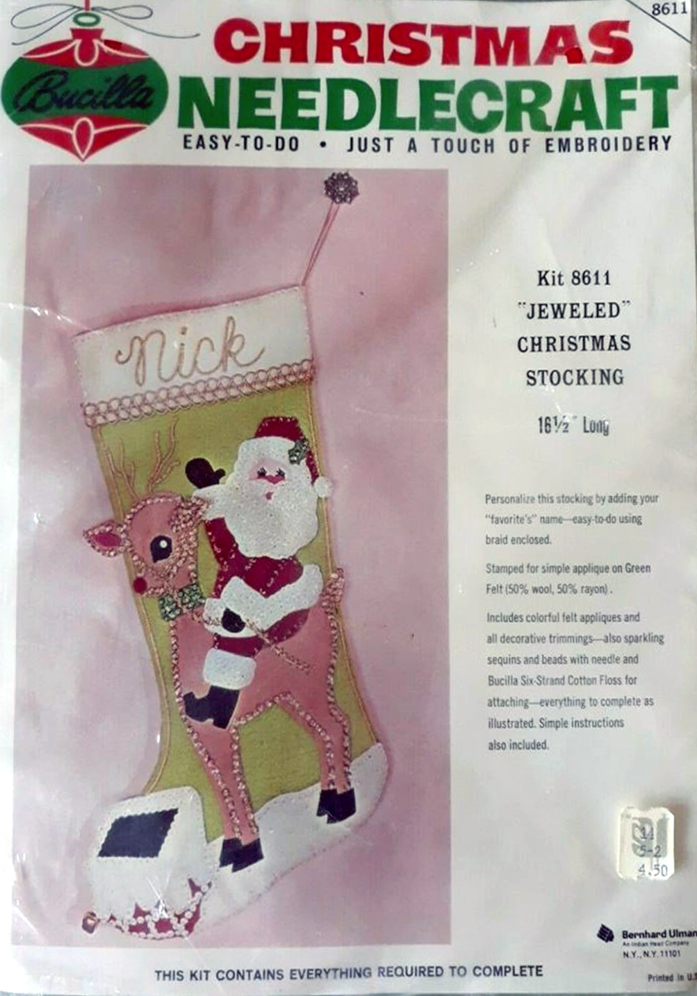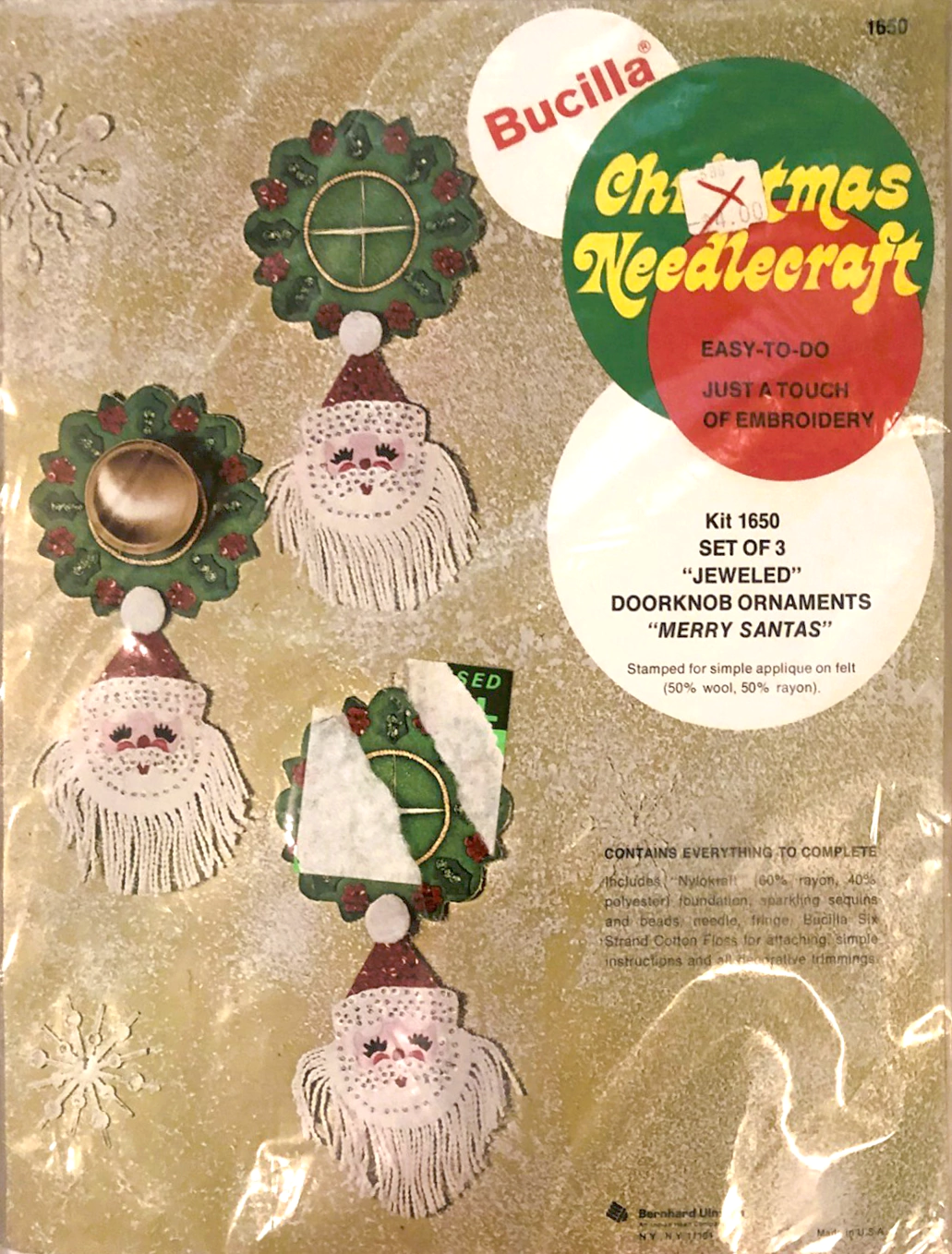 Santa & Helpers 3586 1979 Kit contains stamped felt (60% rayon / 40% wool), 100% Persian crewel wool, six strand cotton floss, all decorative trimmings, needle and easy-to-follow instructions.