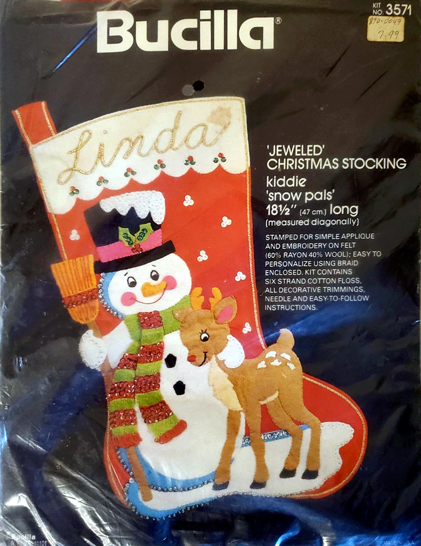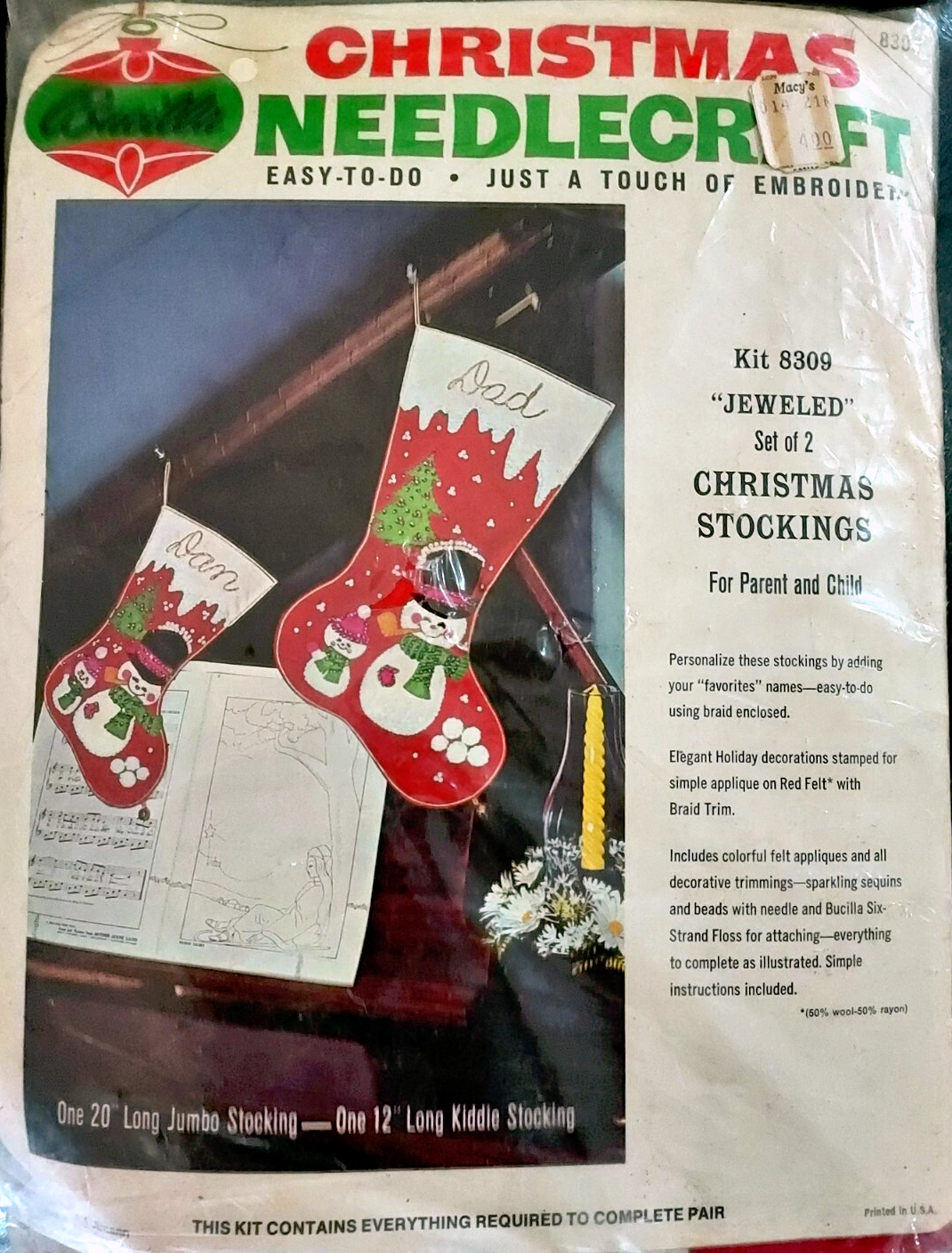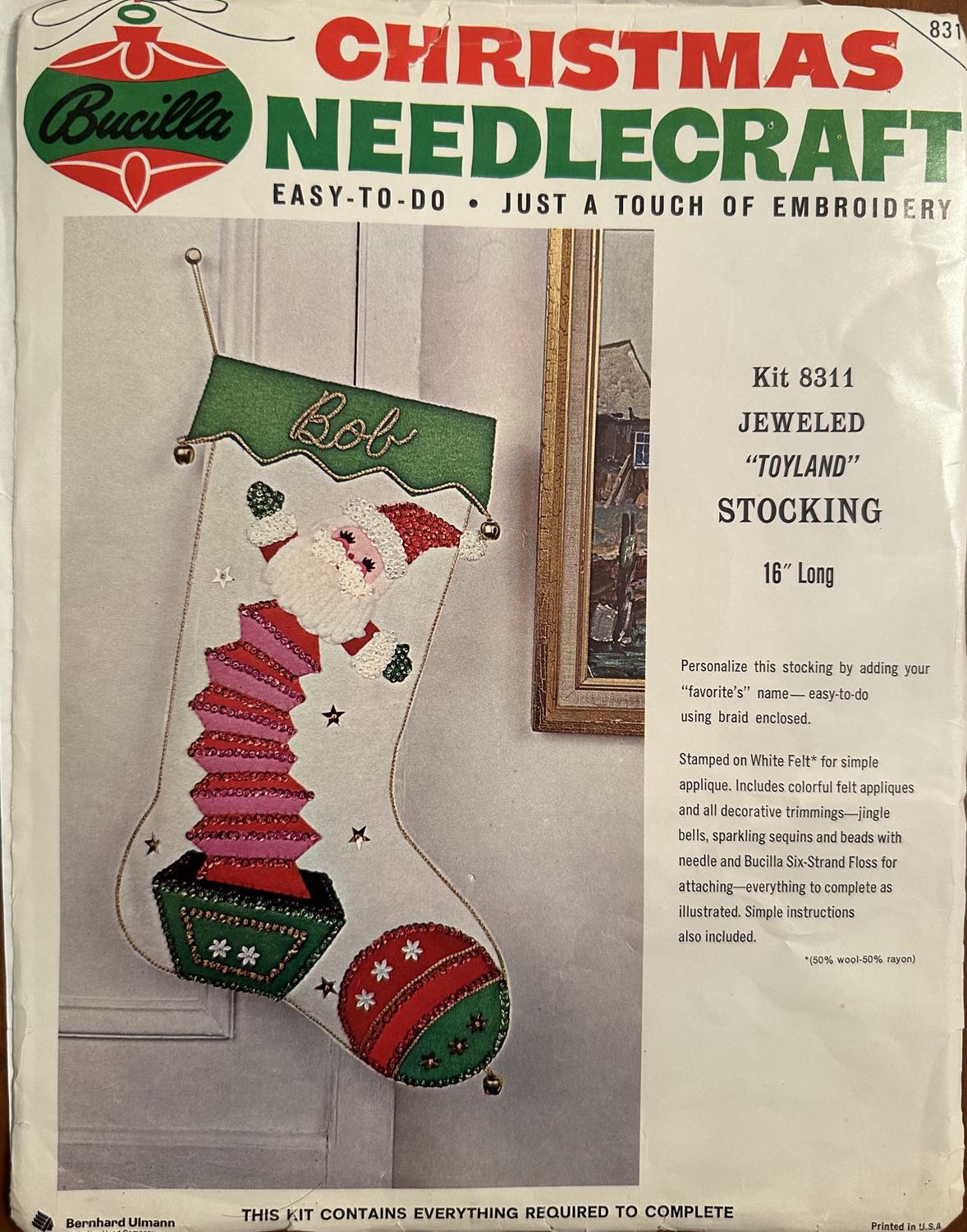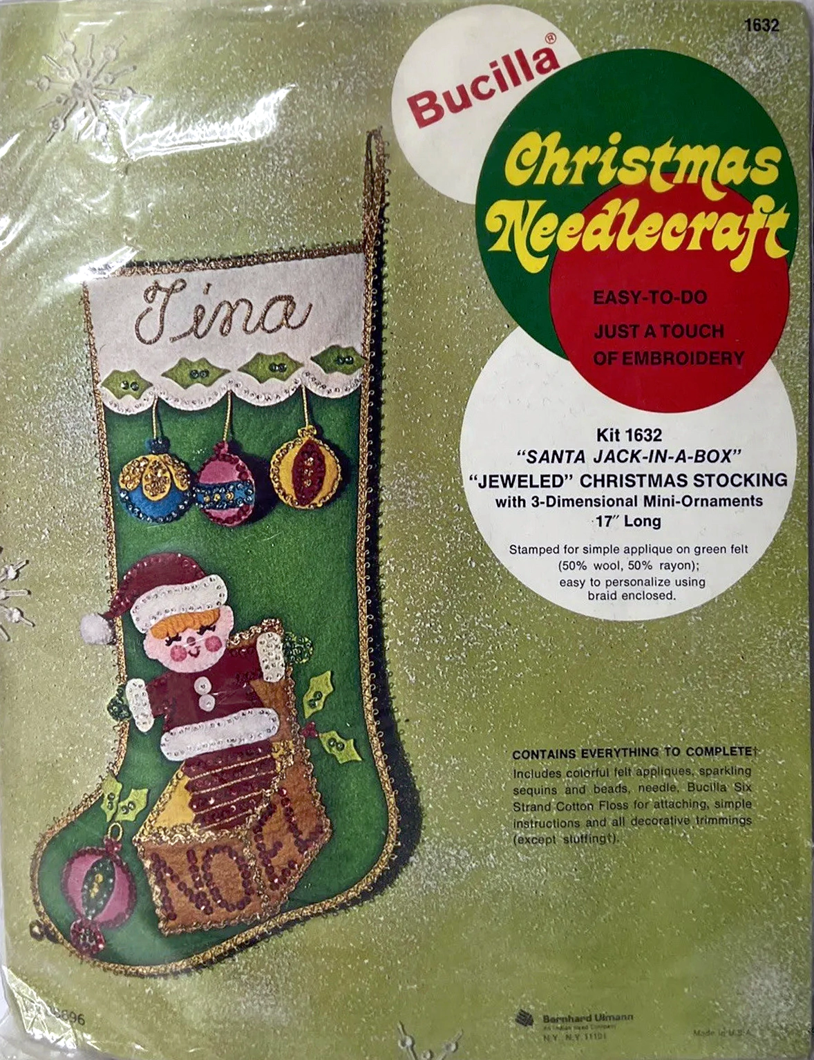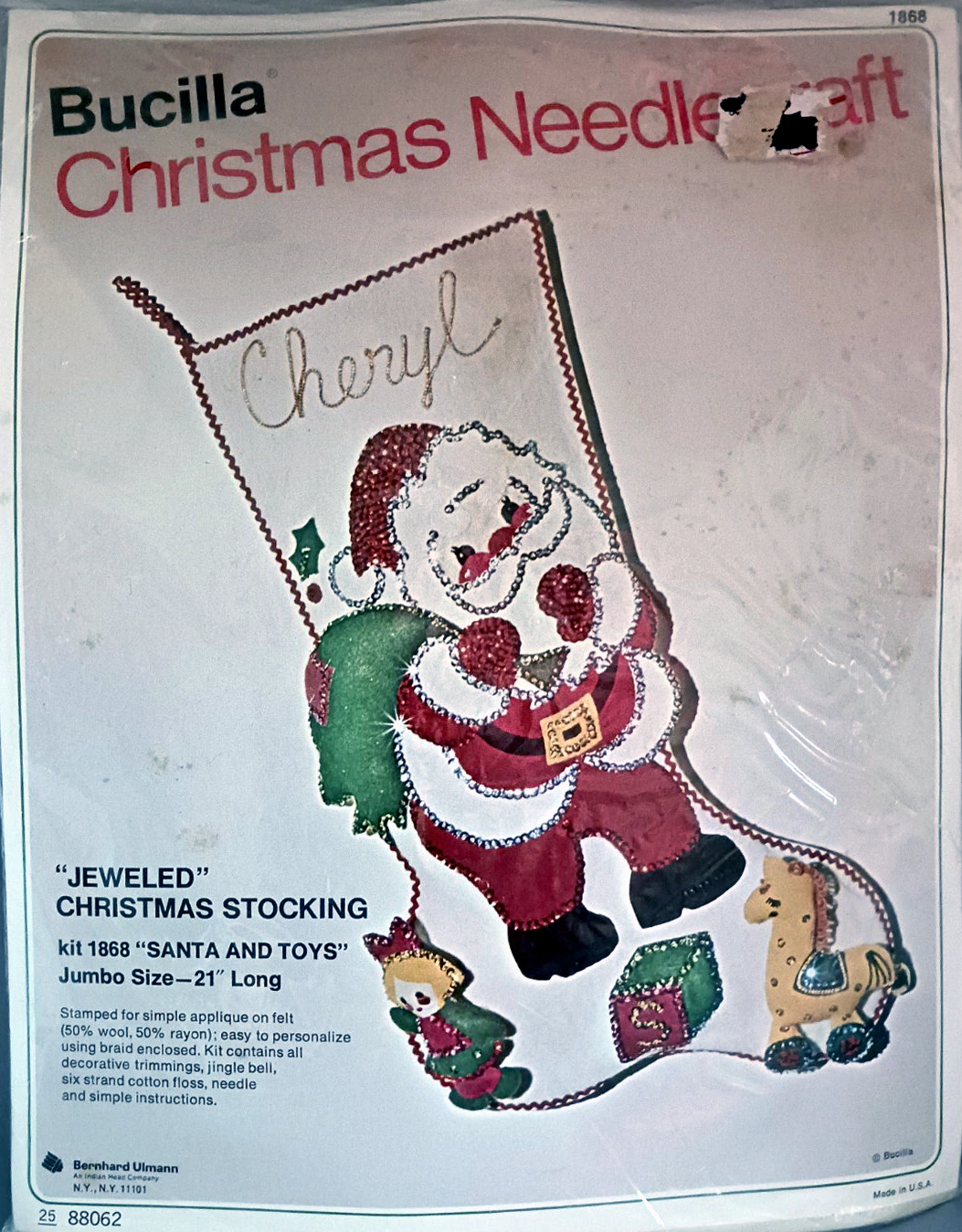 Santa & Helpers 3586 1979 Kit contains stamped felt (60% rayon / 40% wool), 100% Persian crewel wool, six strand cotton floss, all decorative trimmings, needle and easy-to-follow instructions.