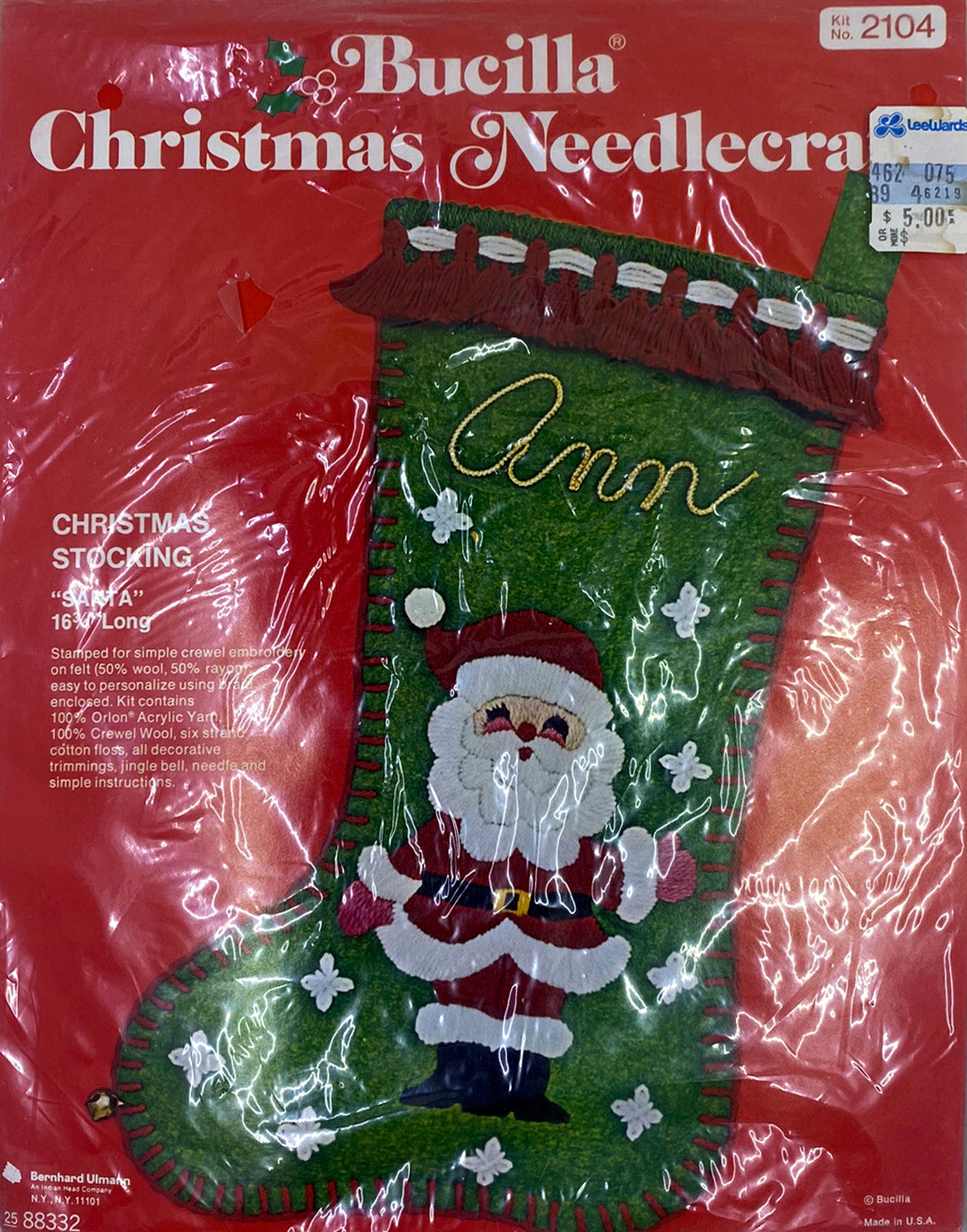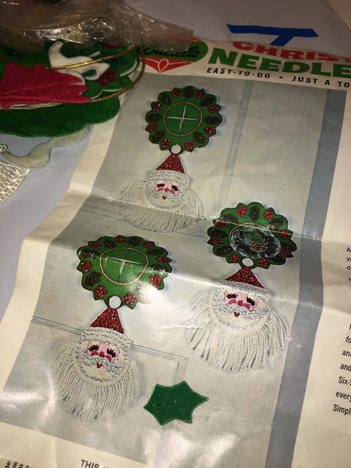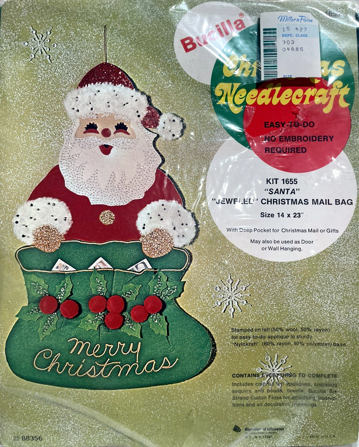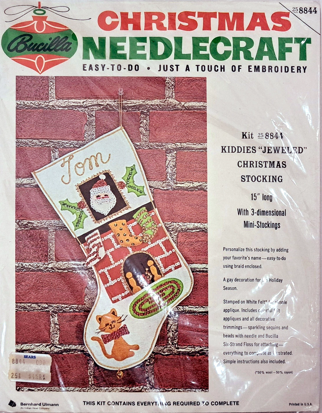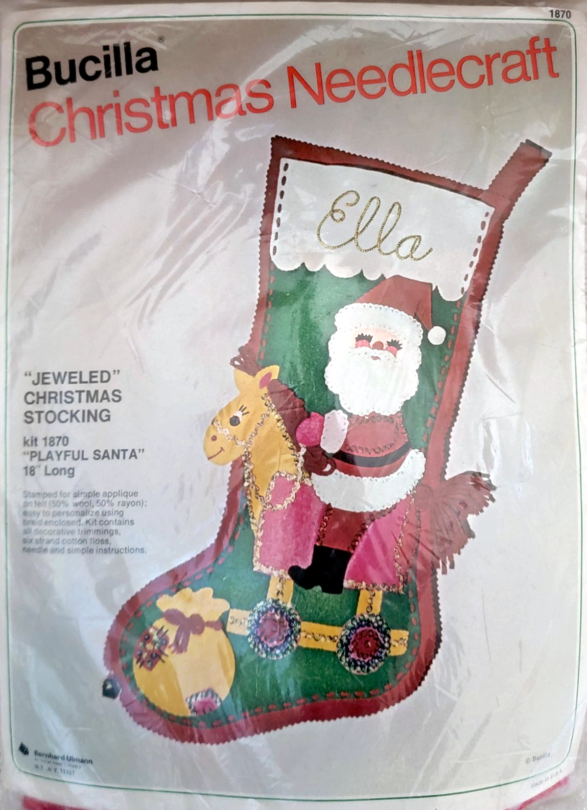 Santa & Helpers 3586 1979 Kit contains stamped felt (60% rayon / 40% wool), 100% Persian crewel wool, six strand cotton floss, all decorative trimmings, needle and easy-to-follow instructions.