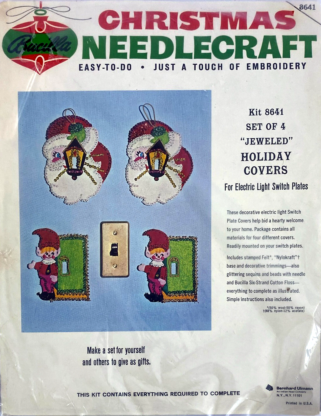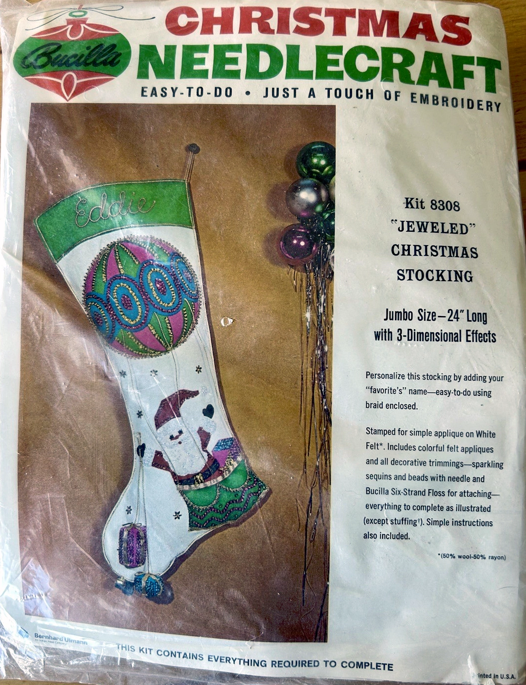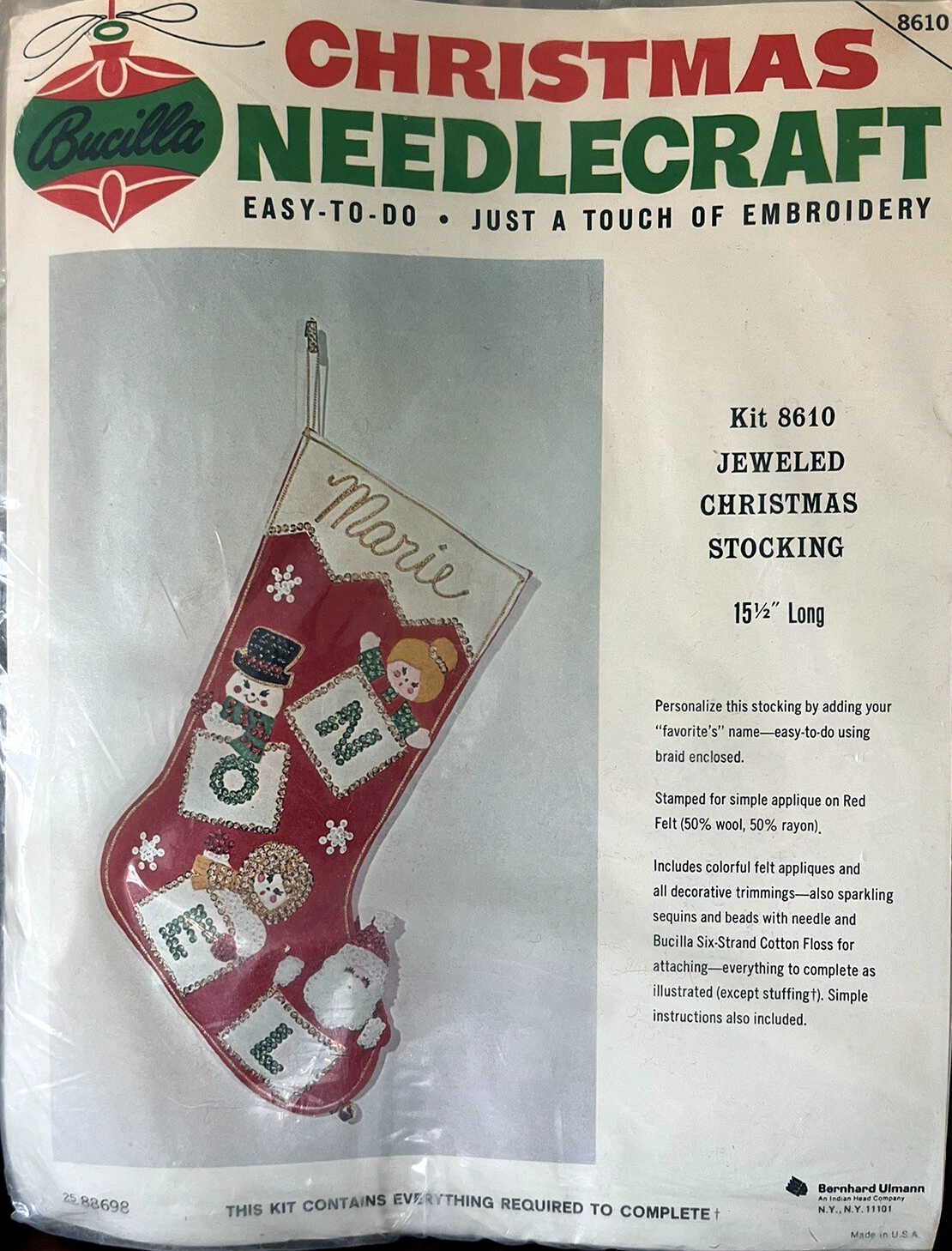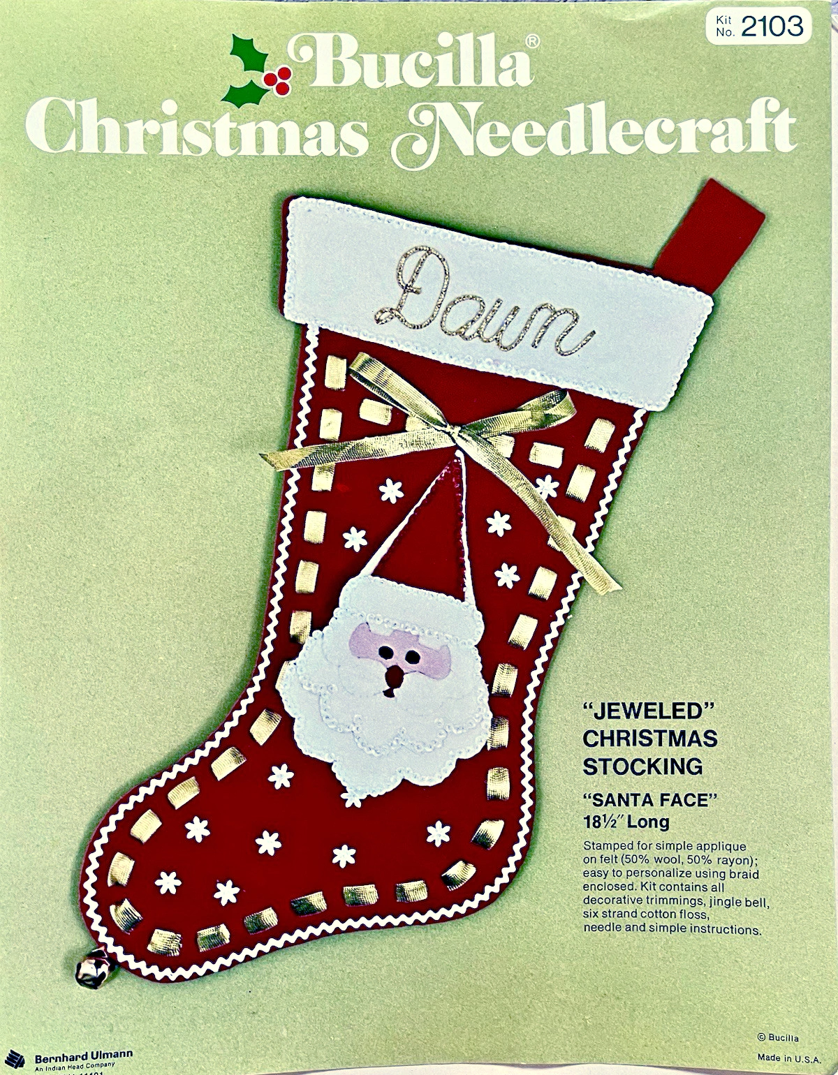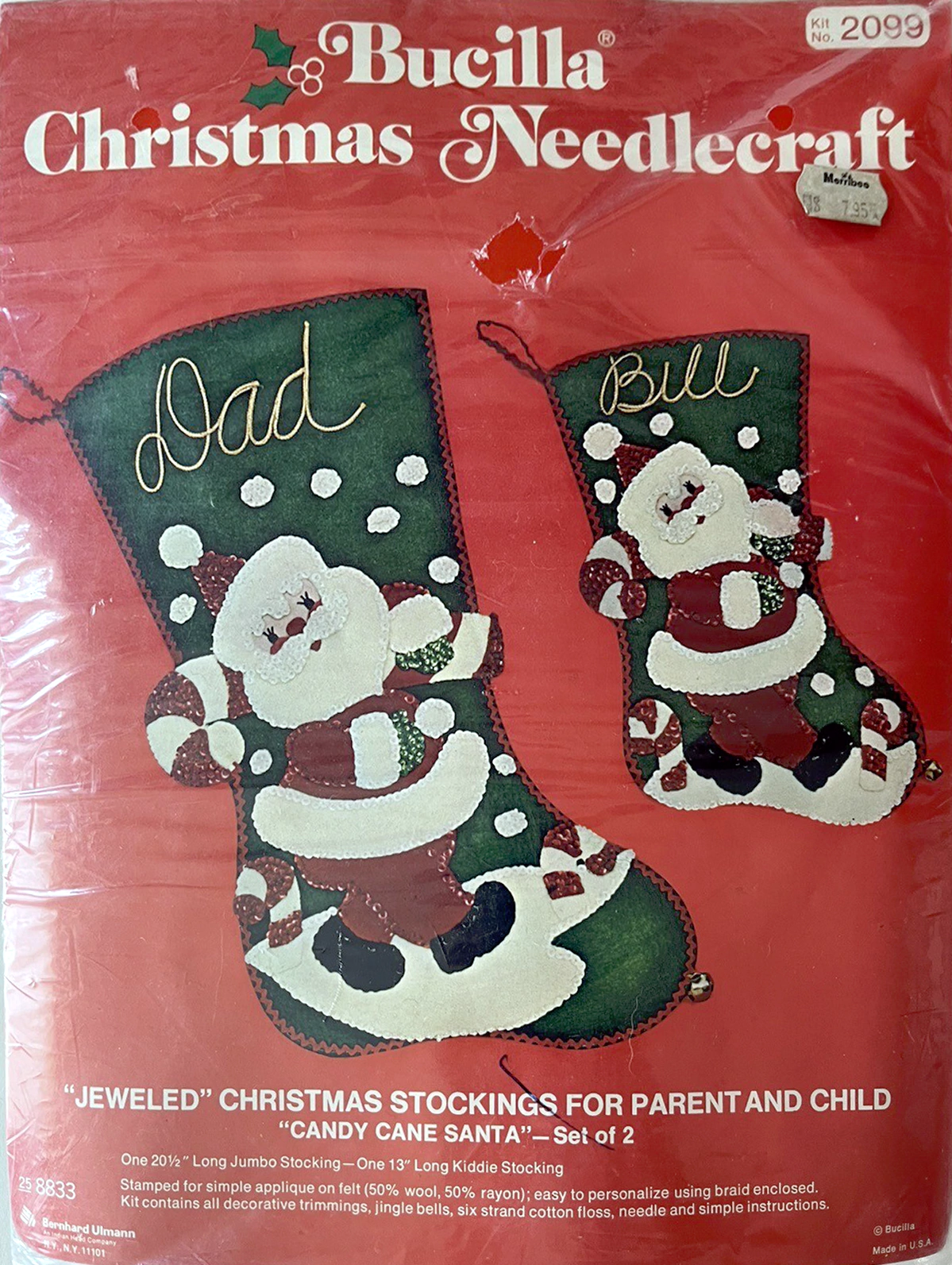 Santa & Helpers 3586 1979 Kit contains stamped felt (60% rayon / 40% wool), 100% Persian crewel wool, six strand cotton floss, all decorative trimmings, needle and easy-to-follow instructions.