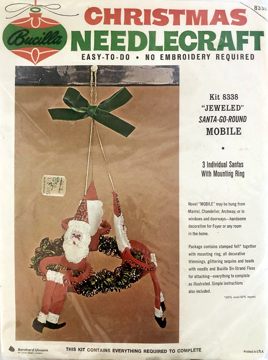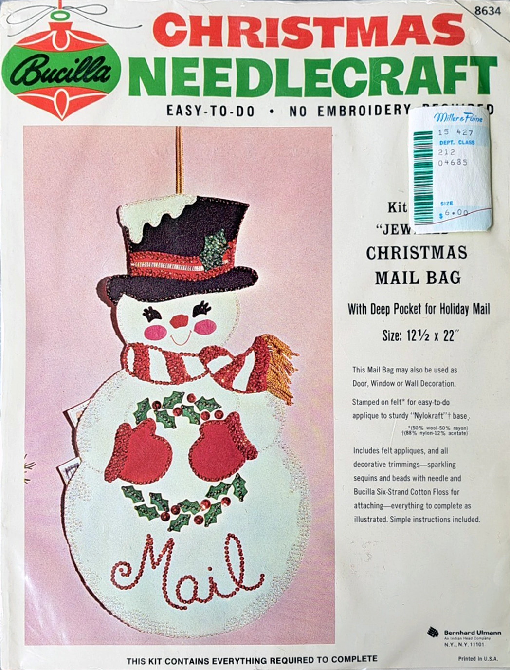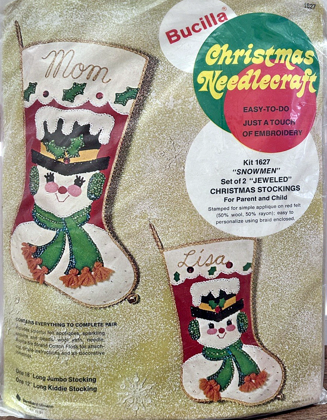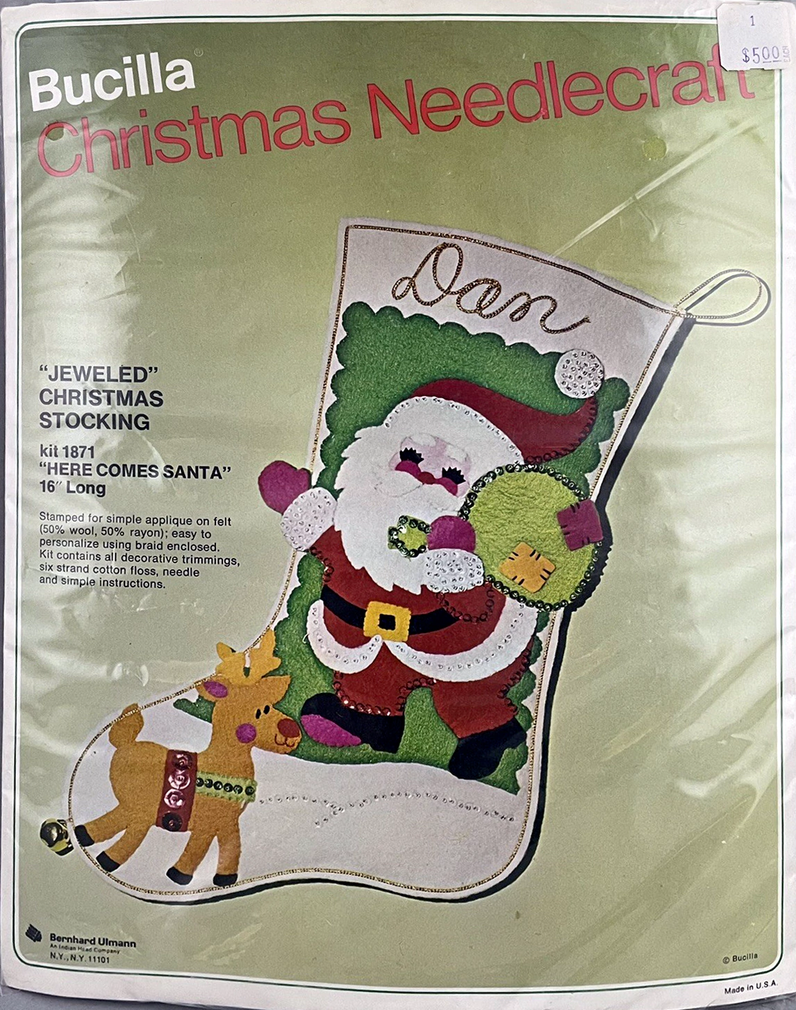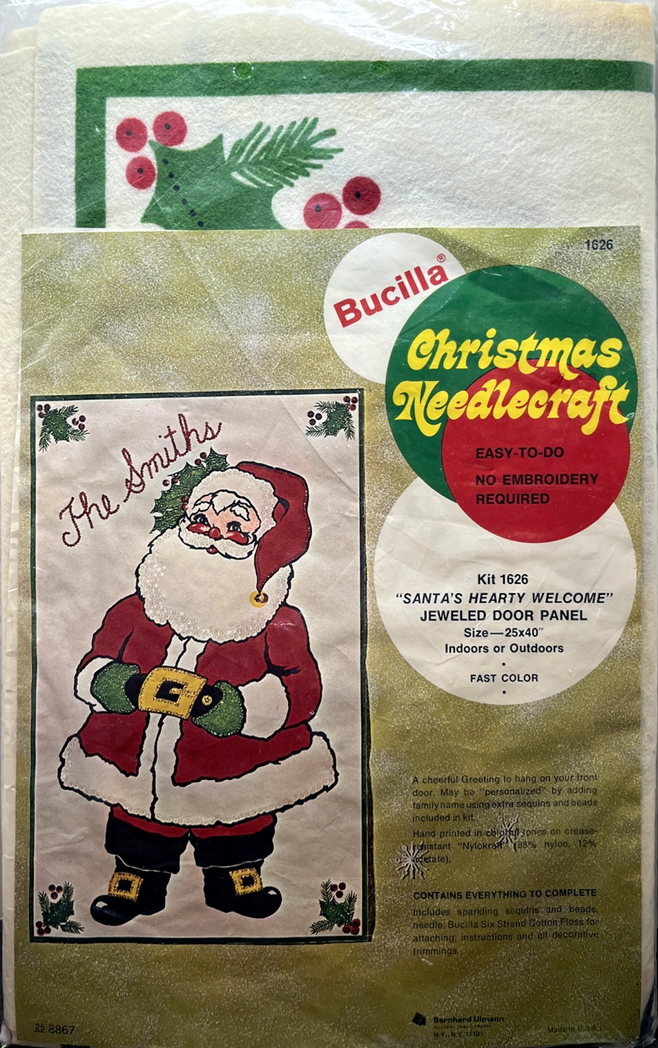 Santa & Helpers 3586 1979 Kit contains stamped felt (60% rayon / 40% wool), 100% Persian crewel wool, six strand cotton floss, all decorative trimmings, needle and easy-to-follow instructions.