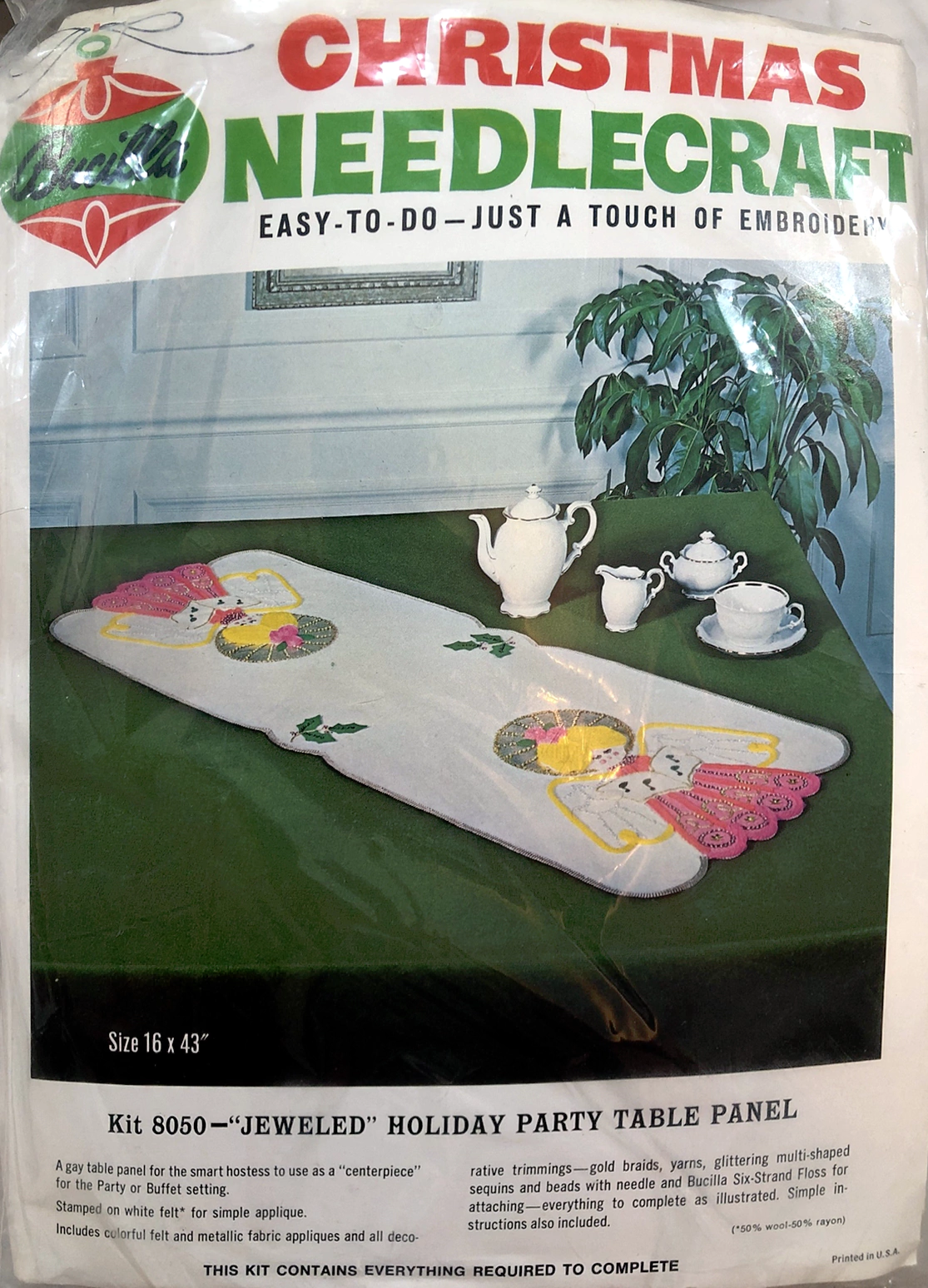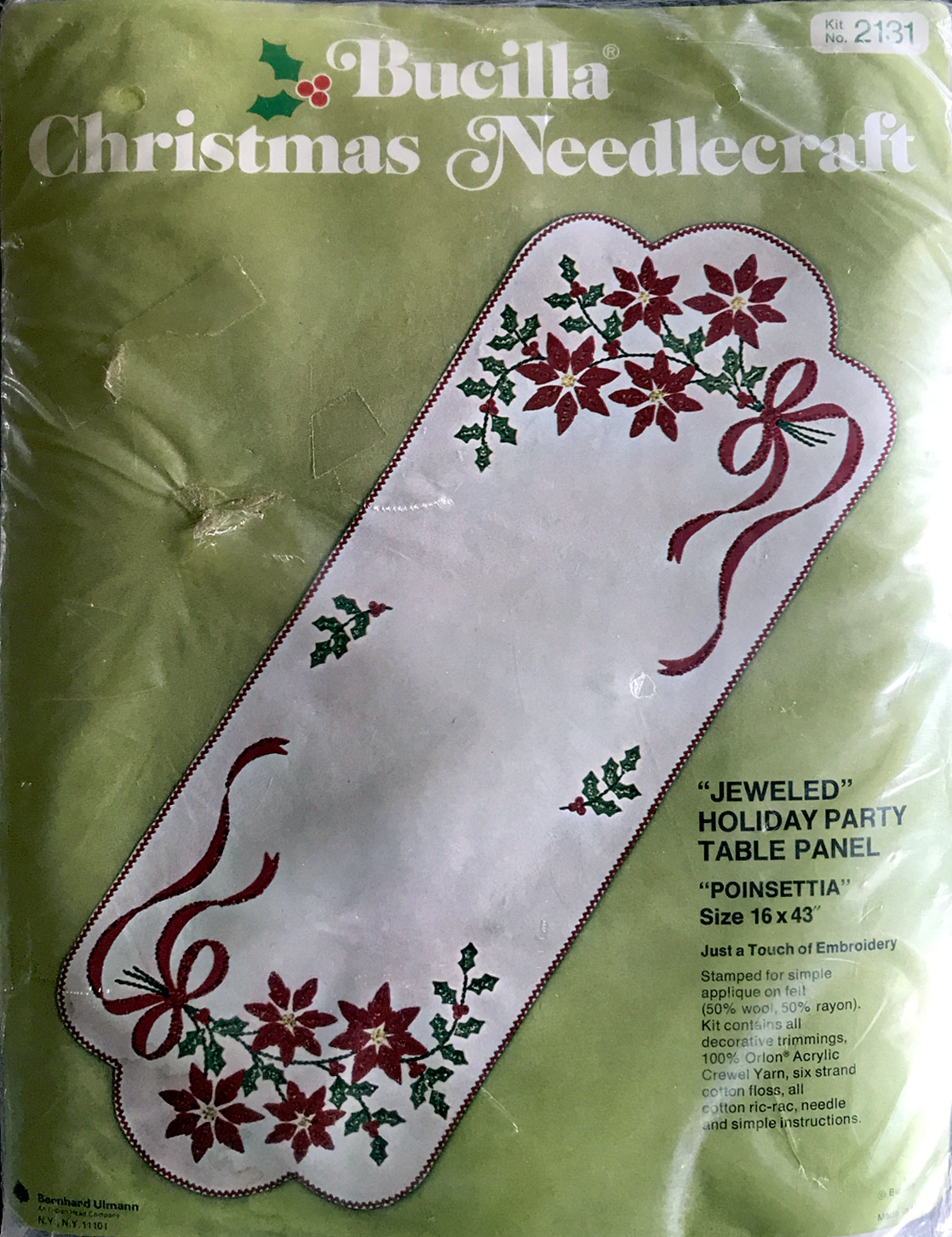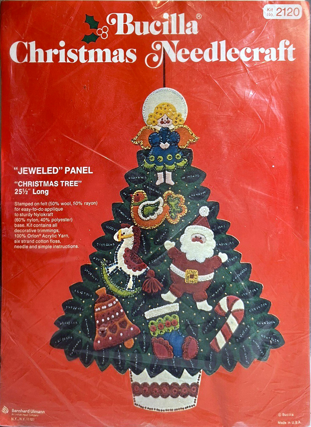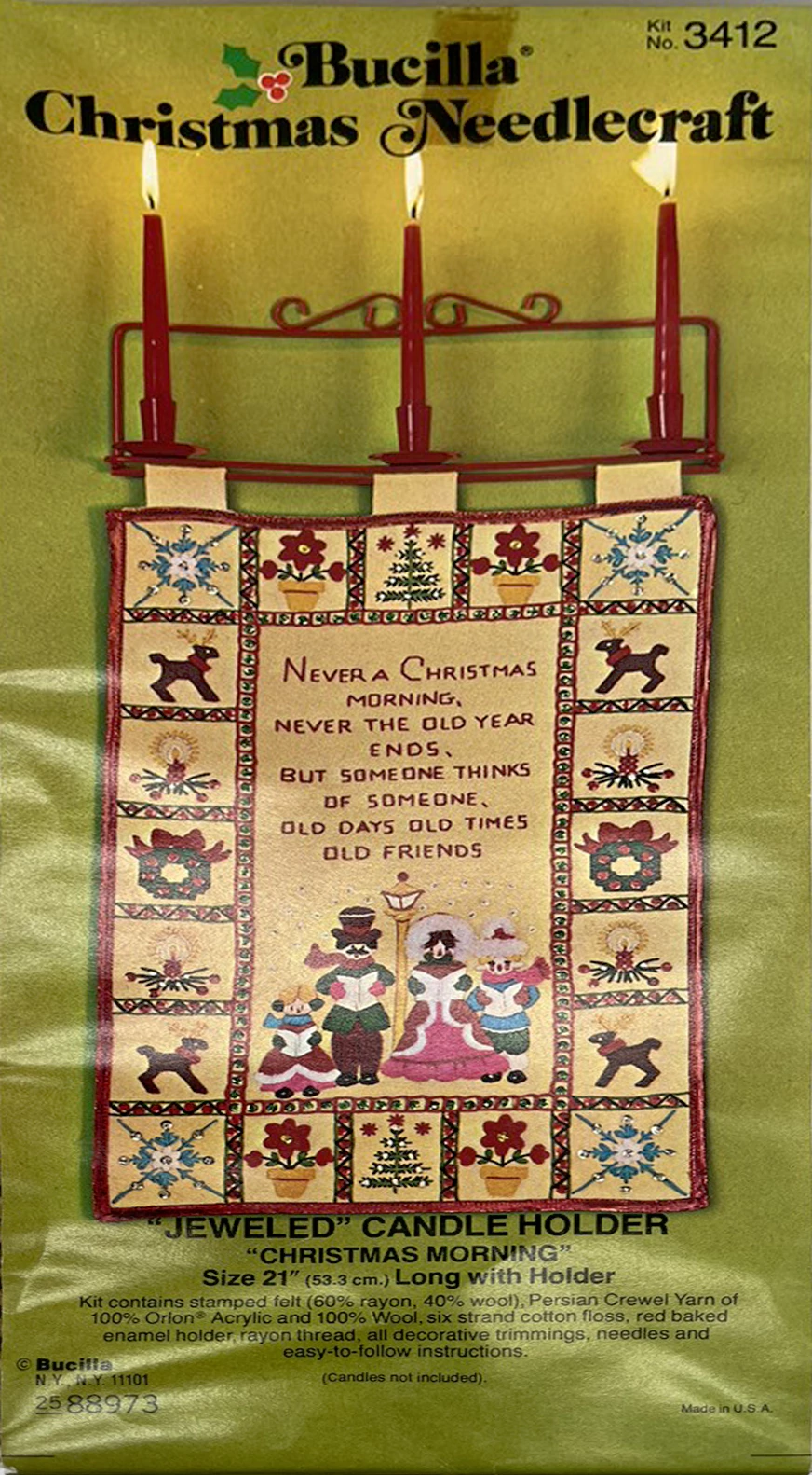 STAMPED FOR SIMPLE APPLIQUE AND EMBROIDERY ON FELT (60% RAYON, 40% WOOL). KIT CONTAINS 100% PERSIAN CREWEL WOOL, SIX STRAND COTTON FLOSS, ALL DECORATIVE TRIMMINGS, NEEBLES AND EASY-TO-FOLLOW INSTRUCTIONS.