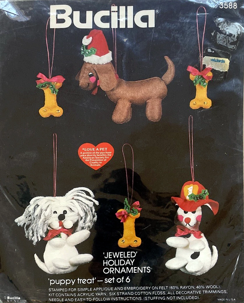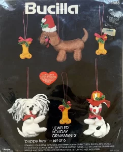 Puppy Treat 3588 1979 2-5″, Set of 6 Features a dachshund, dalmation (a fire dog, complete with fire hat) and white fluffy puppy and three doggie bones, each appointed with holly leaves and sparkle.