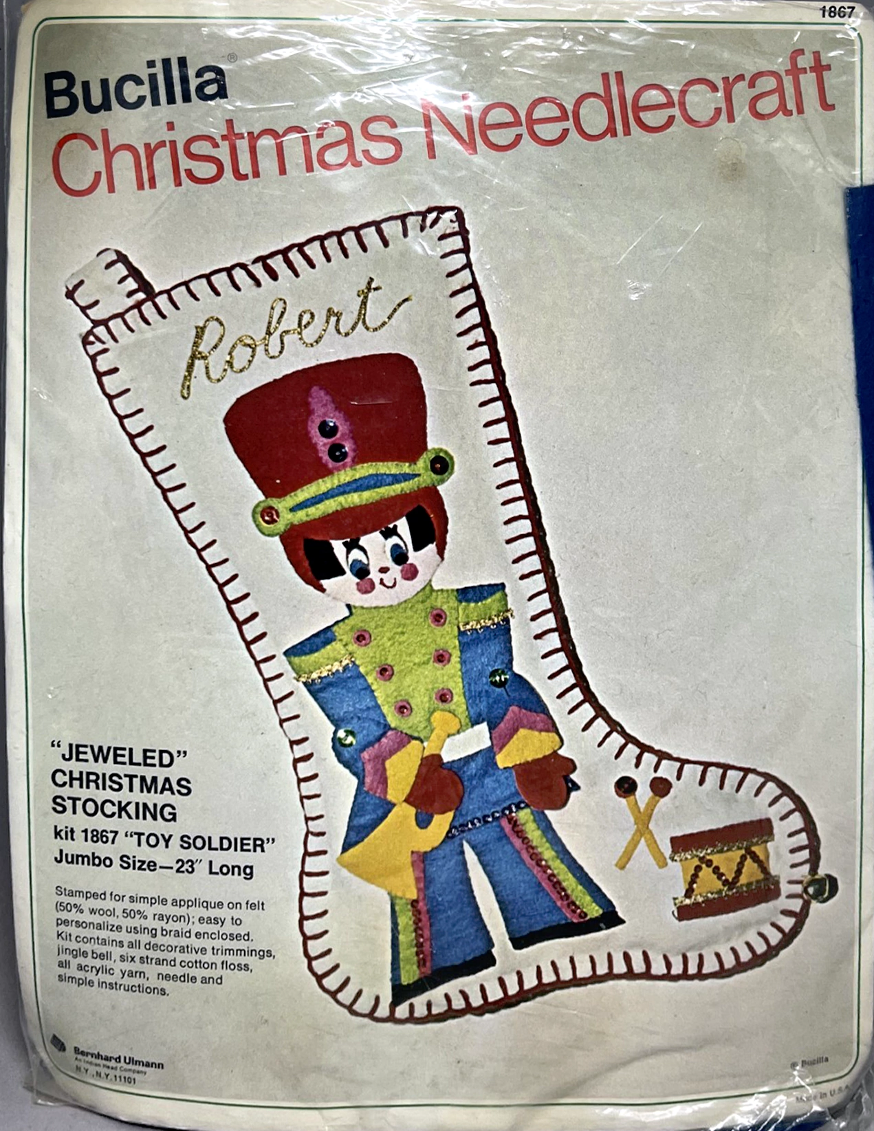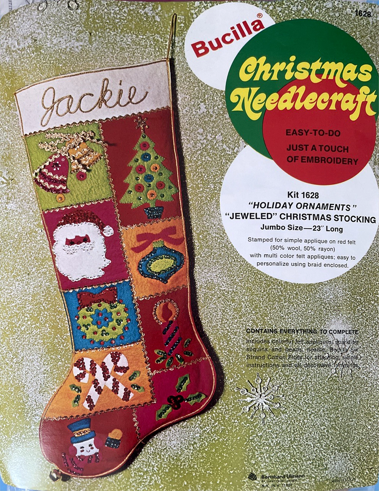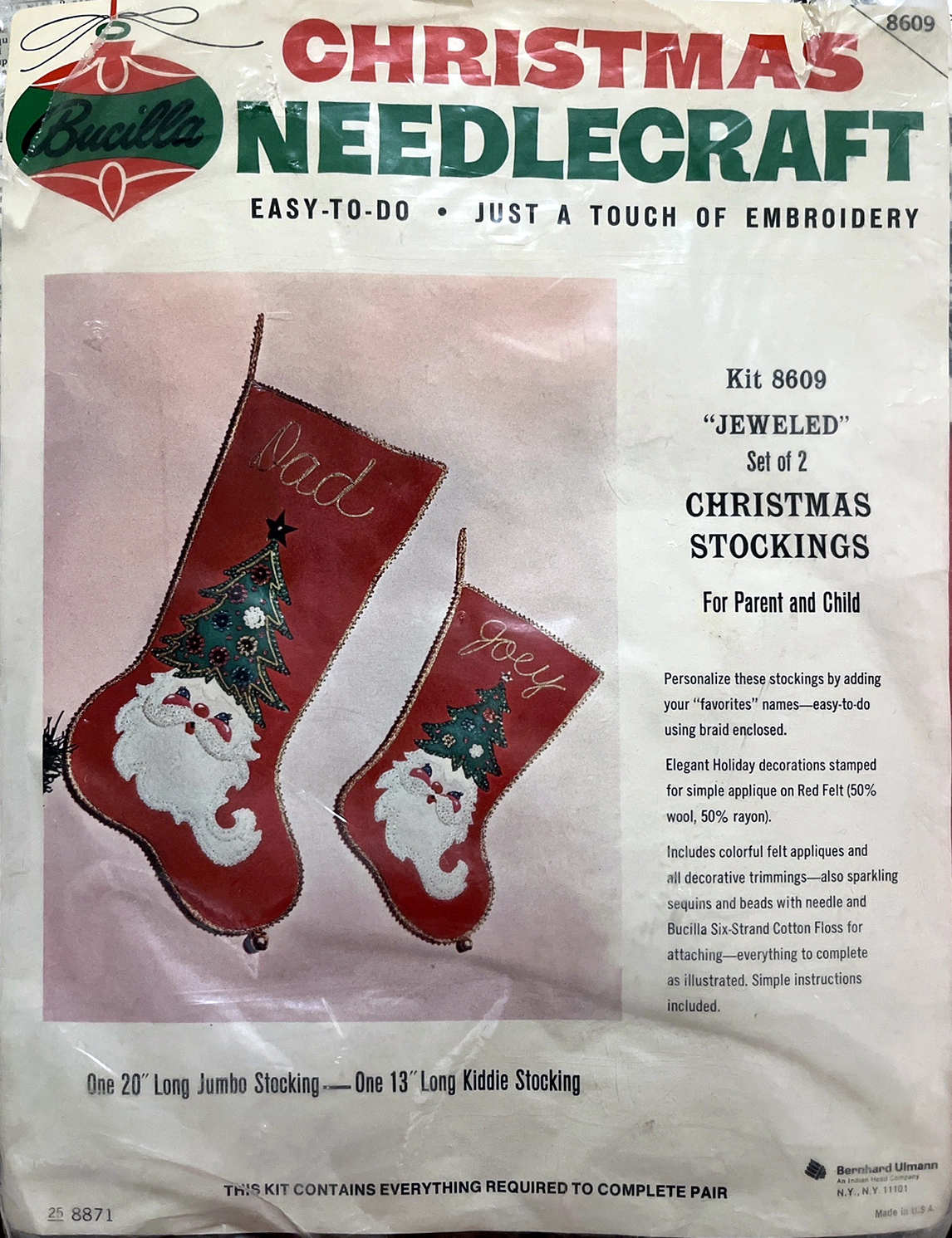STAMPED FOR SIMPLE APPLIQUE AND EMBROIDERY ON FELT (60% RAYON, 40% WOOL) EASY TO PERSONALIZE USING BRAID ENCLOSED. KIT CONTAINS 100% ORLON’ ACRYLIC PERSIAN CREWEL YARN, SIX STRAND COTTON FLOSS, ALL DECORATIVE TRIMMINGS, NEEDLES AND EASY-TO-FOLLOW INSTRUCTIONS