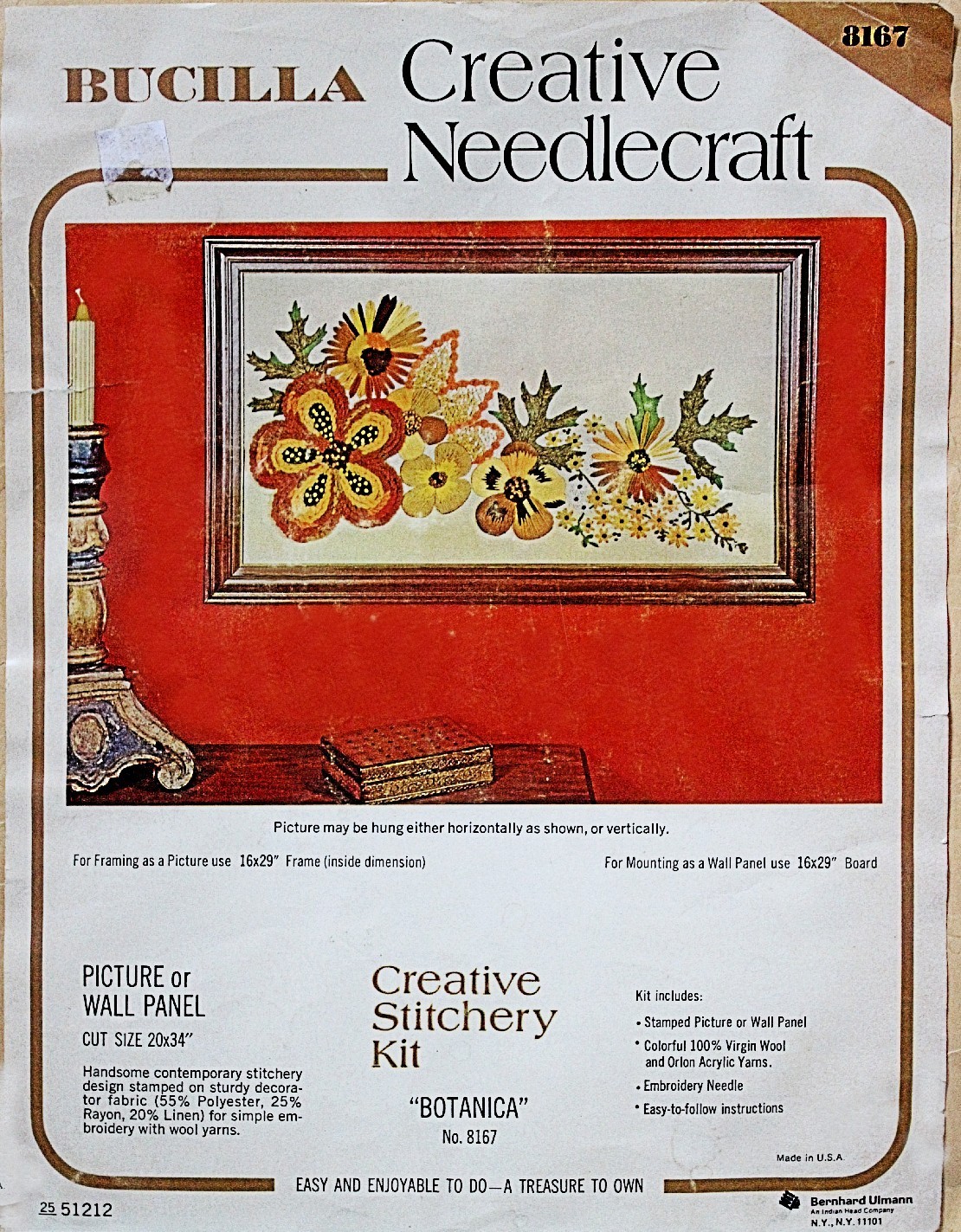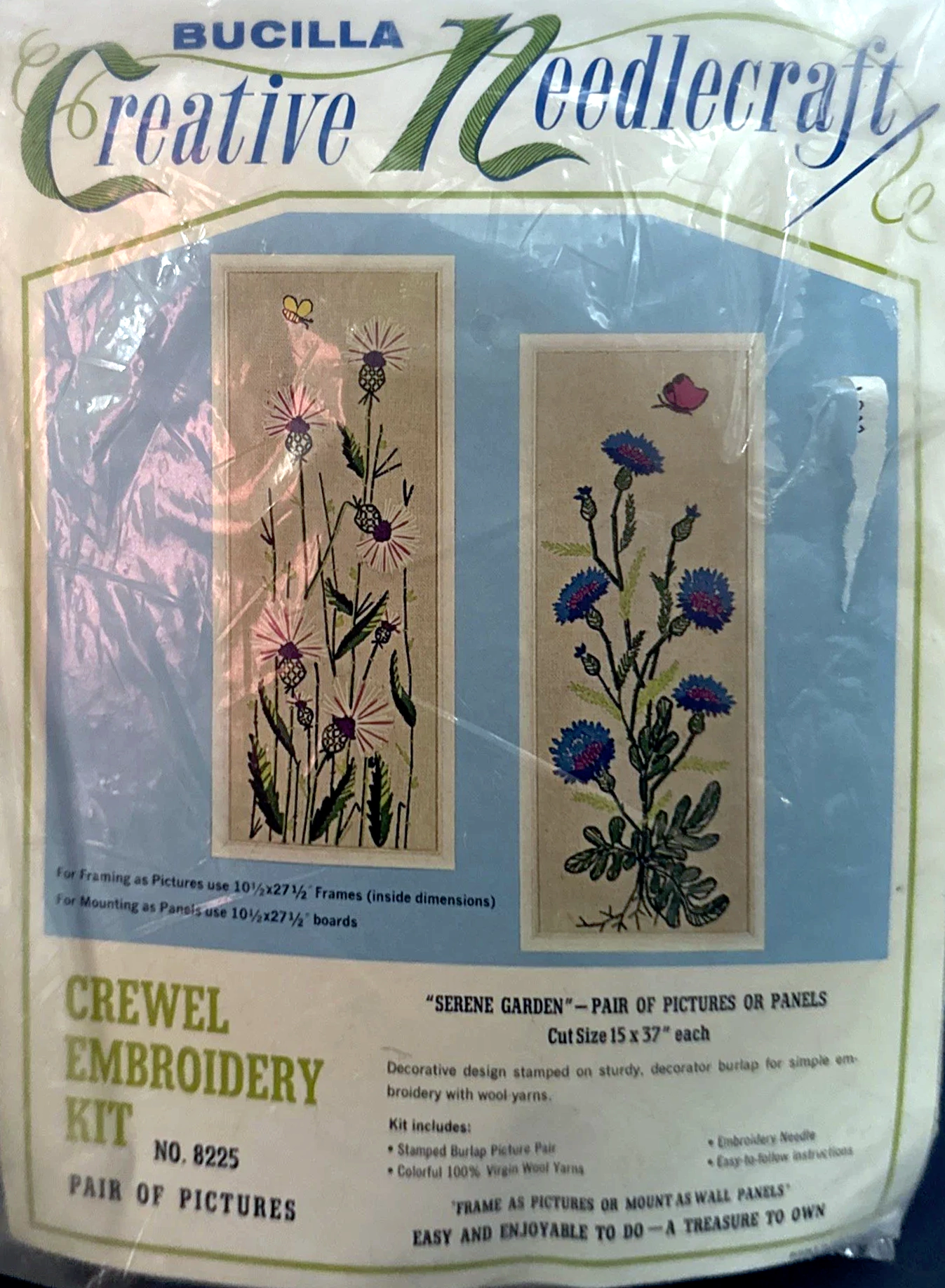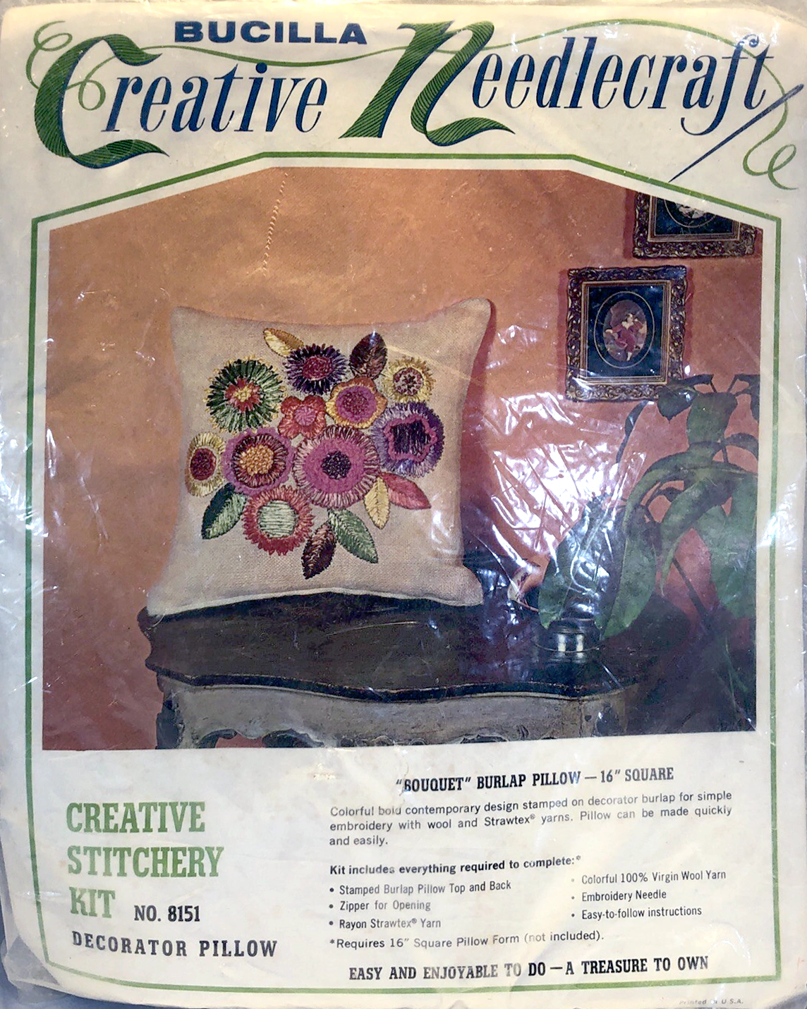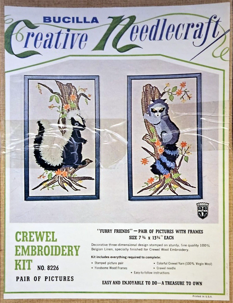 ENCLOSED. KIT CONTAINS 100% PERSIAN CREWEL WOOL, SIX STRAND COTTON FLOSS, ALL DECORATIVE TRIMMINGS NEEDLES AND EASY-TO-FOLLOW INSTRUCTIONS.