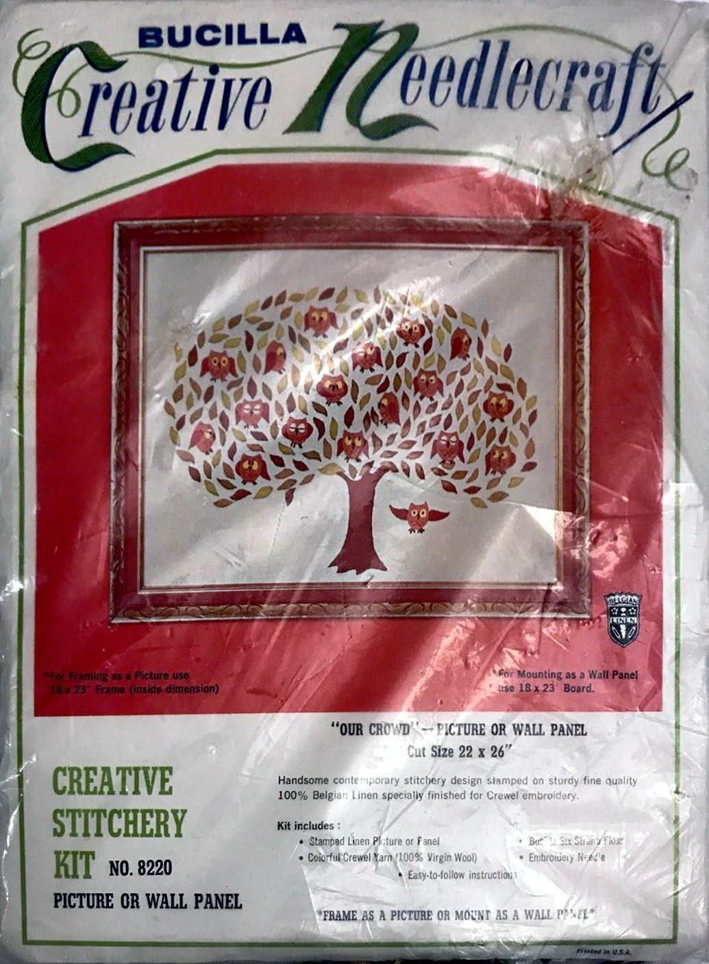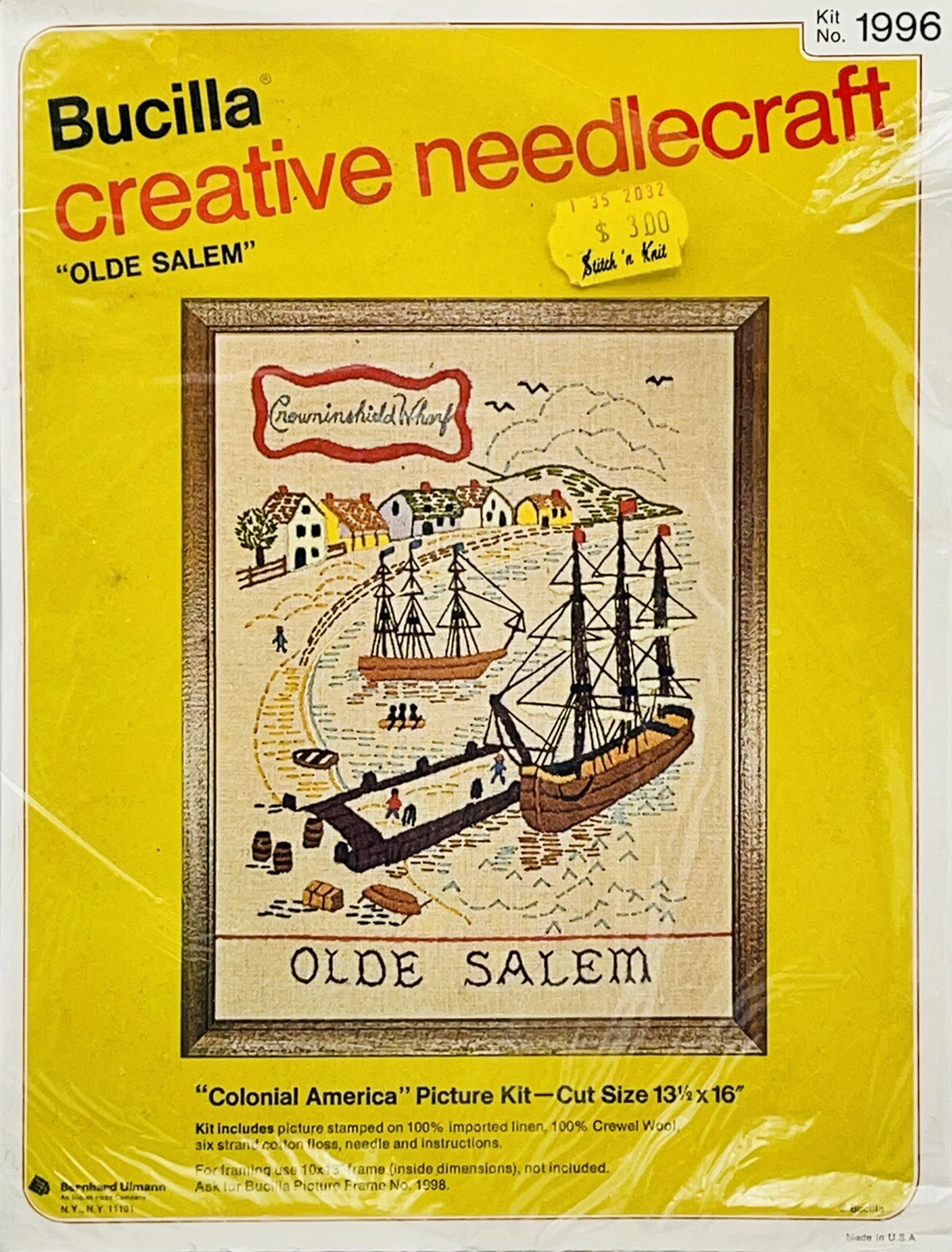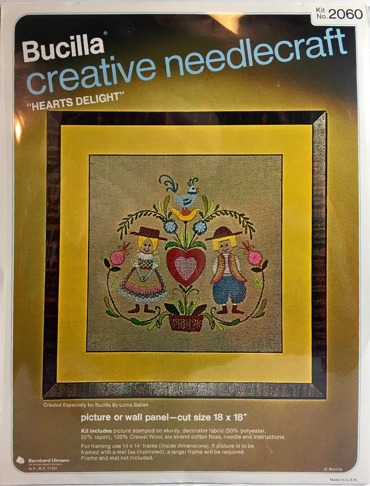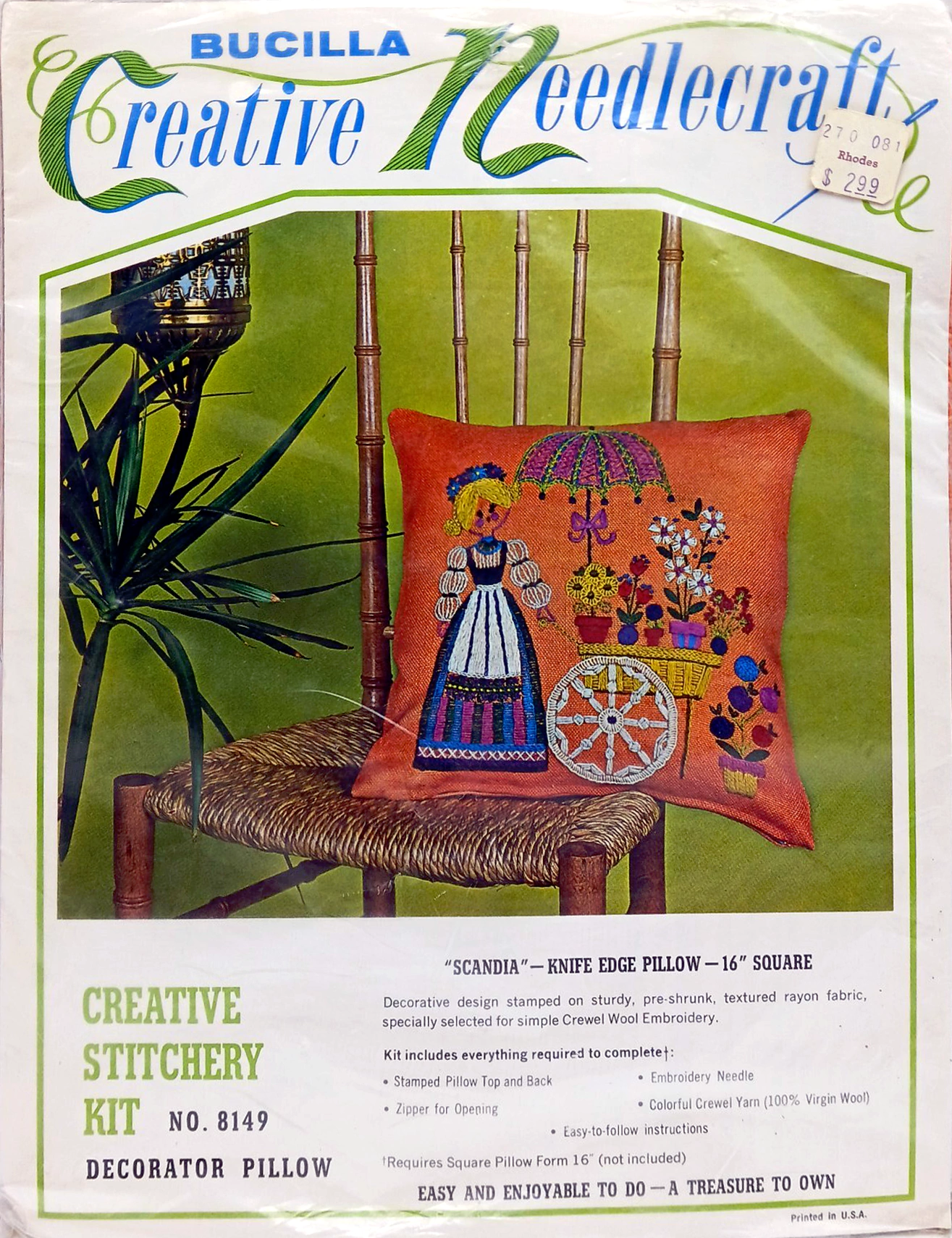 ENCLOSED. KIT CONTAINS 100% PERSIAN CREWEL WOOL, SIX STRAND COTTON FLOSS, ALL DECORATIVE TRIMMINGS NEEDLES AND EASY-TO-FOLLOW INSTRUCTIONS.