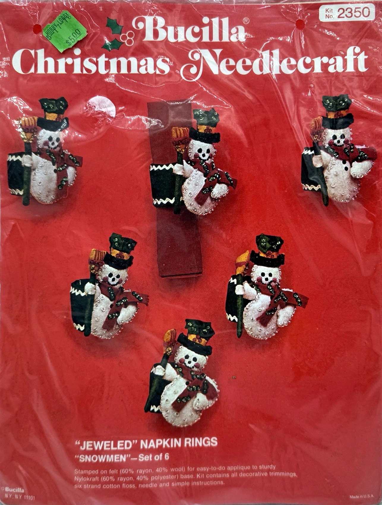 STAMPED ON FELT (60% RAYON, 40% WOOL) FOR SIMPLE EMBROIDERY AND APPLIQUE WITH STURDY NYLOKRAFT (60% RAYON, 40% POLYESTER) BACK. KIT CONTAINS SIX STRAND COTTON FLOSS, ALL DECORATIVE TRIMMINGS, NEEDLE AND EASY-TO-FOLLOW INSTRUCTIONS (STUFFING NOT INCLUDED).