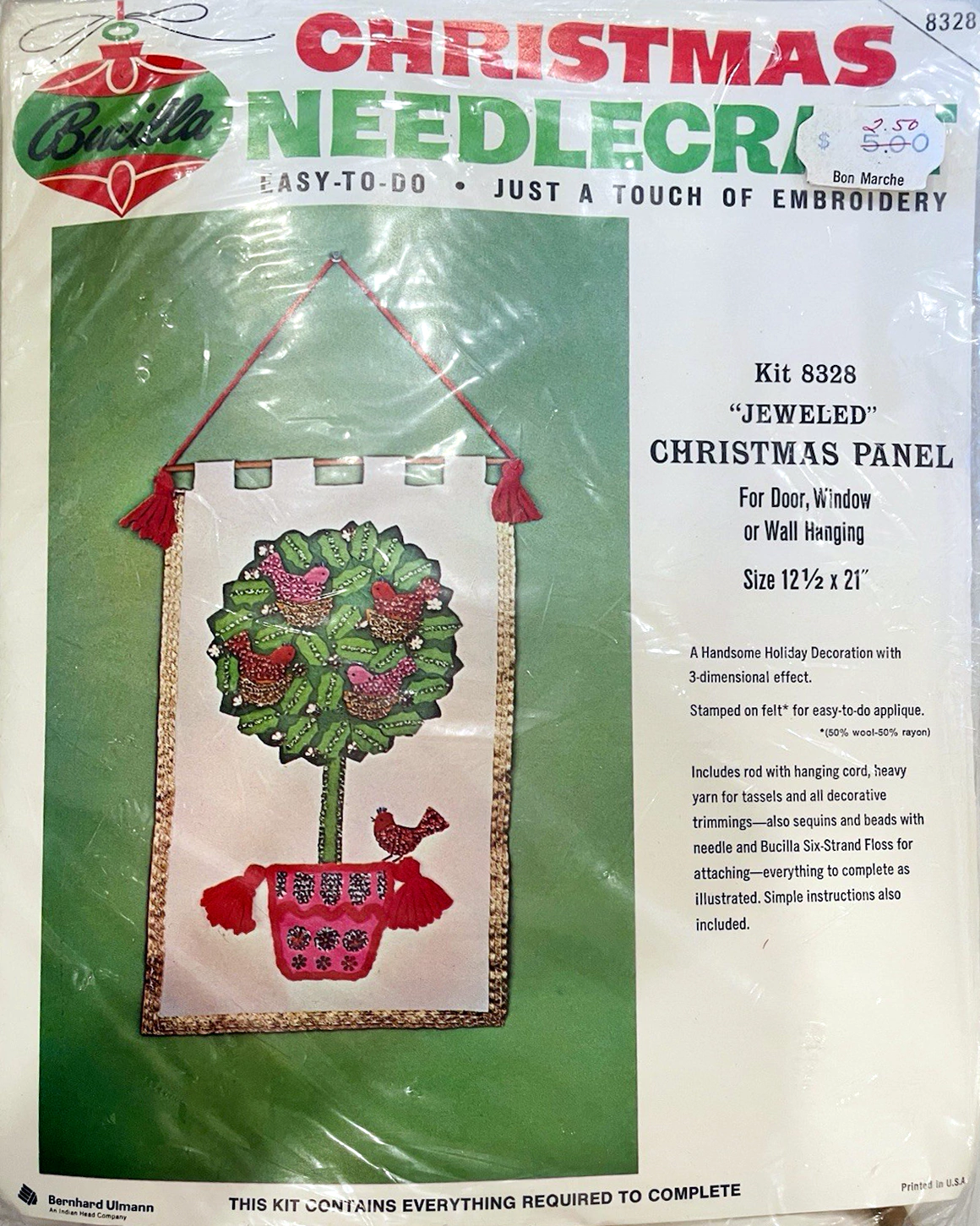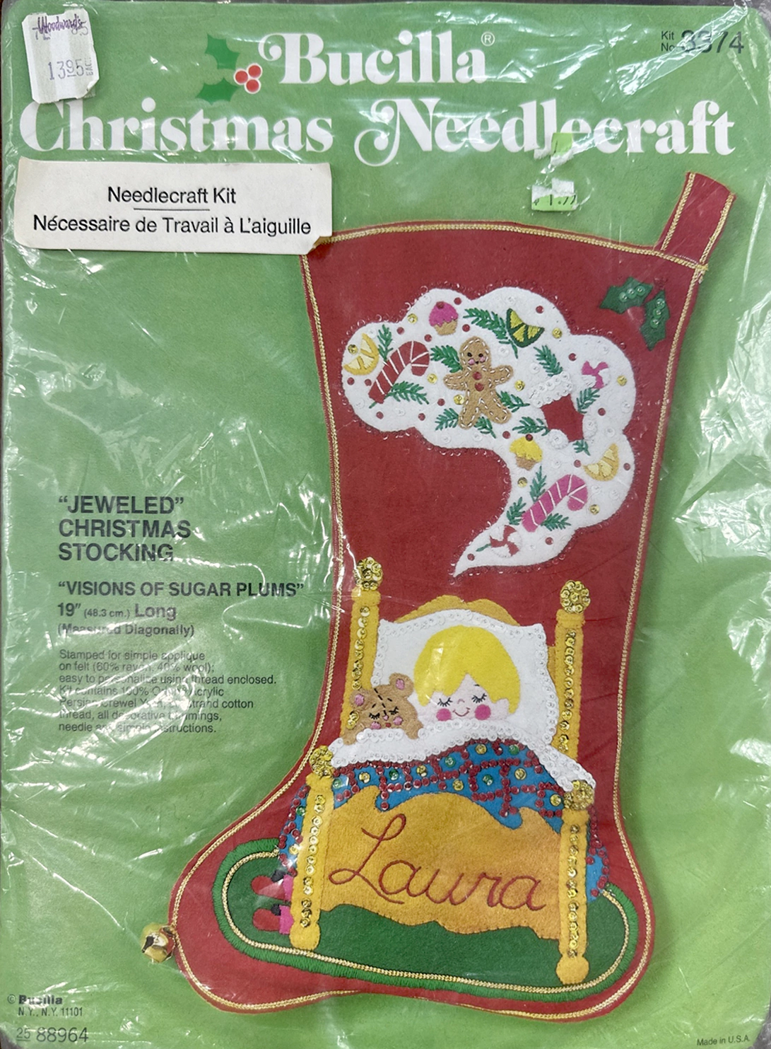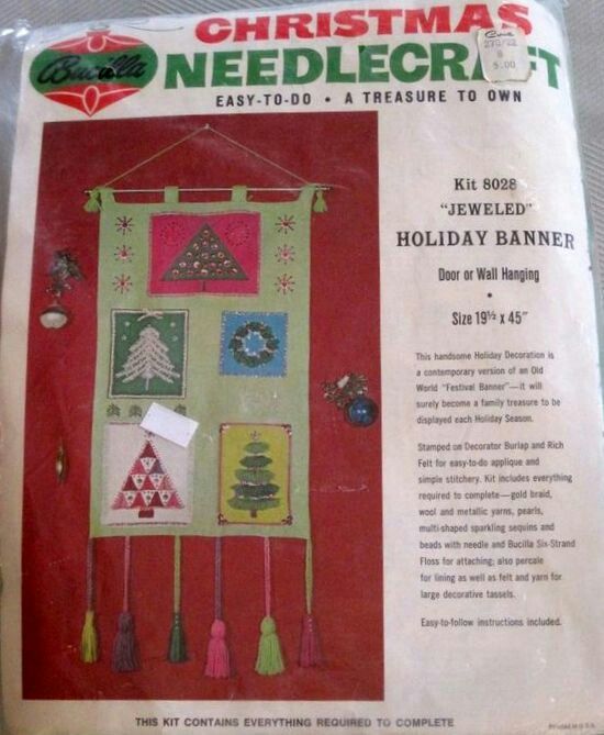 Kit includes: Stamped felt for simple appliqué & embroidery, Embroidery floss, Orlon Acrylic Crewel Yarn,  Metallic Thread, Decorative Trimmings including Sequins, Beads, Cording, Lace, Instructions