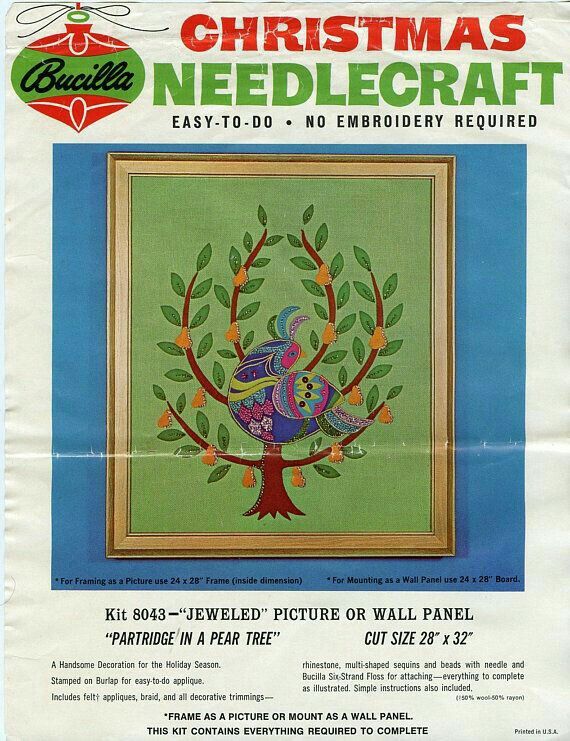 Partridge in a Pear Tree 8043 Jeweled picture or wall panel. Stamped on burlap for easy-to-do applique. 28×32.