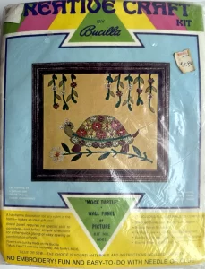 “Mock Turtle” Wall Panel or picture. 8081 Bucilla Creative Craft Kit, on burlap