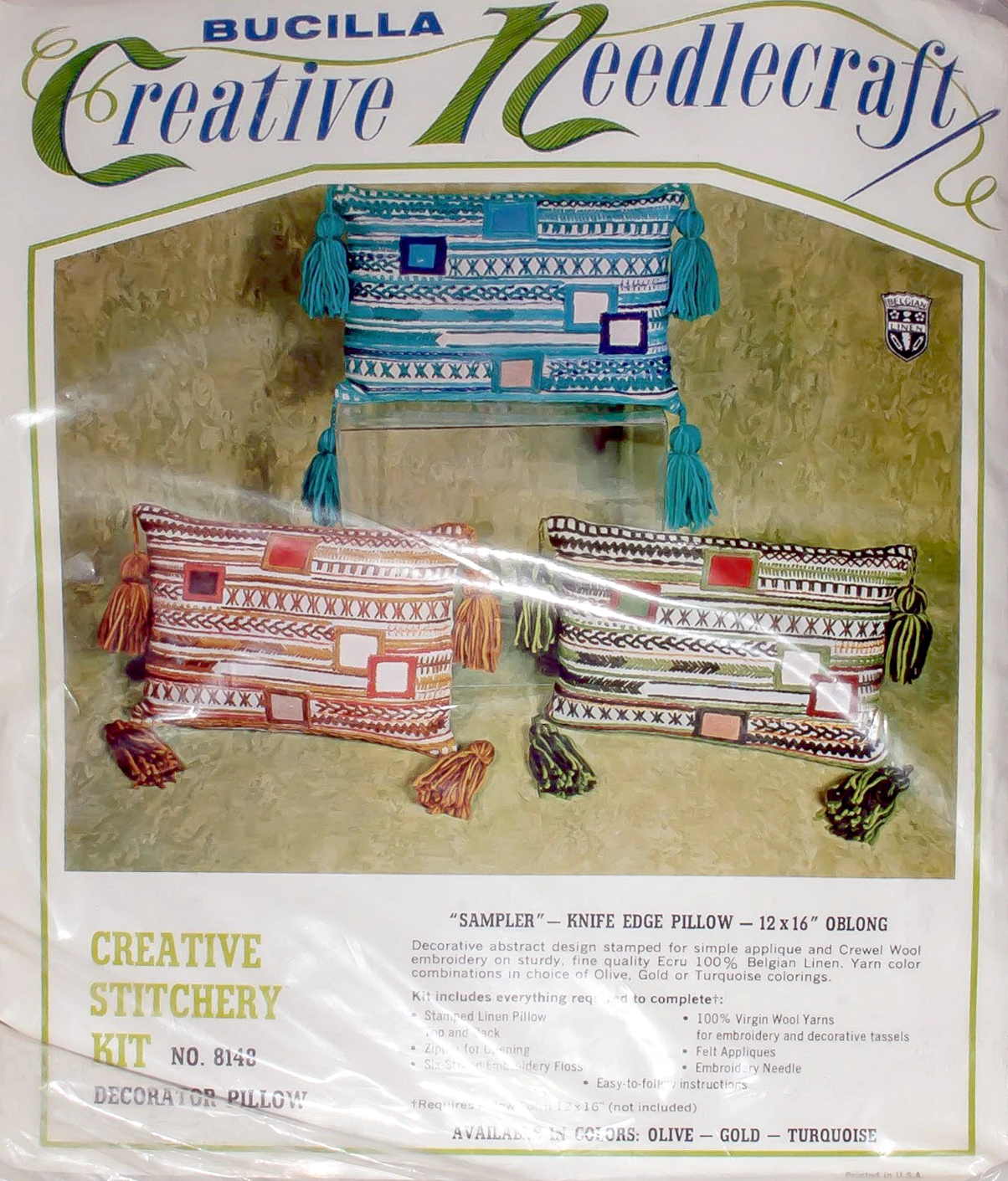 Sampler knife edge pillow 8148 Kit is in one of three colors: olive, gold or turquoise.