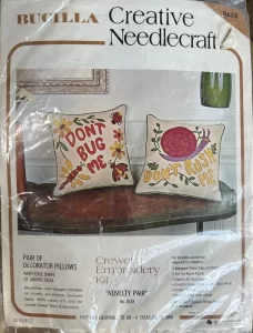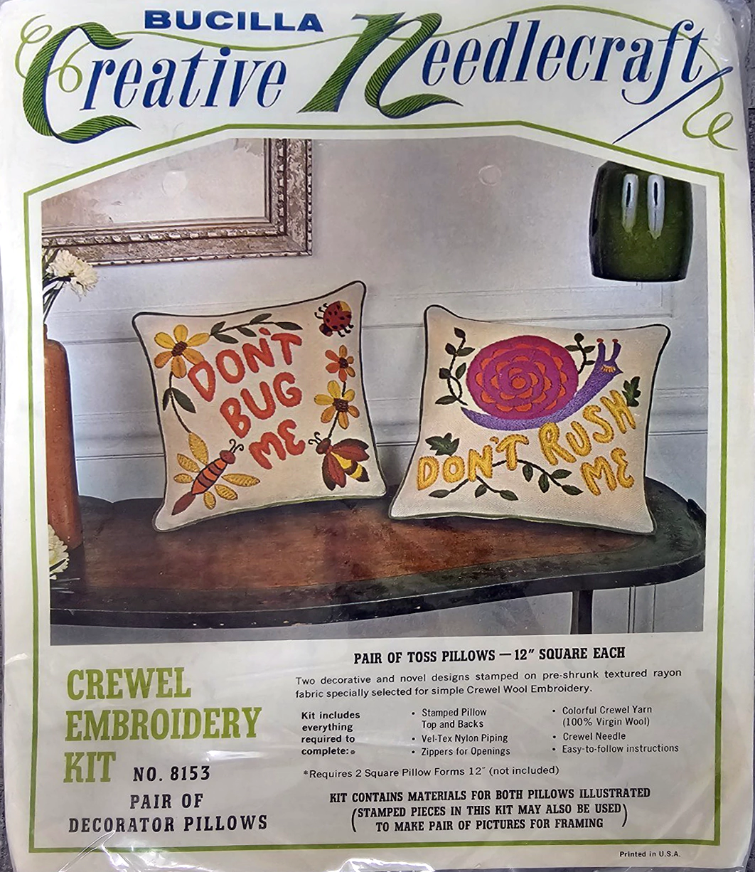 Novelty Pair 8153 Crewel Embroidery Kit, pair of decorator pillows. “Don’t Bug Me” and “Don’t Rush Me” (Bugs & Snail designs)