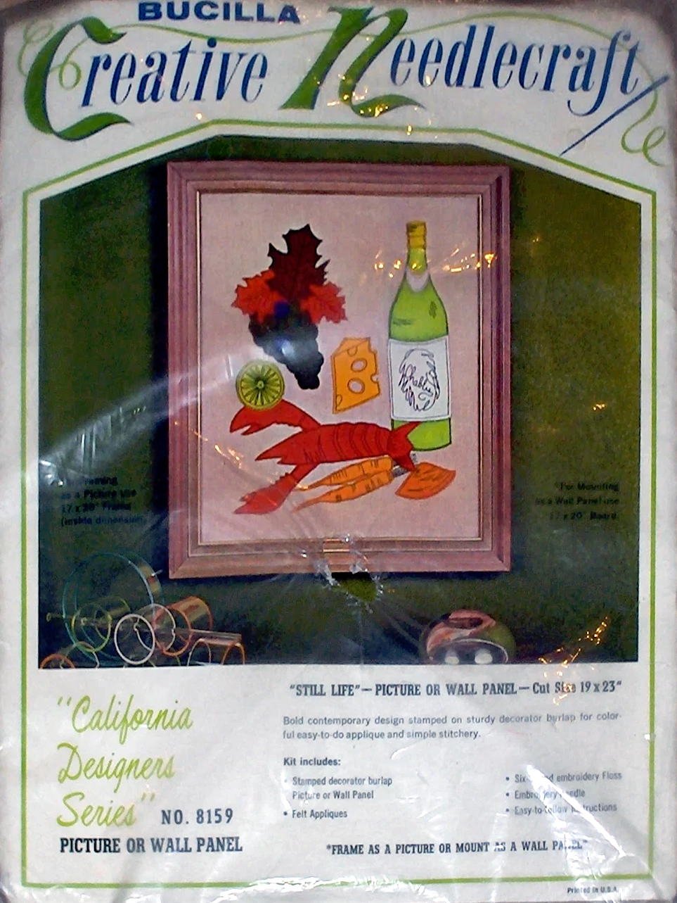 Still Life California Designers Series 8159 (wine and lobster design) Crewel embroidery kit.