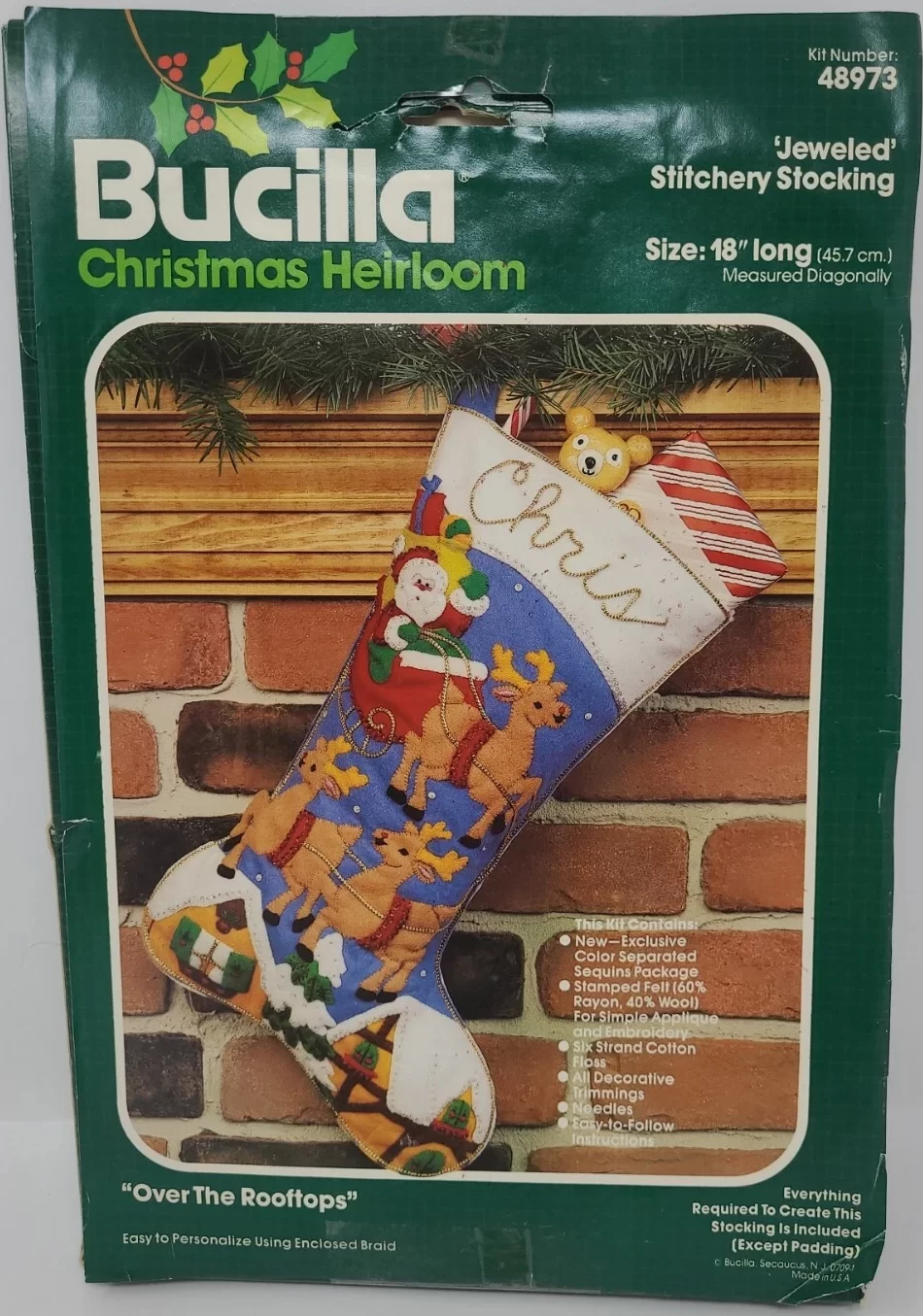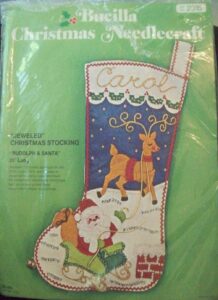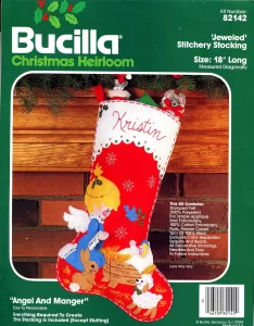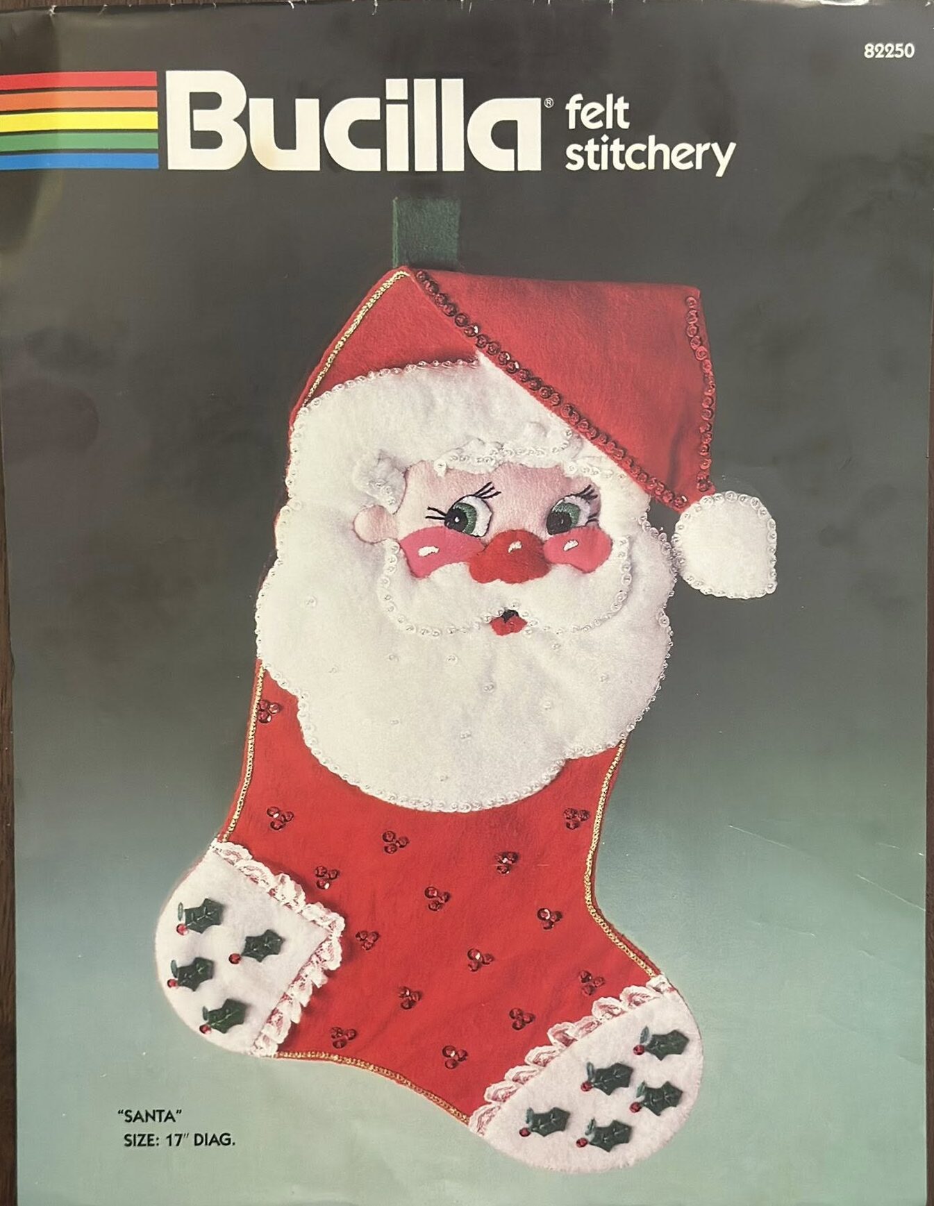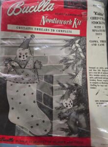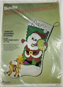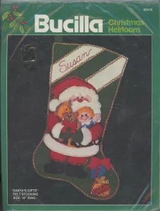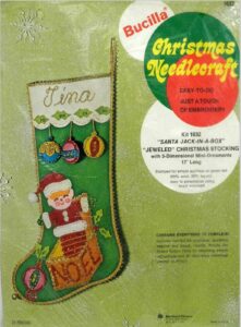 This style was run in parallel with the Christmas heirloom packaging with green backgrounds (and/or was discontinued mid-year). It has a dark green to light green gradient background, a rainbow next to the bucilla logo and says “felt stitchery” at the top. For stockings, mainly 1986. Dates are on the instruction sheets, often are centered on the bottom of the last page, in the format X/90/AH where there may be various initials before and after the year. |
