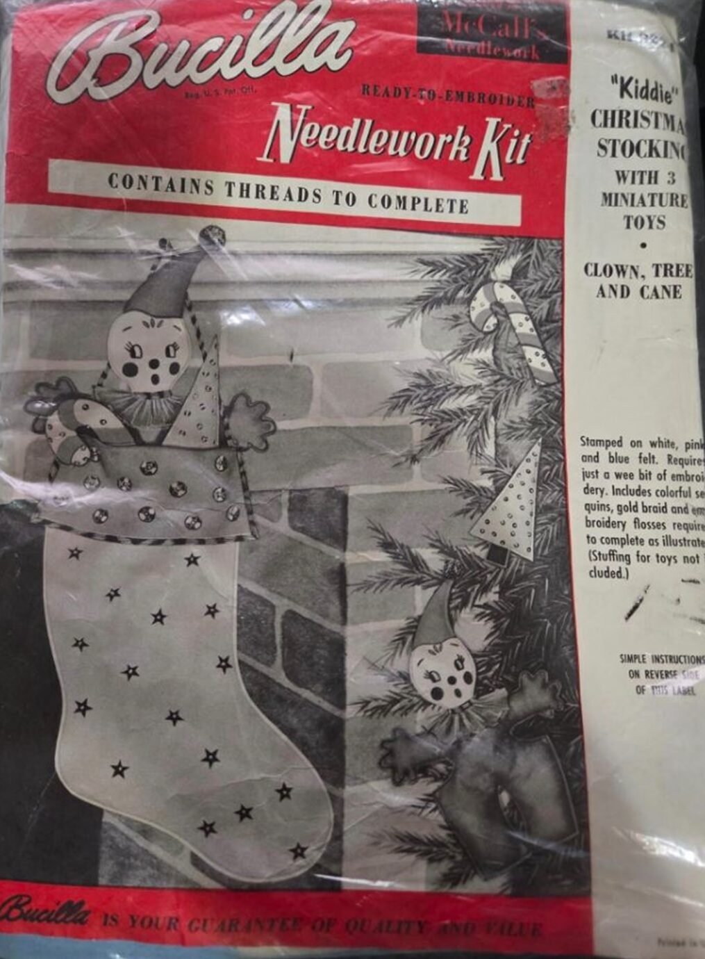 Black and white photo. Bucilla logo diagonal on top left. Kit information on right side of page (usually) on white background. Red background on left side of page. |