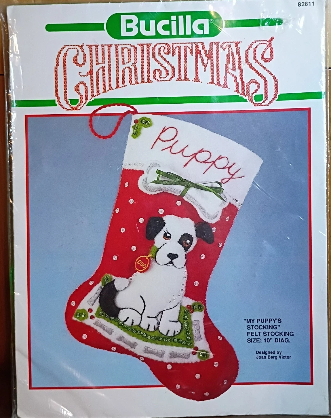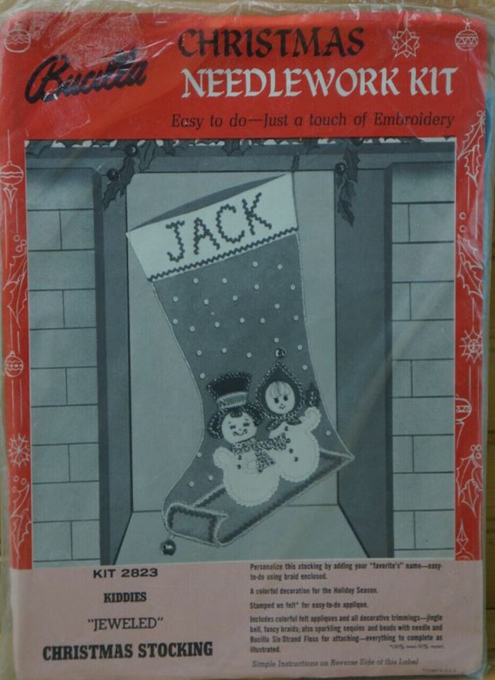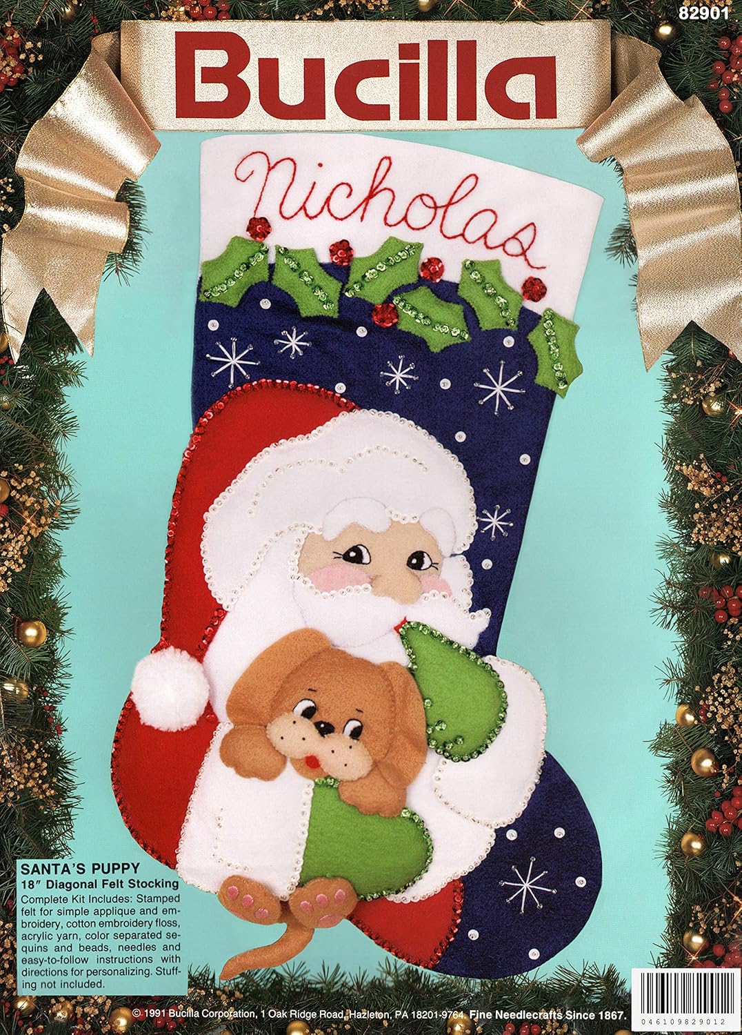 Bucilla Christmas Needlecraft diagonally on top. Typically tan background, occasionally light green (if kit is primarily white felt on edges). Has thin green border around page with white edges |