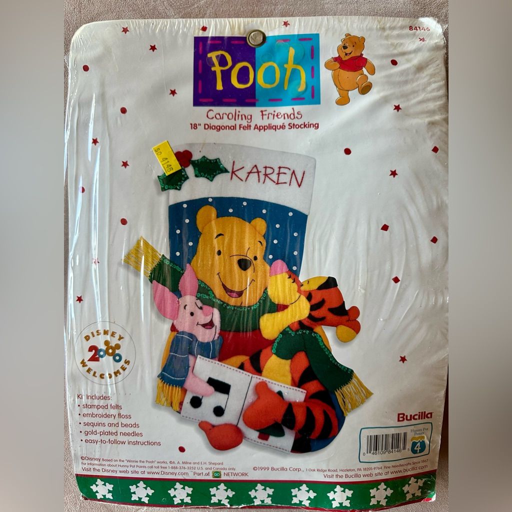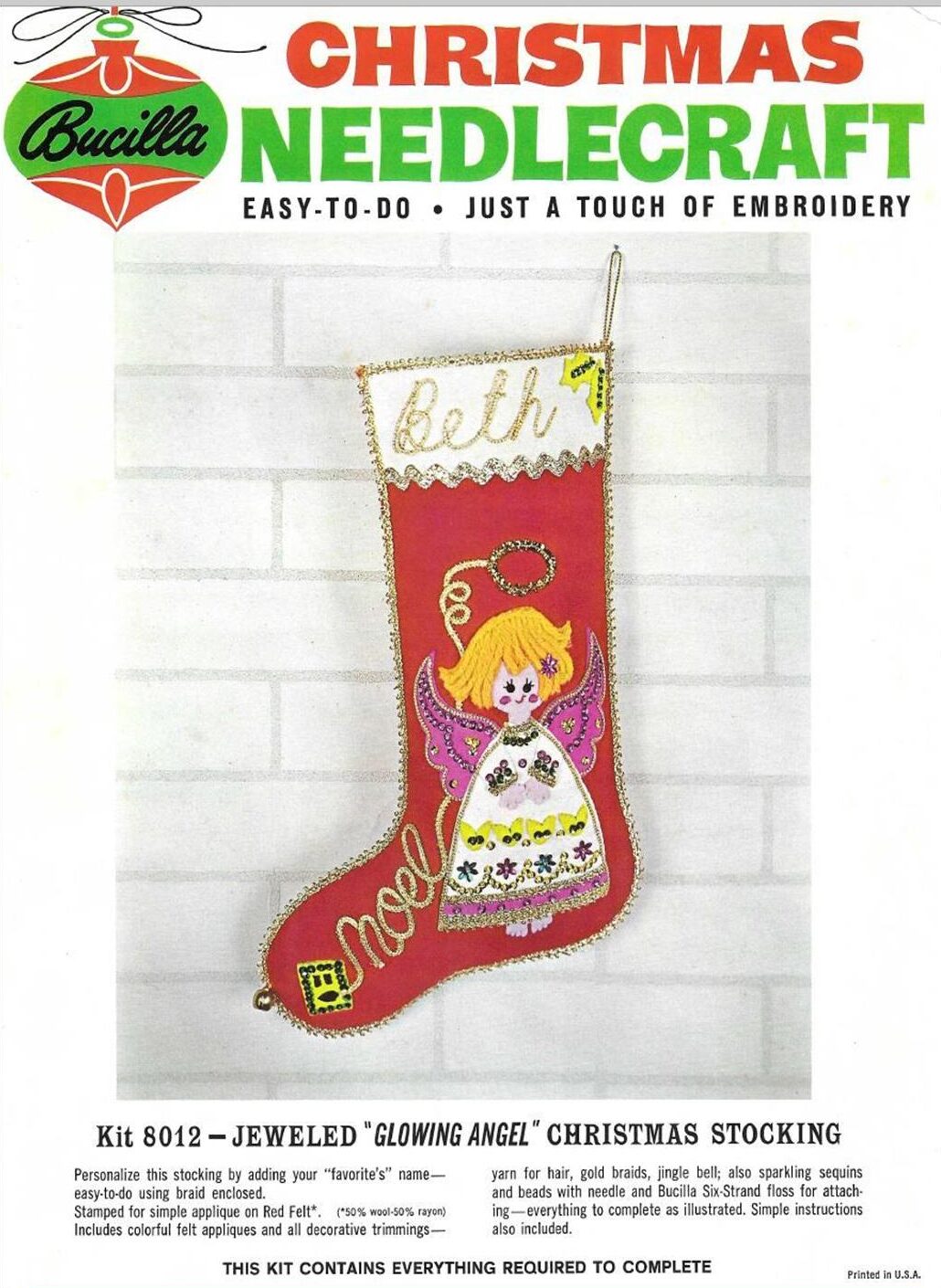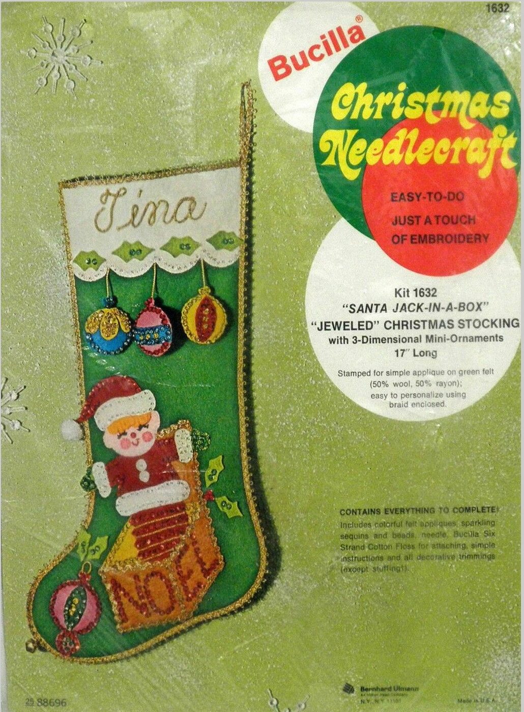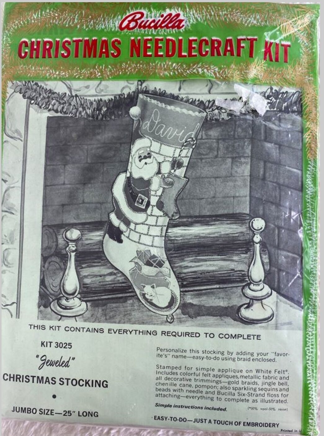 Bucilla Christmas Needlecraft diagonally on top. Typically tan background, occasionally light green (if kit is primarily white felt on edges). Has thin green border around page with white edges |