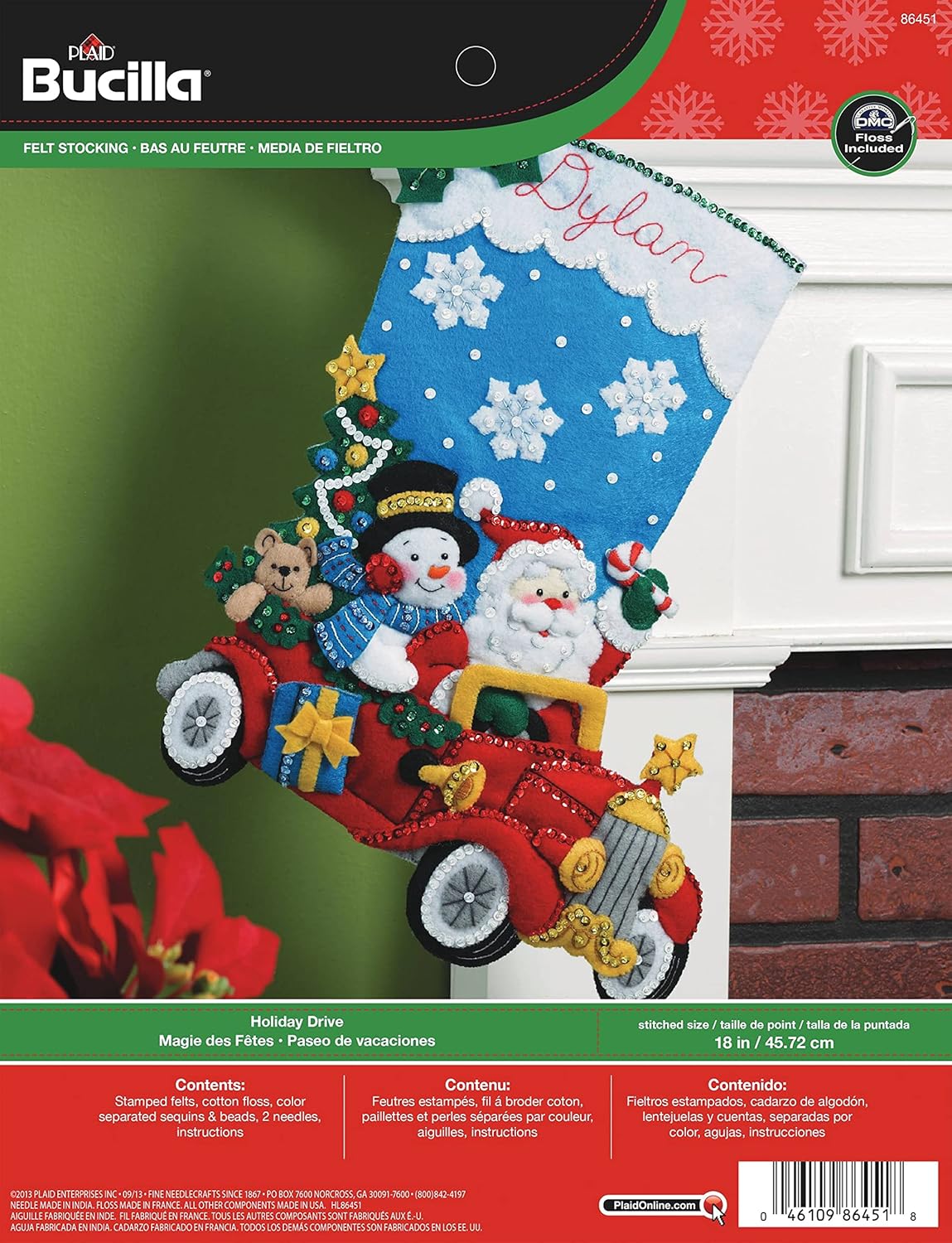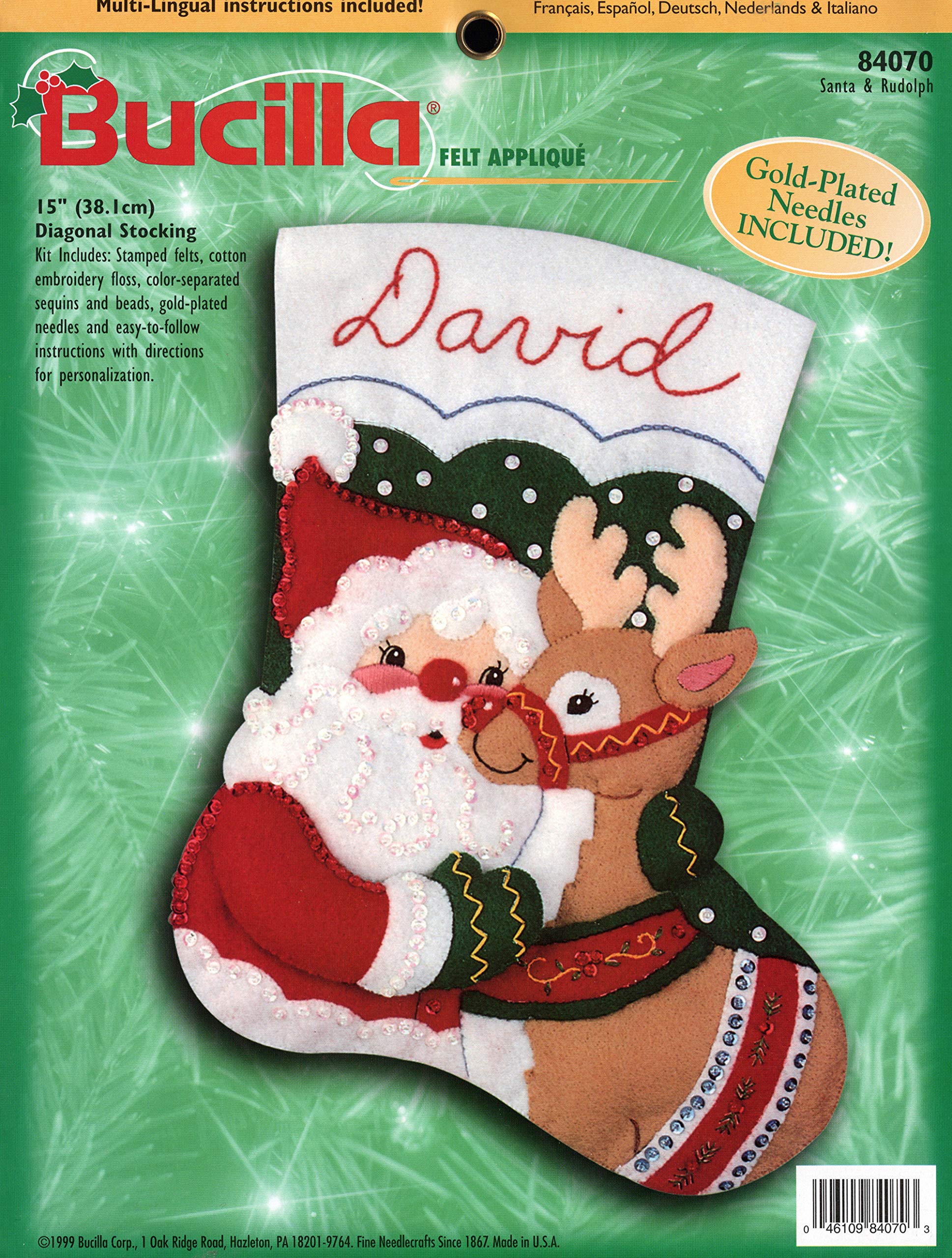 Red and green shadowy fabric in background (red on bottom). Plaid Bucilla logo small, top left. year printed on front of kit. |