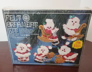 Santas | 3137 | 1978 | Felt Ornament Kit. Contains printed felt patterns, ribbons, etc. |